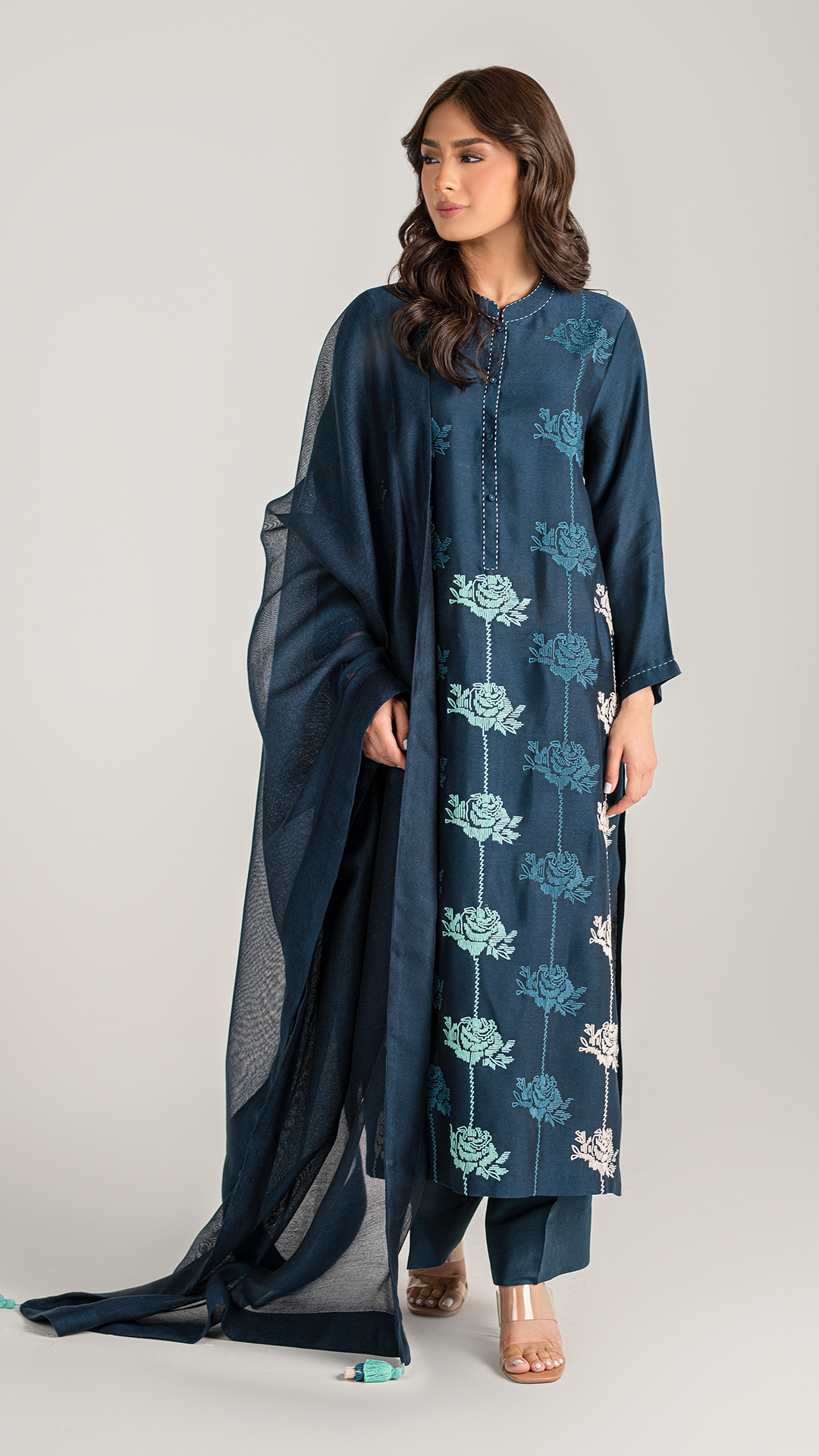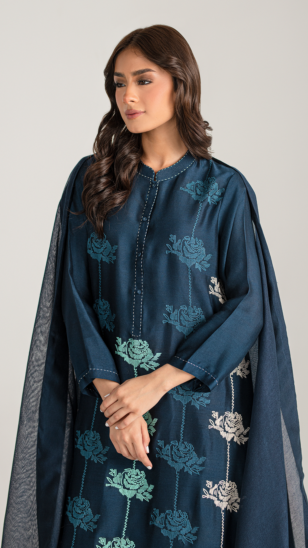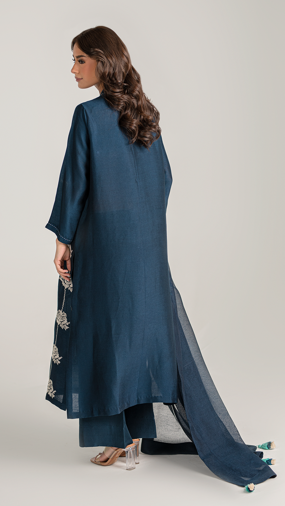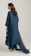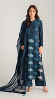 With our 'Teal Treasure', subtlety meets sophistication. This vibrant teal cotton net creation boasts delicate hand-embroidered accents that sparkle like gems. Paired with a matching dupatta and your choice of breezy cotton net or luxurious raw silk culottes (sold separately), this ensemble is a steal.
