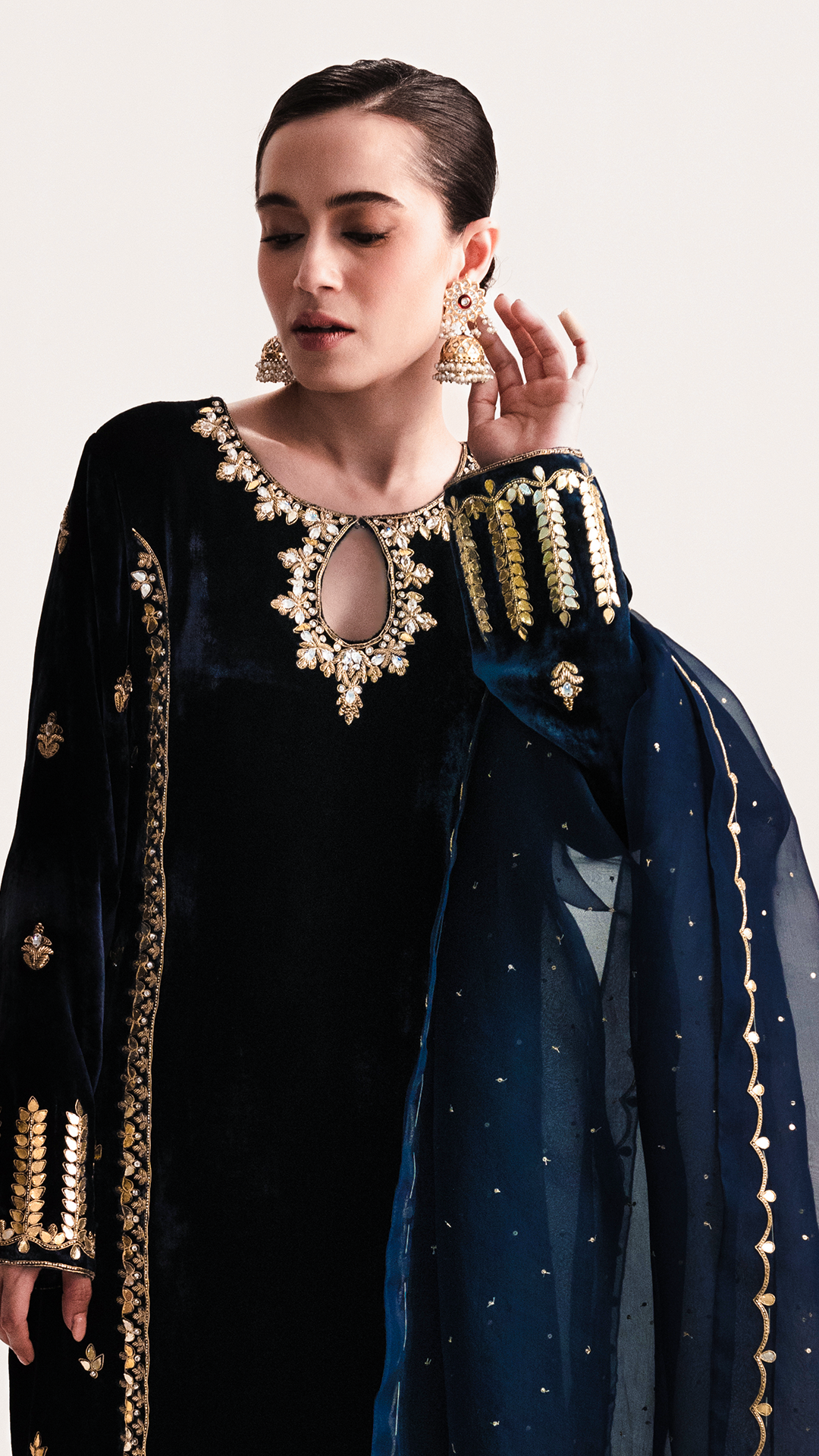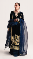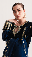 Dive into the festivities with this long navy blue velvet shirt, intricately embellished with silver & gold gotta work with zardozi. Pair it with matching silk crushed sharara and an organza dupatta featuring delicate gota detailing for a regal look