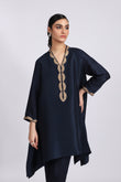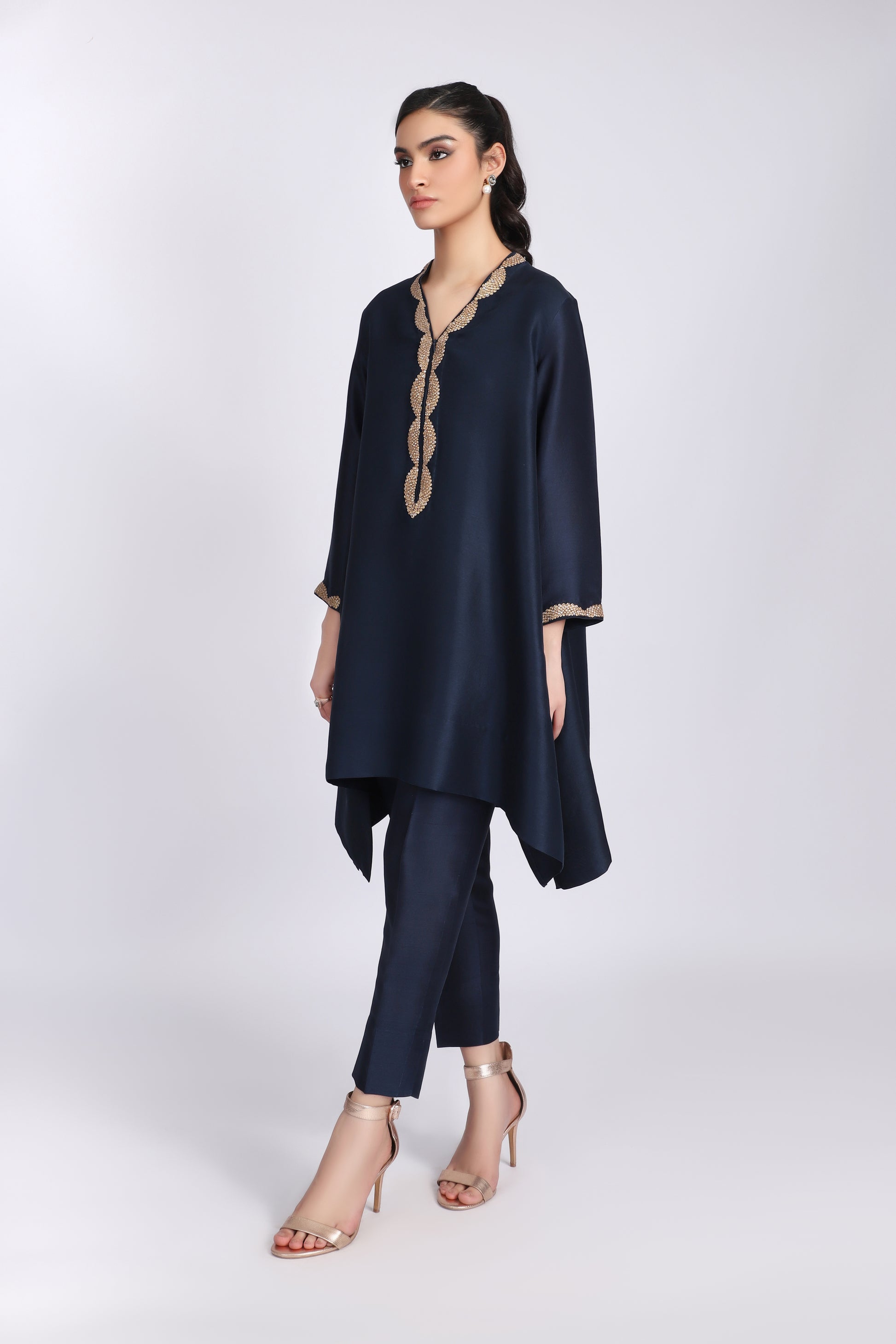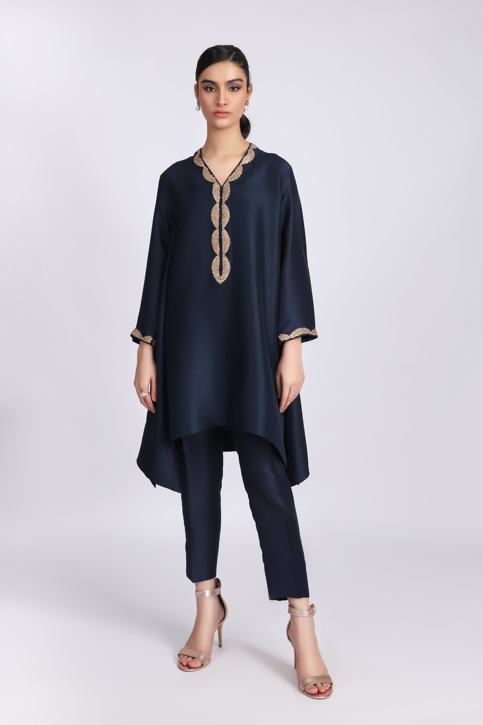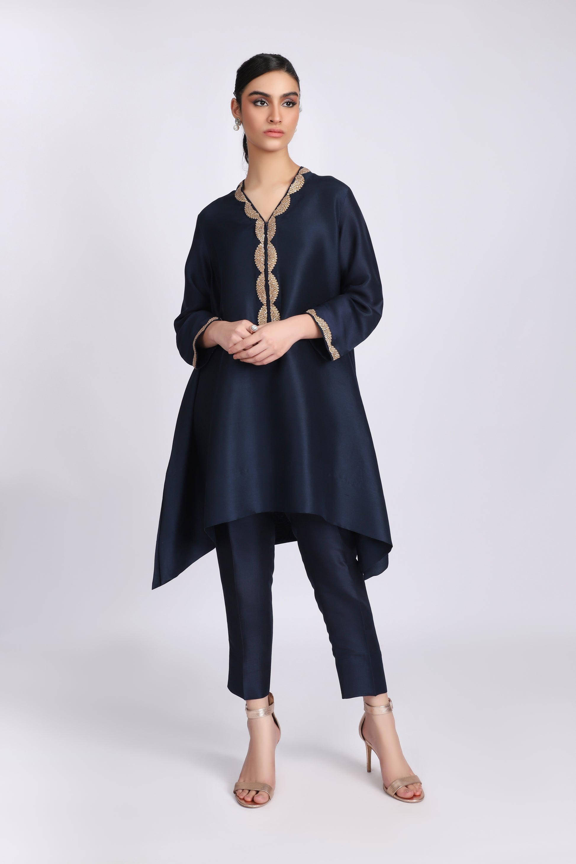 A midnight sky-hued raw silk kameez that features a statement neckline and sleeves with gold sequins and zardozi, this is the perfect functional formal wear that can be paired with matching custom lowers to elevate the appeal.