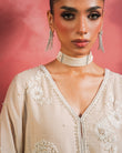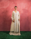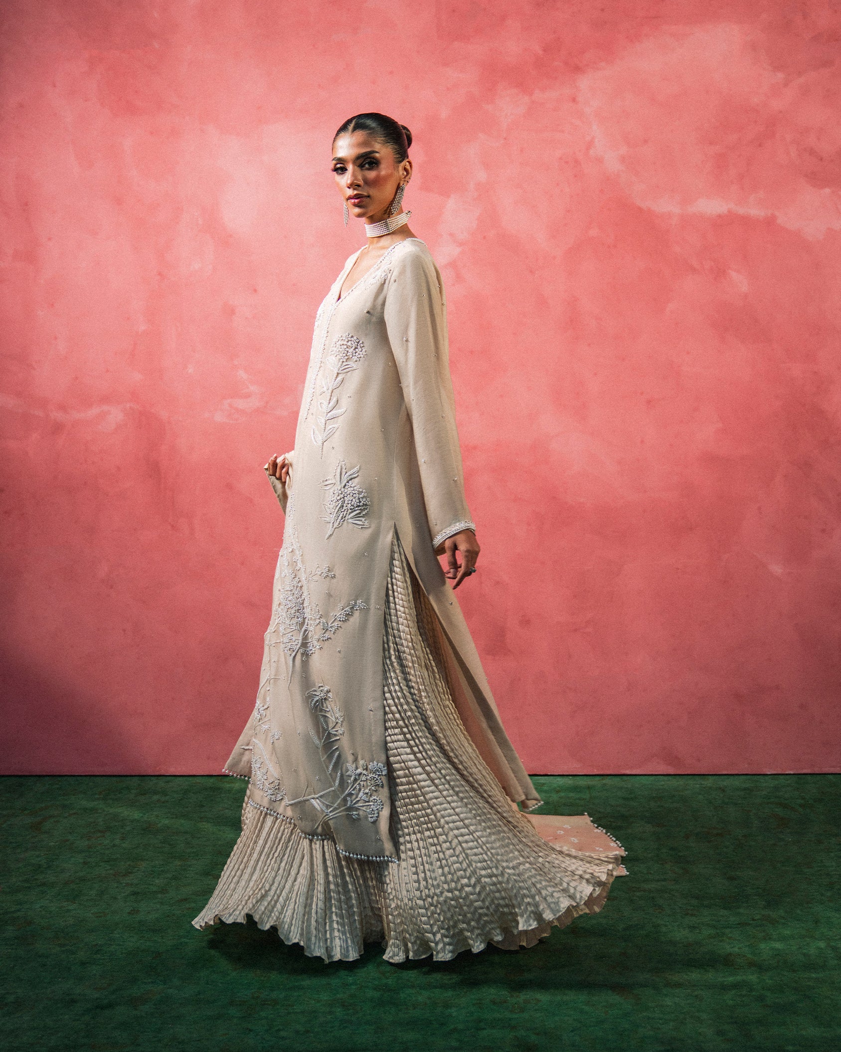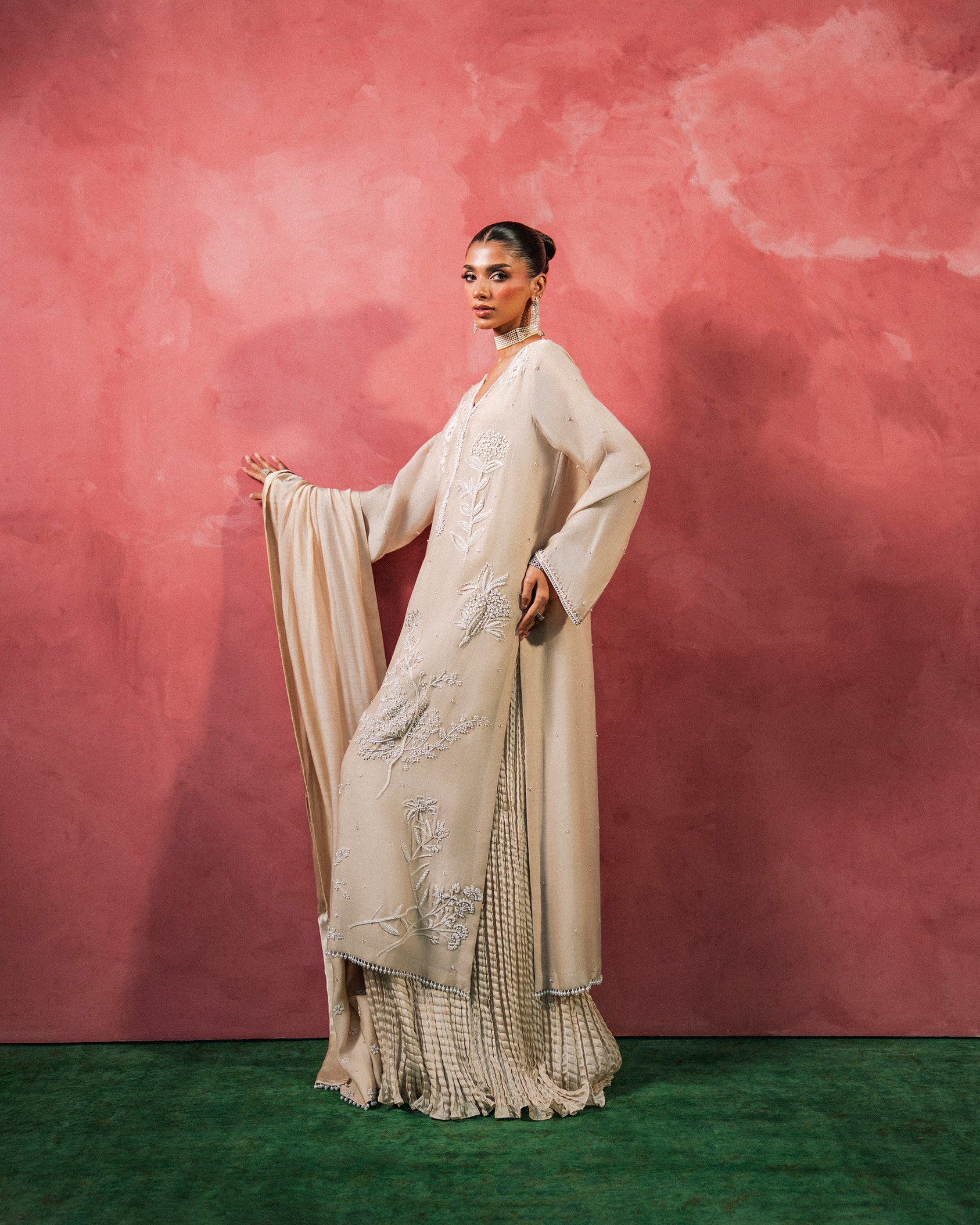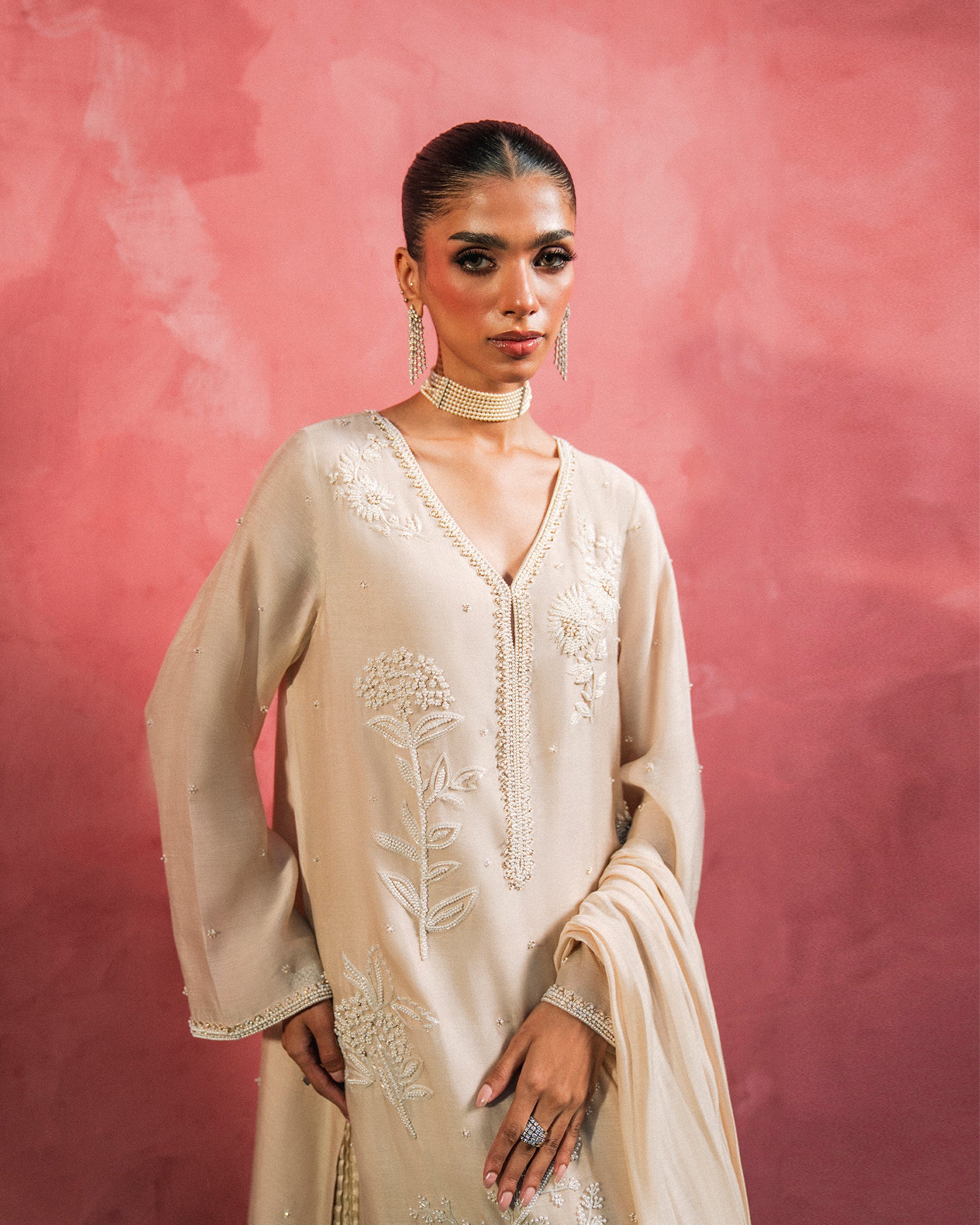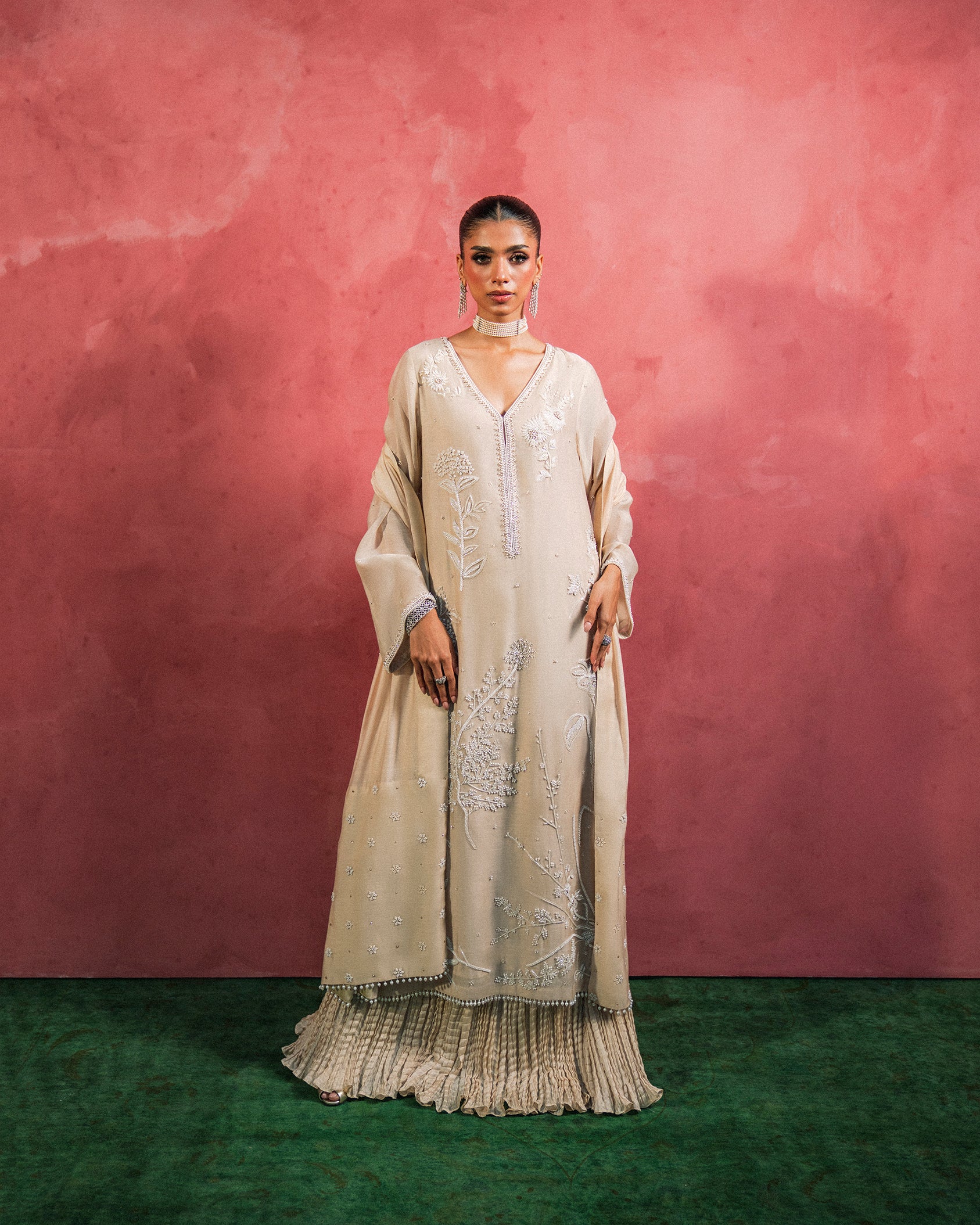 Crafted in refined organza, this sandy silk bodice and dupatta flows effortlessly alongside chamois silk bottoms. Adorned with delicate silver-thread artistry, the ensemble balances subtle finesse with refined ease.