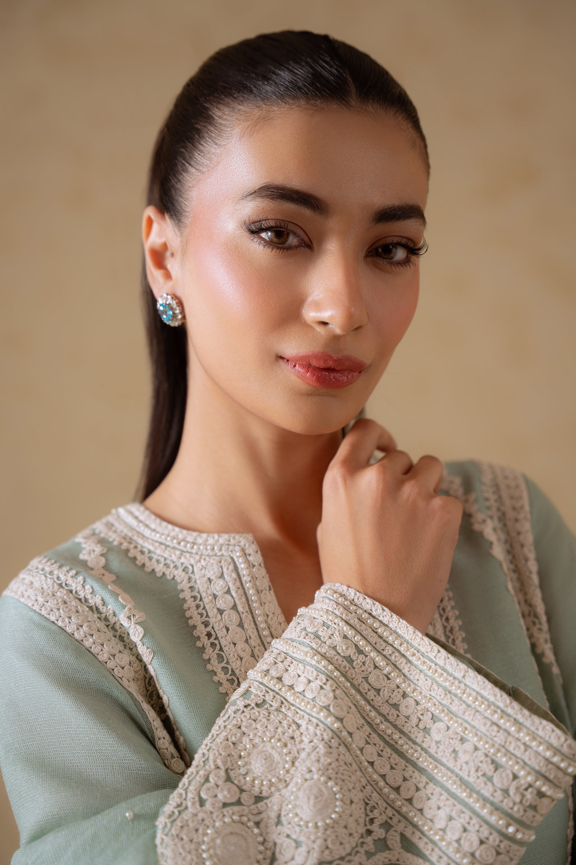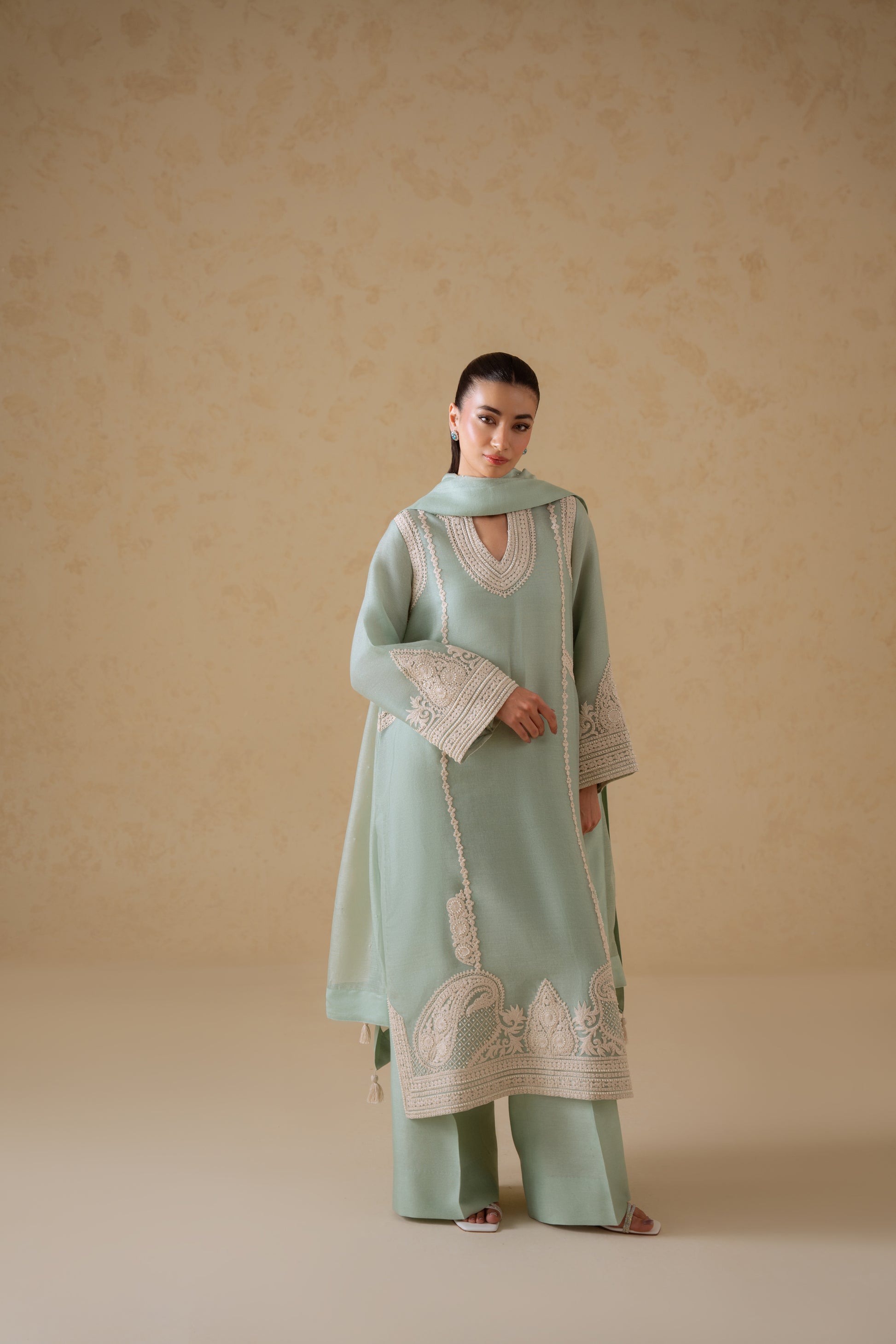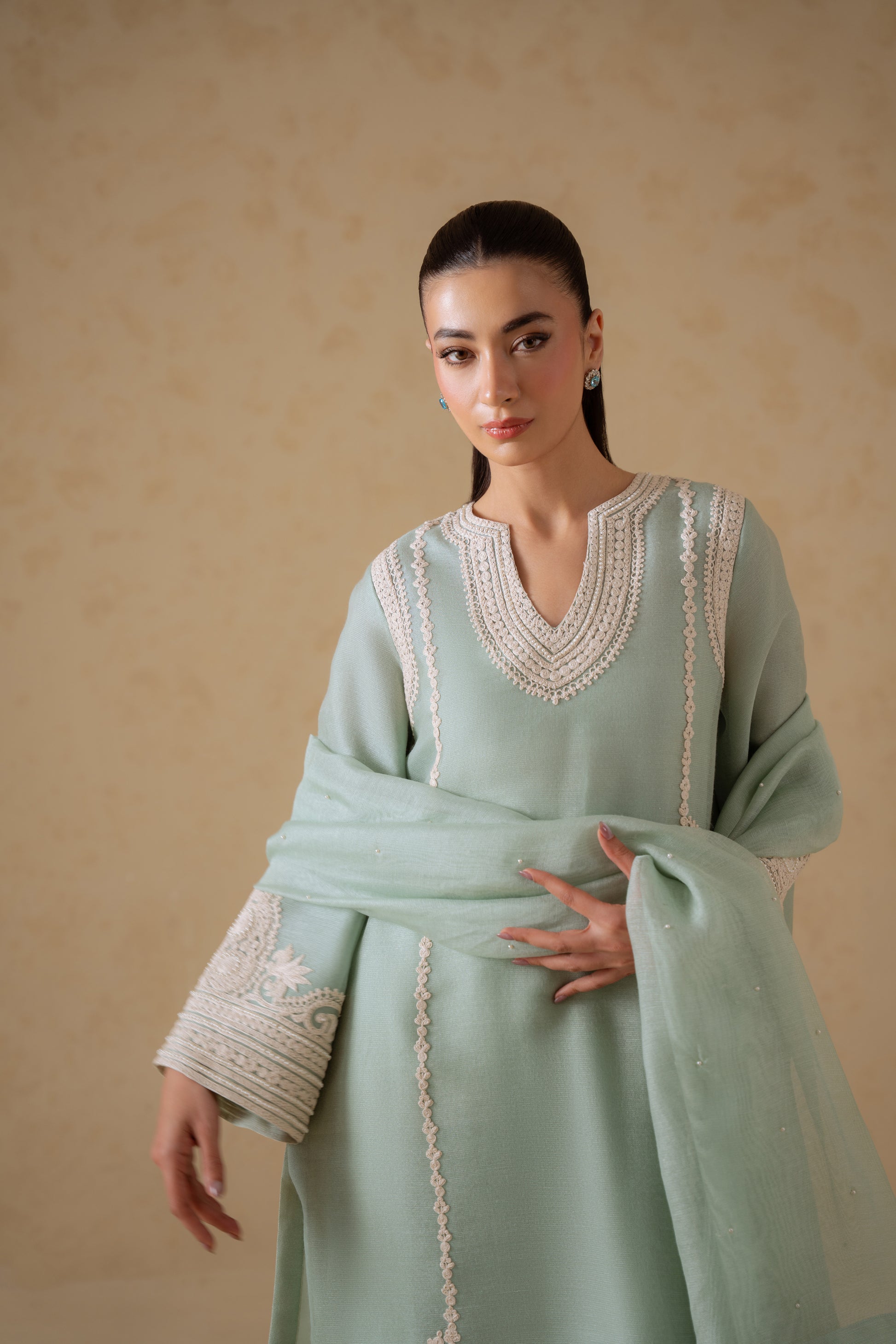A refined ice blue ensemble crafted in airy khaddi net, detailed with delicate embroidery and subtle pearl embellishments. The relaxed-fit long shirt features clean borders and a fluid drape, paired with matching pants for an elongated, modern silhouette. Finished with a lightweight khaddi net dupatta, this look feels calm, polished, and effortlessly elegant.