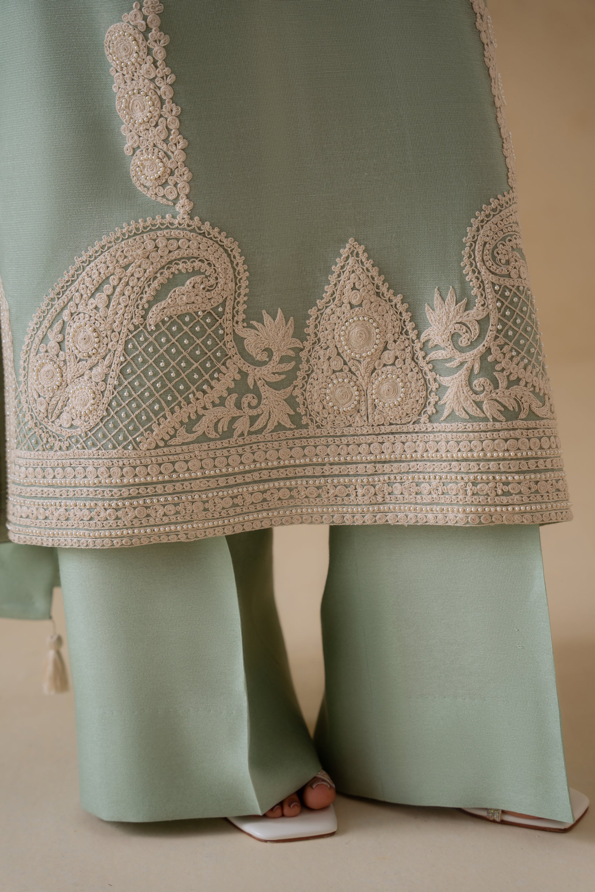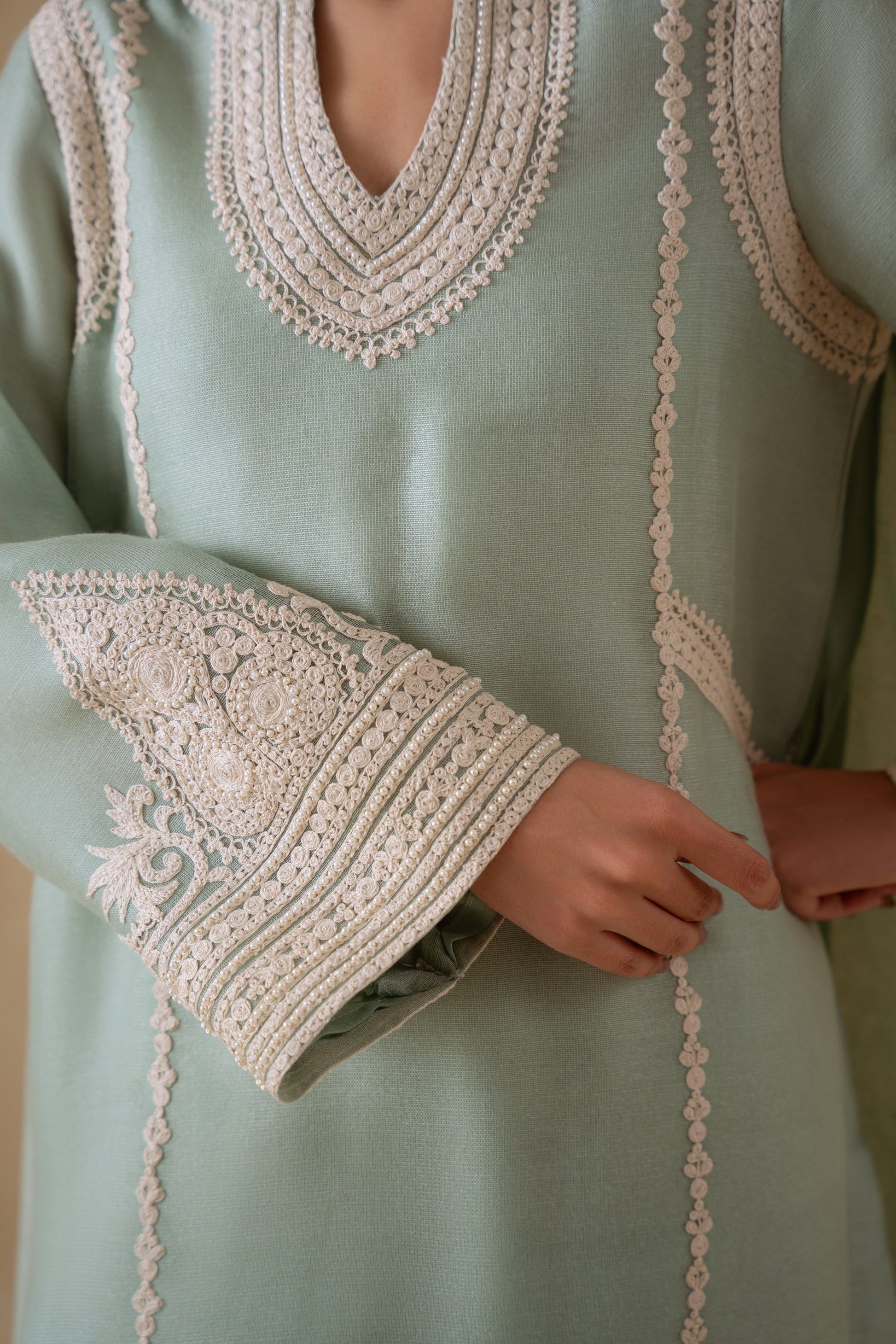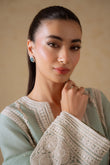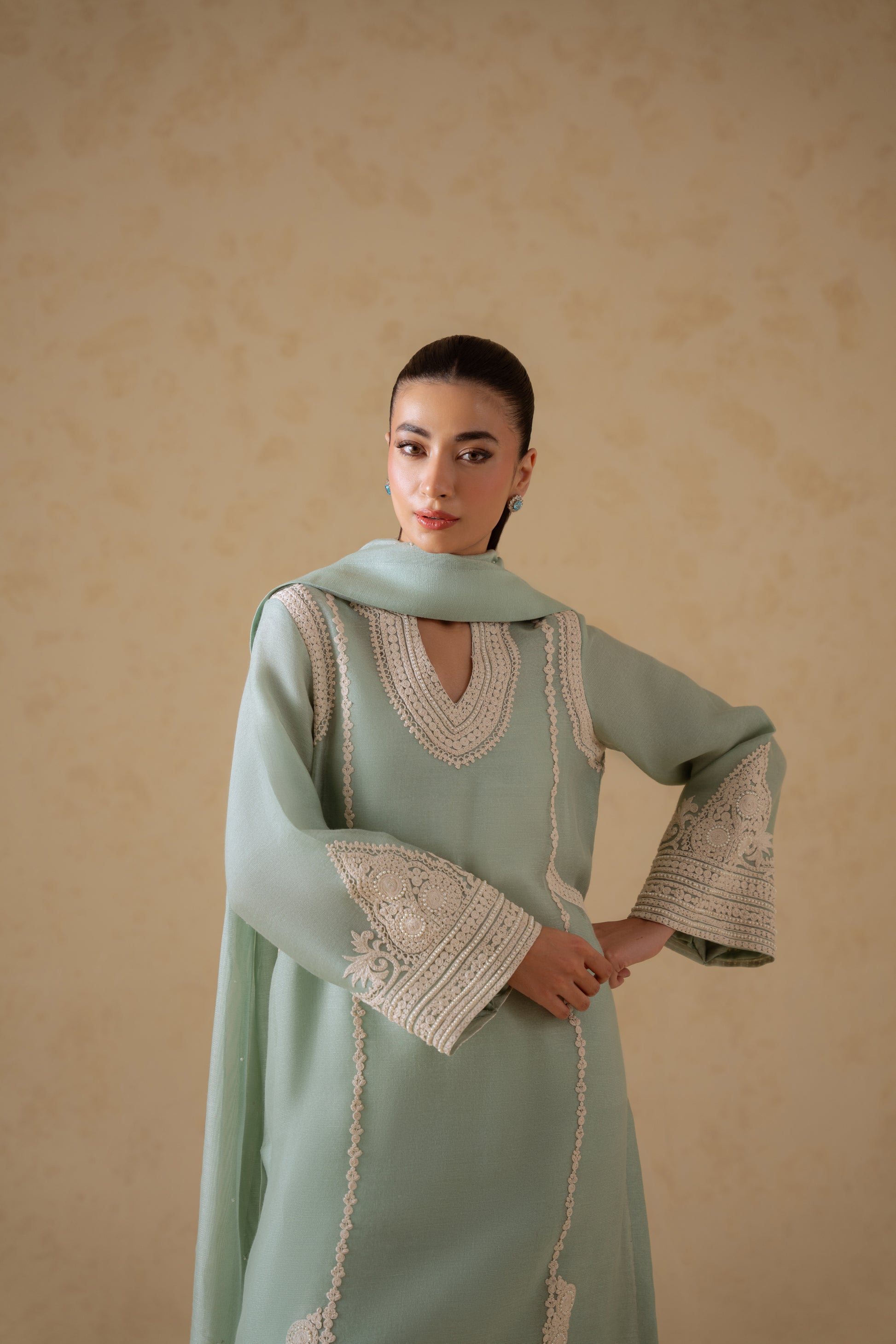 A refined ice blue ensemble crafted in airy khaddi net, detailed with delicate embroidery and subtle pearl embellishments. The relaxed-fit long shirt features clean borders and a fluid drape, paired with matching pants for an elongated, modern silhouette. Finished with a lightweight khaddi net dupatta, this look feels calm, polished, and effortlessly elegant.