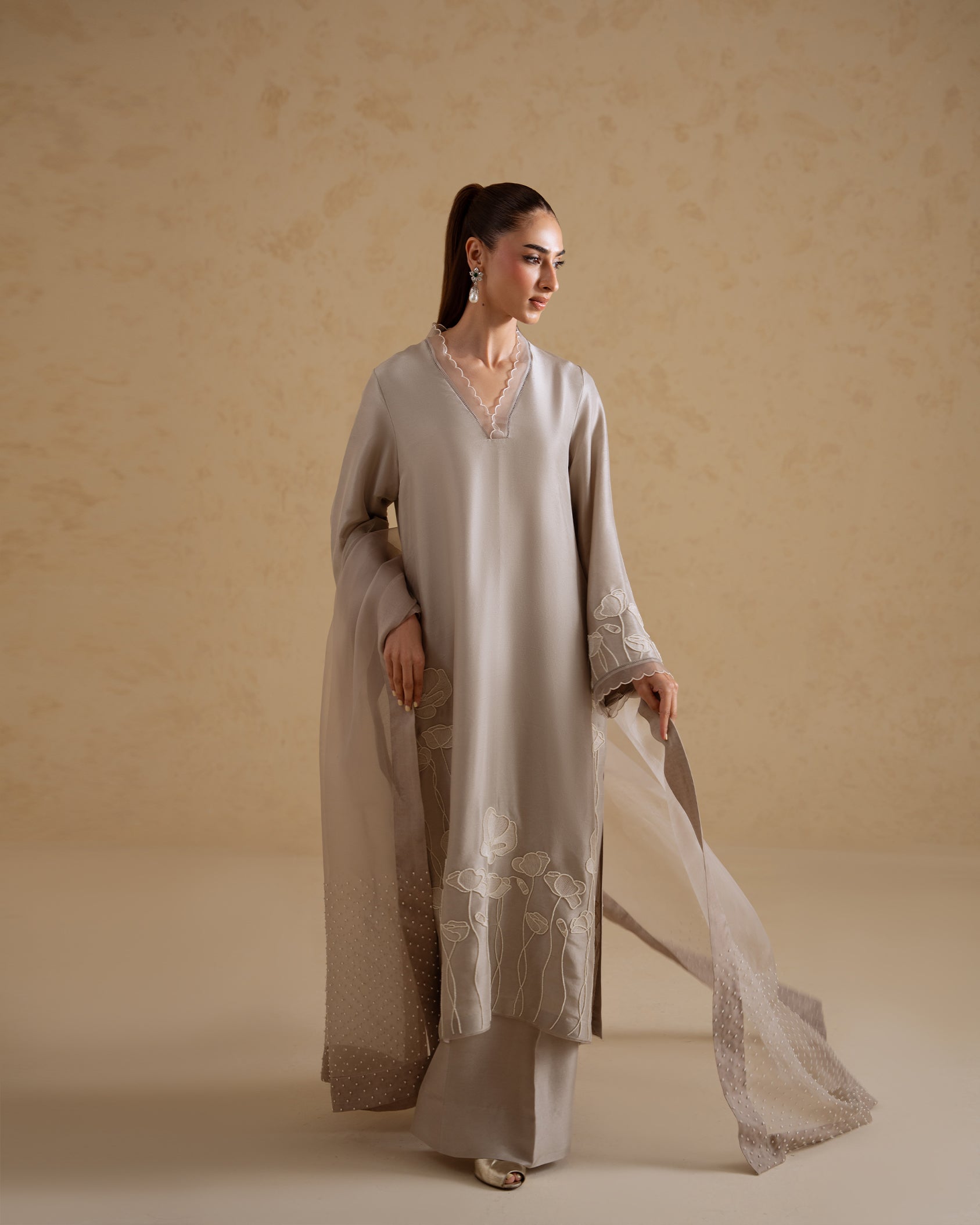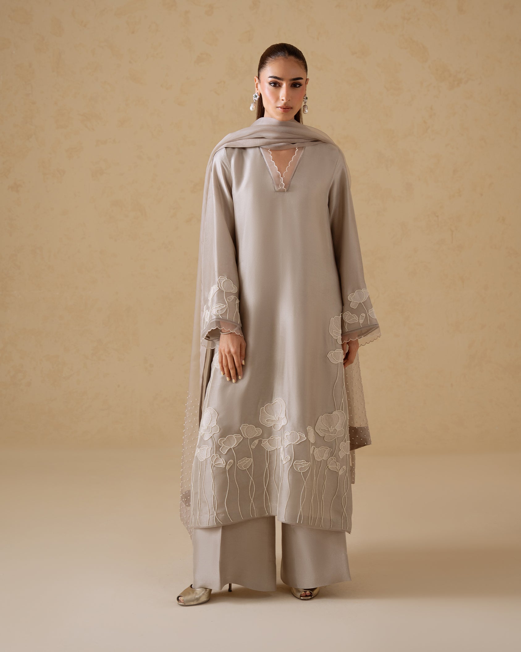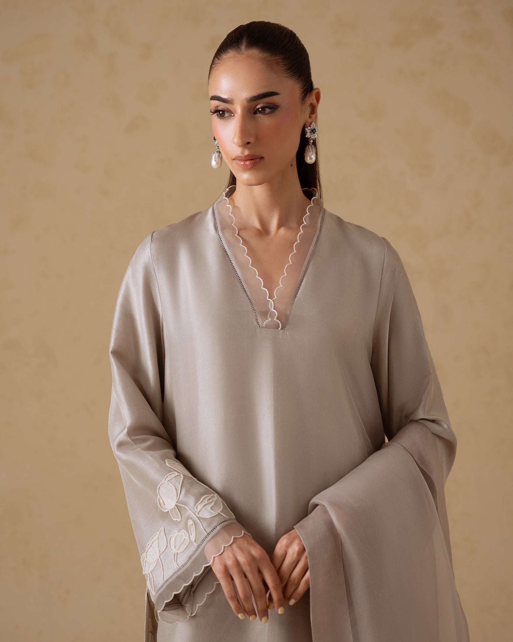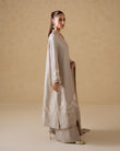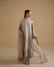 A refined stone-toned ensemble crafted in fluid raw silk, accented with delicate pearl detailing for a subtle, elevated finish. The relaxed-fit shirt features clean lines and soft movement, paired with matching raw silk pants for a streamlined silhouette. Finished with a sheer organza dupatta, this look is designed for effortless elegance with a modern edge.