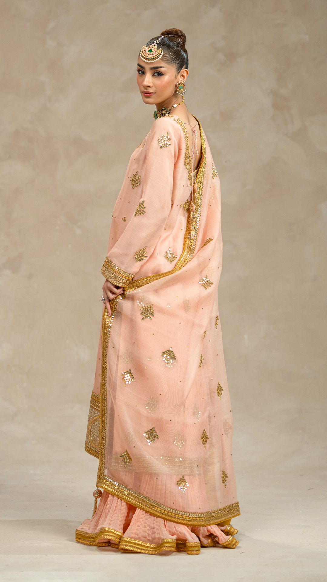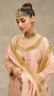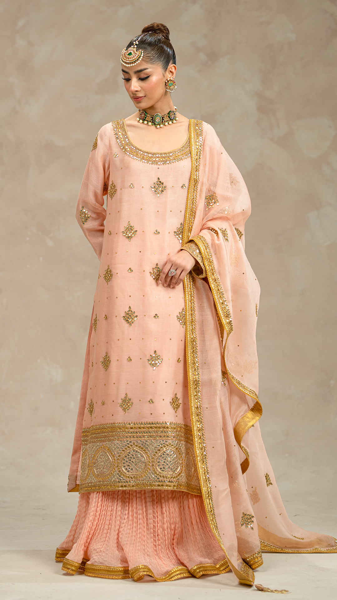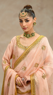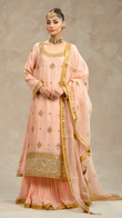 With 'Ardora', peach hues dance across a trio of khaddi net pieces - a gotta and tilla work shirt, crushed sharara, and dupatta.
