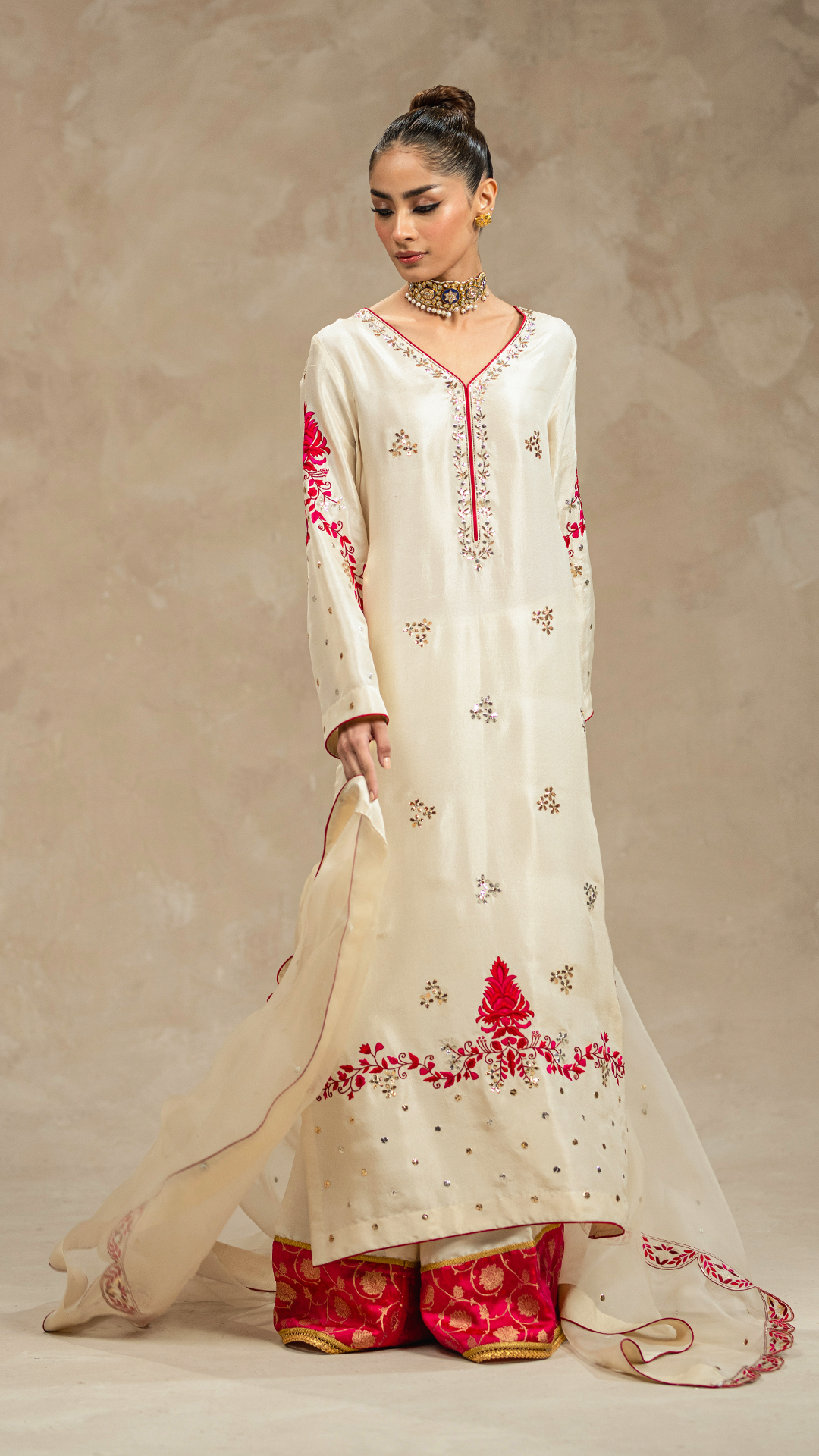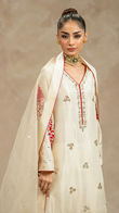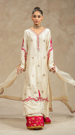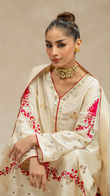 Behold 'Kairos', a sleek off-white ensemble where raw silk and organza intersect, showcasing a shirt, dupatta, and culottes with precision handwork, resham, and kamdani.