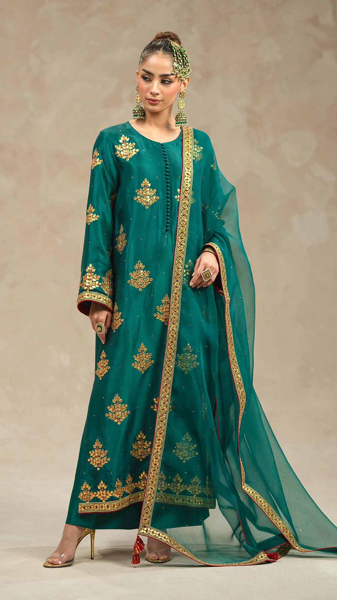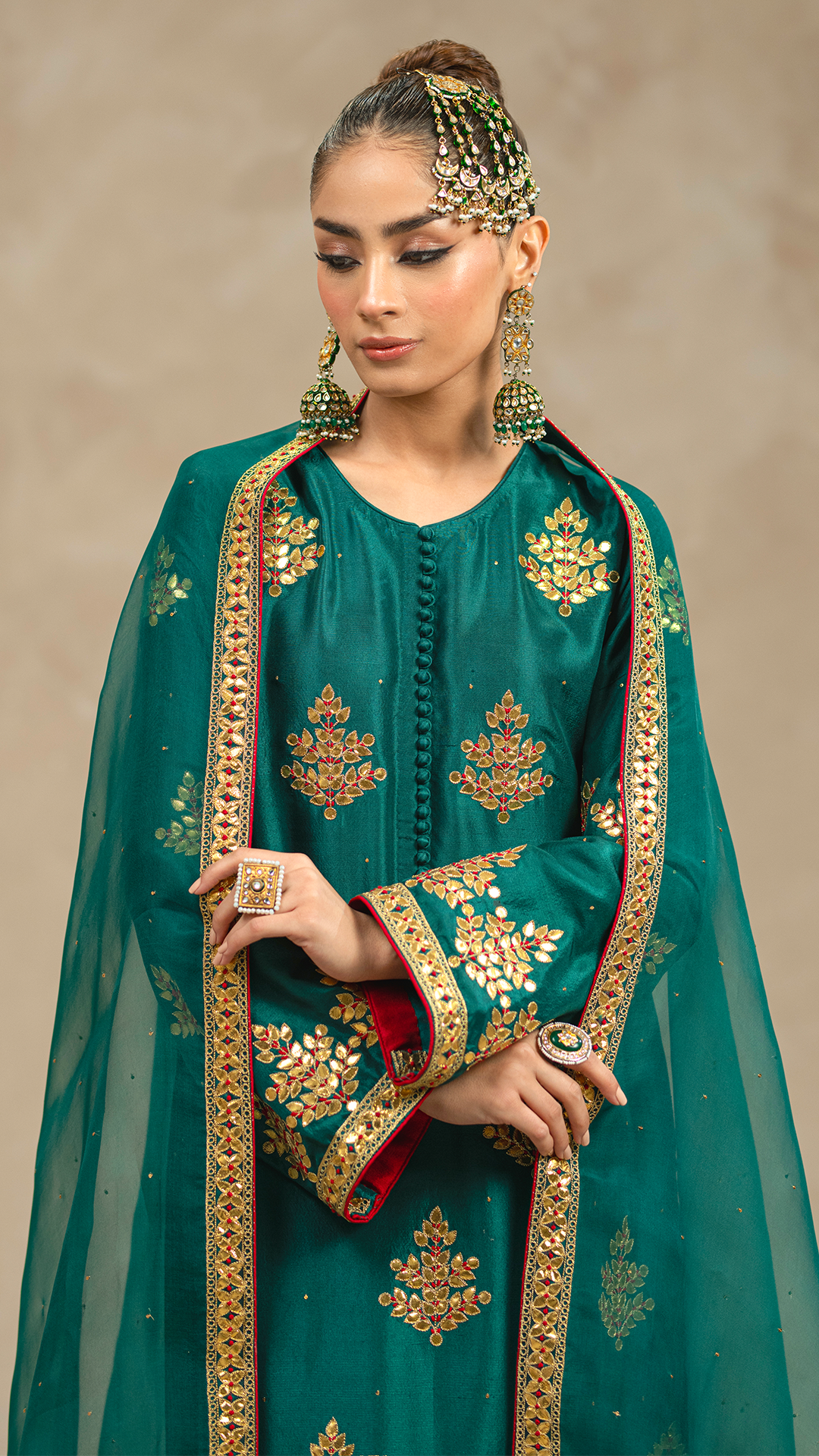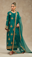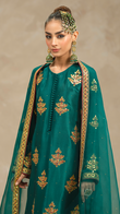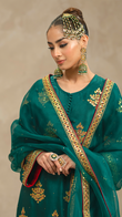 Unleash your inner goddess with 'Verdi', a vibrant emerald green three-piece ensemble that combines raw silk, tilla work, and gotta embellishments for a look that's equal parts fierce and fabulous.
