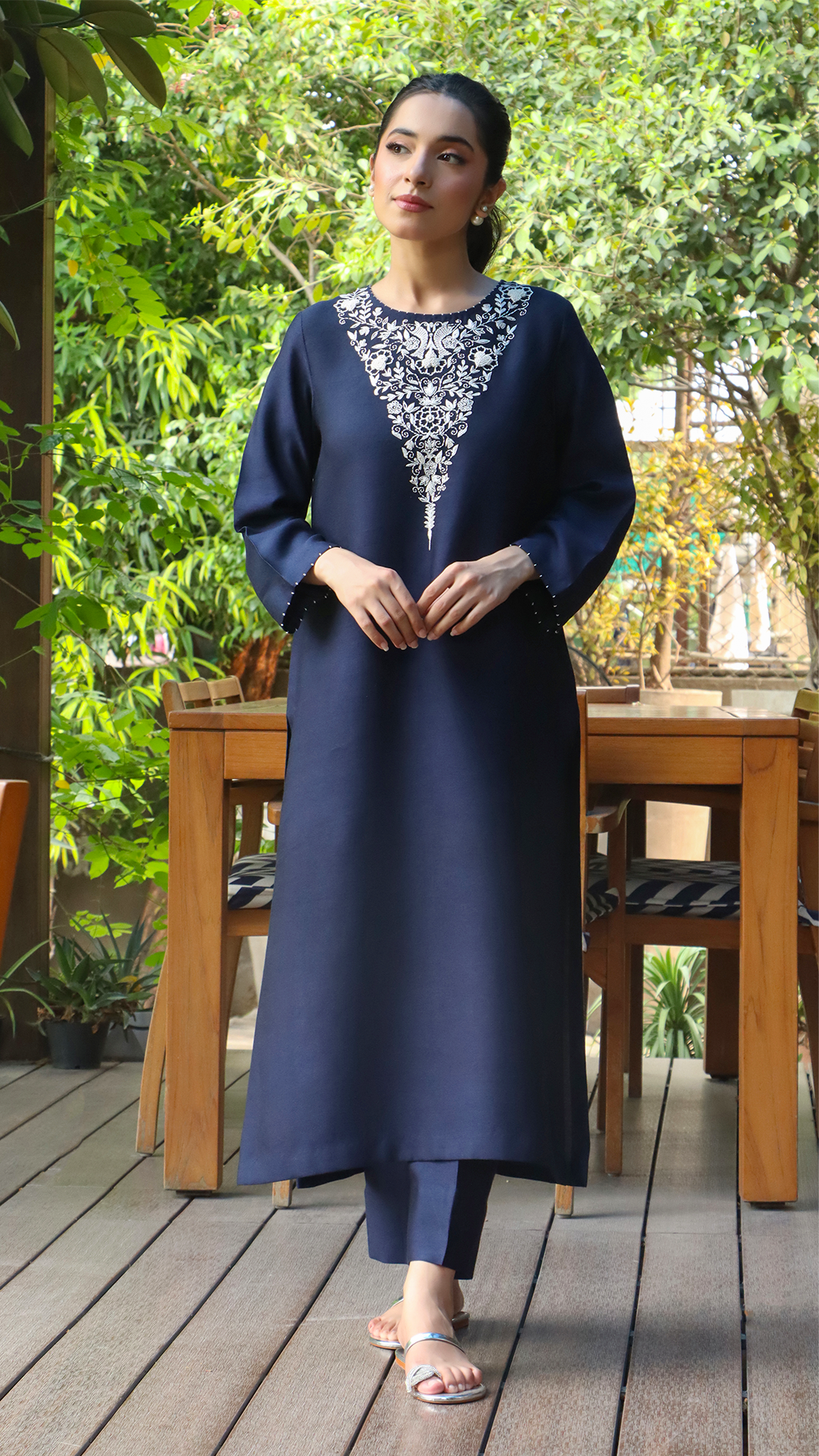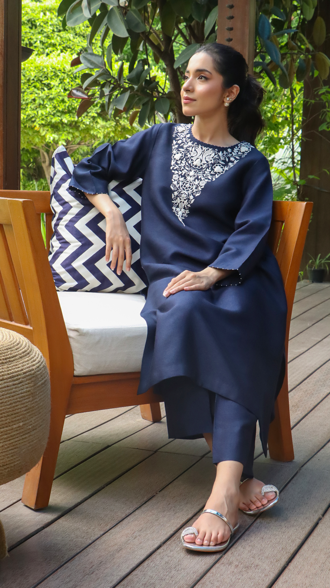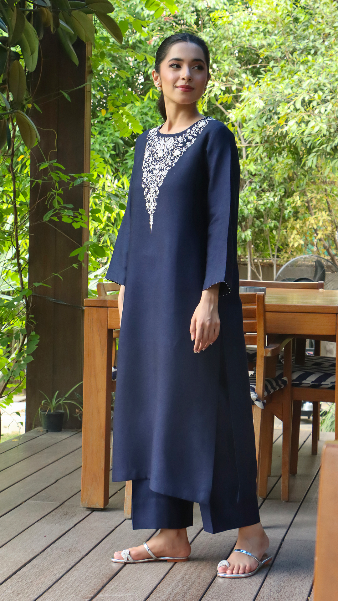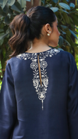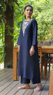 Introducing Kaiva, a teal shirt and culotte set woven from cotton net, adorned with intricate thread embroidery that shimmers like hidden jewels.