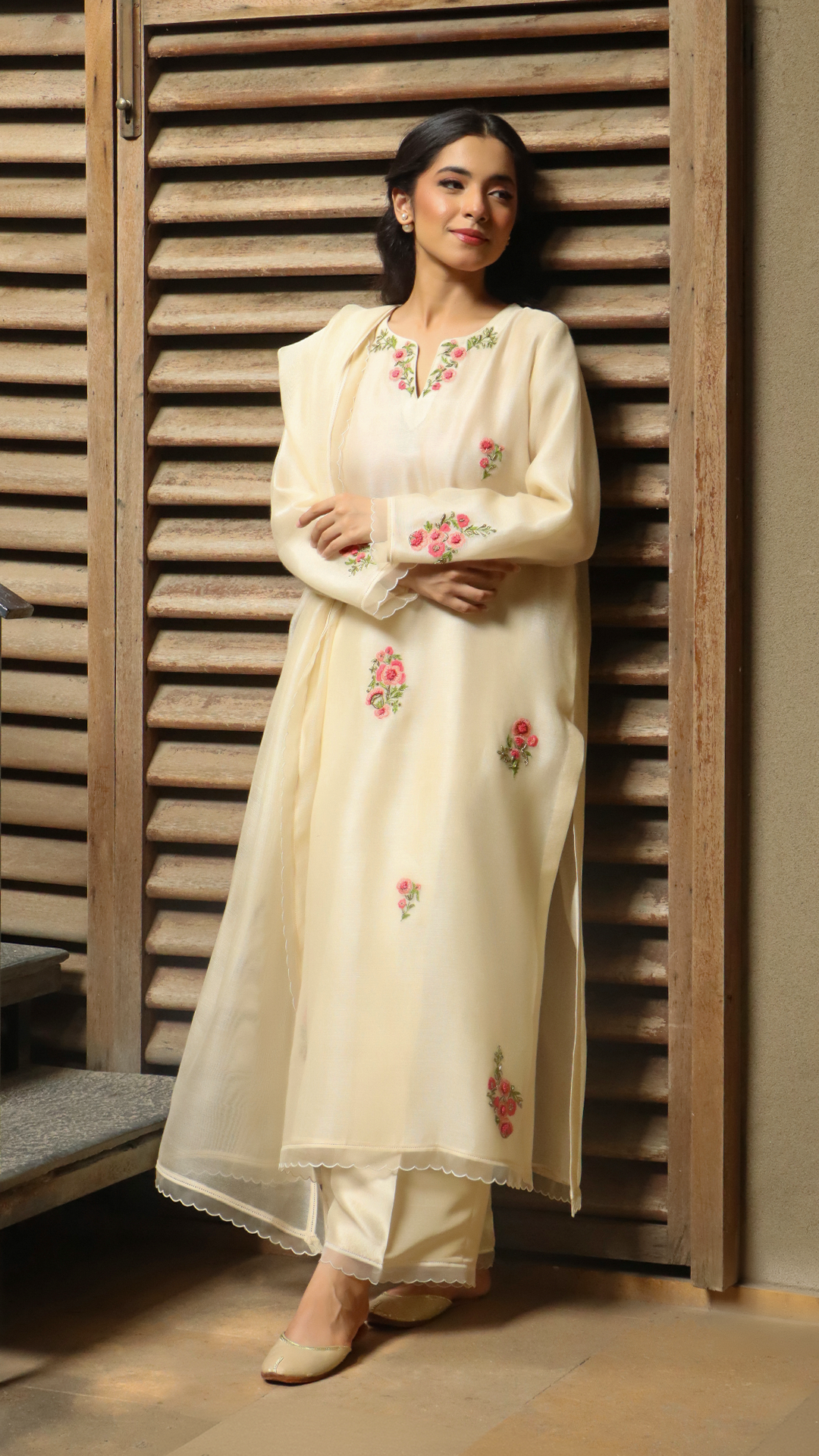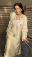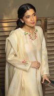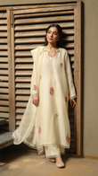 Timeless tales are woven into the threads of Kalindi, an off-white shirt and dupatta duo crafted from cotton net, featuring vibrant multi-color Resham hand embroidery that dances with every movement.