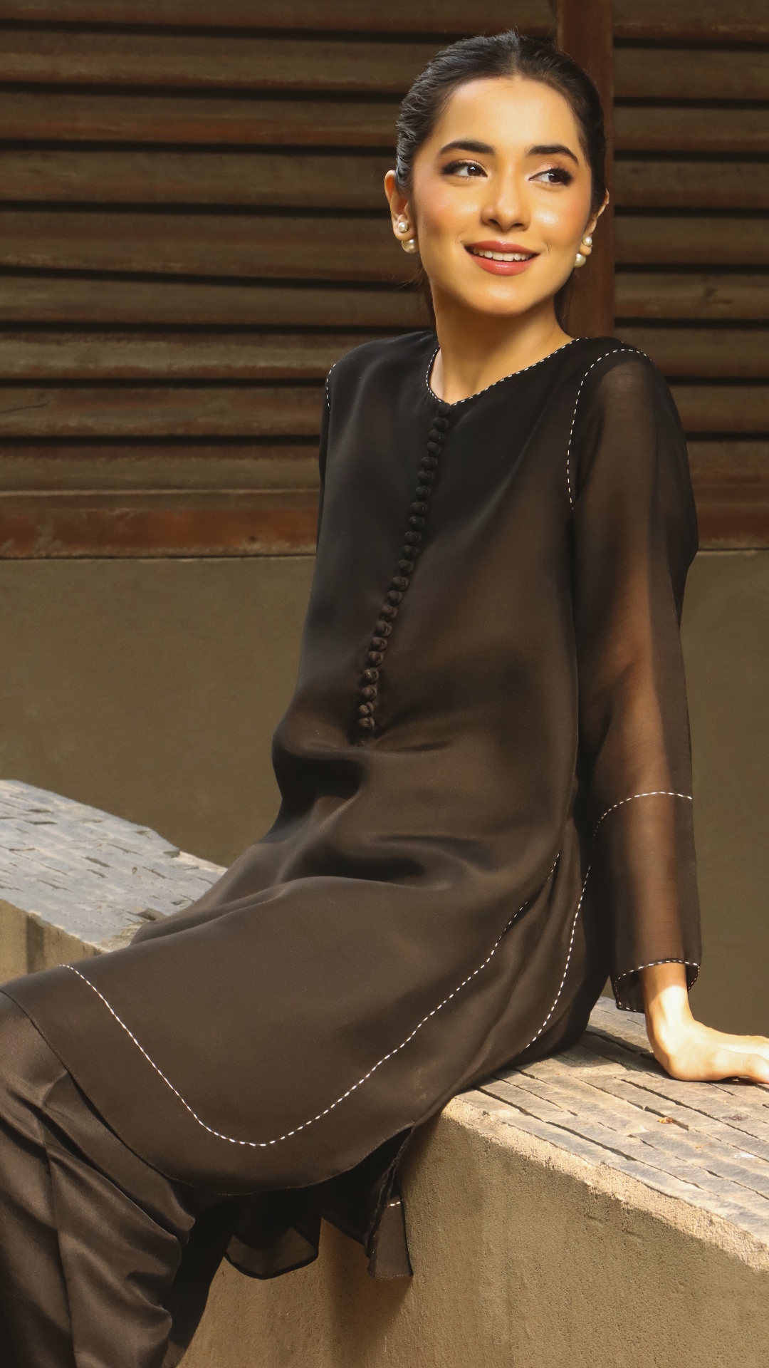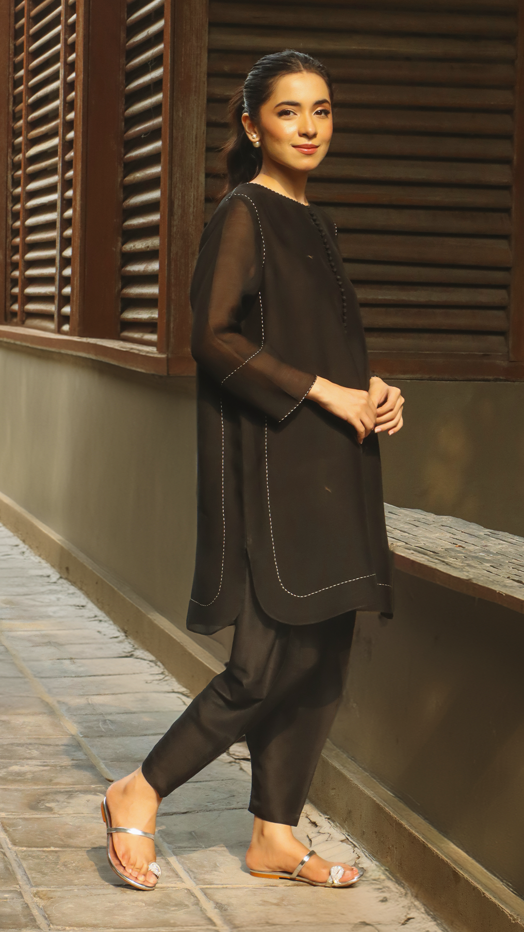 Be one of the first to shine in Nyx, a stunning black shirt made from paper silk.