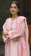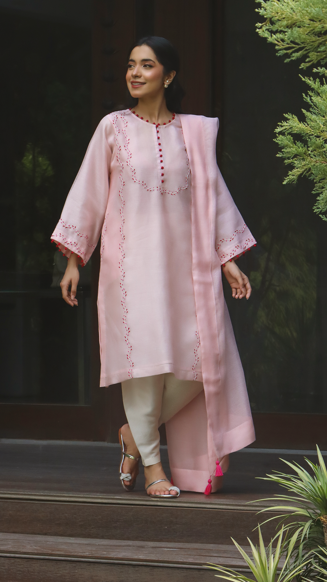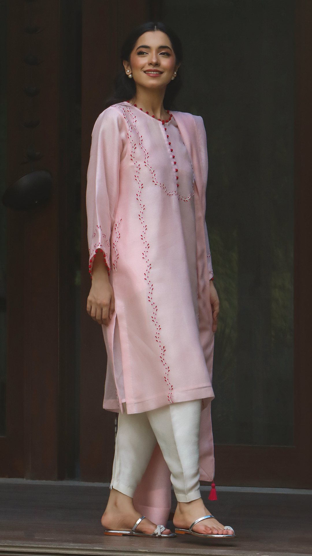 Enveloped in softness, Petaluma unfurls as a powder pink dream, with a cotton net shirt and dupatta adorned with intricate hand embroidery, whispering elegance with every fold.