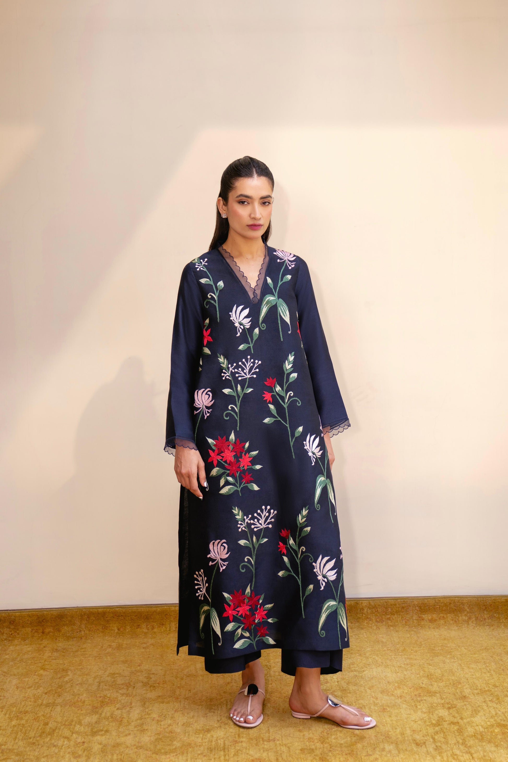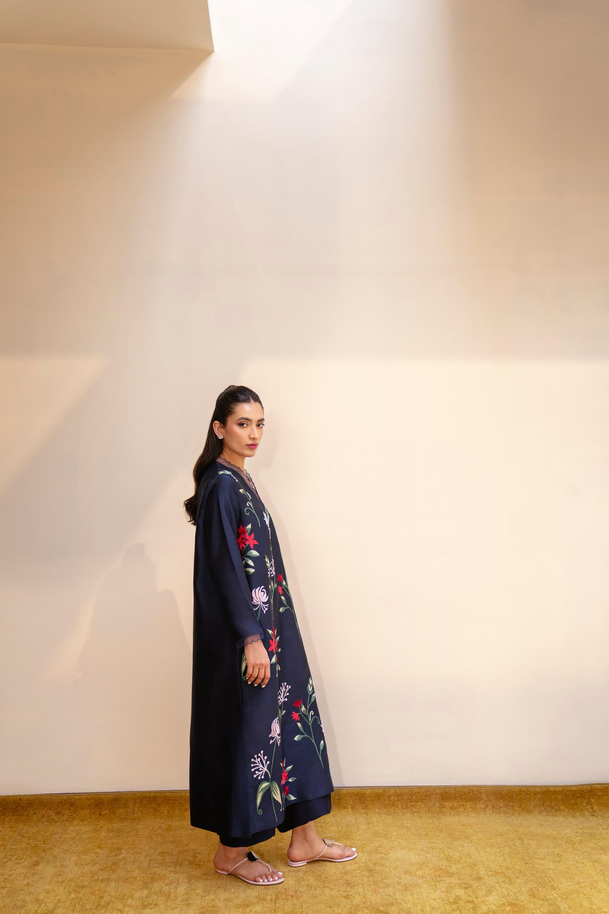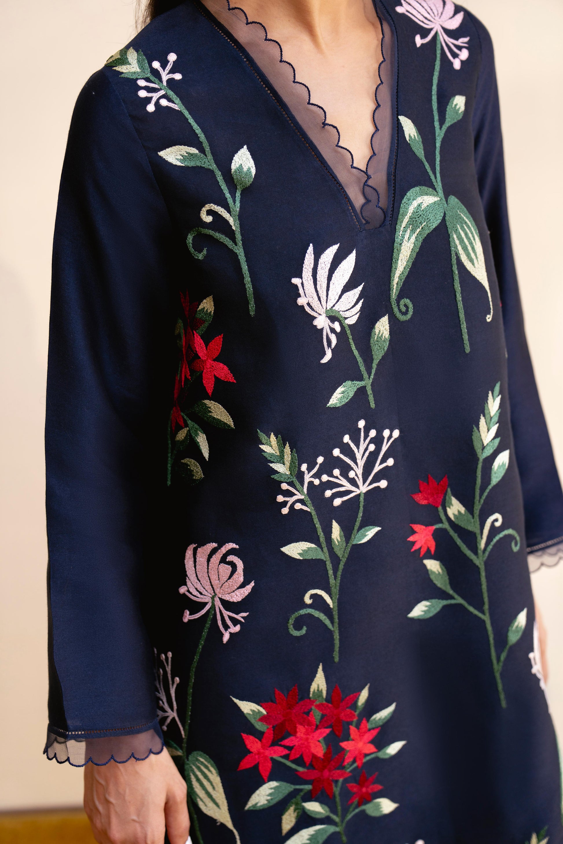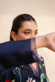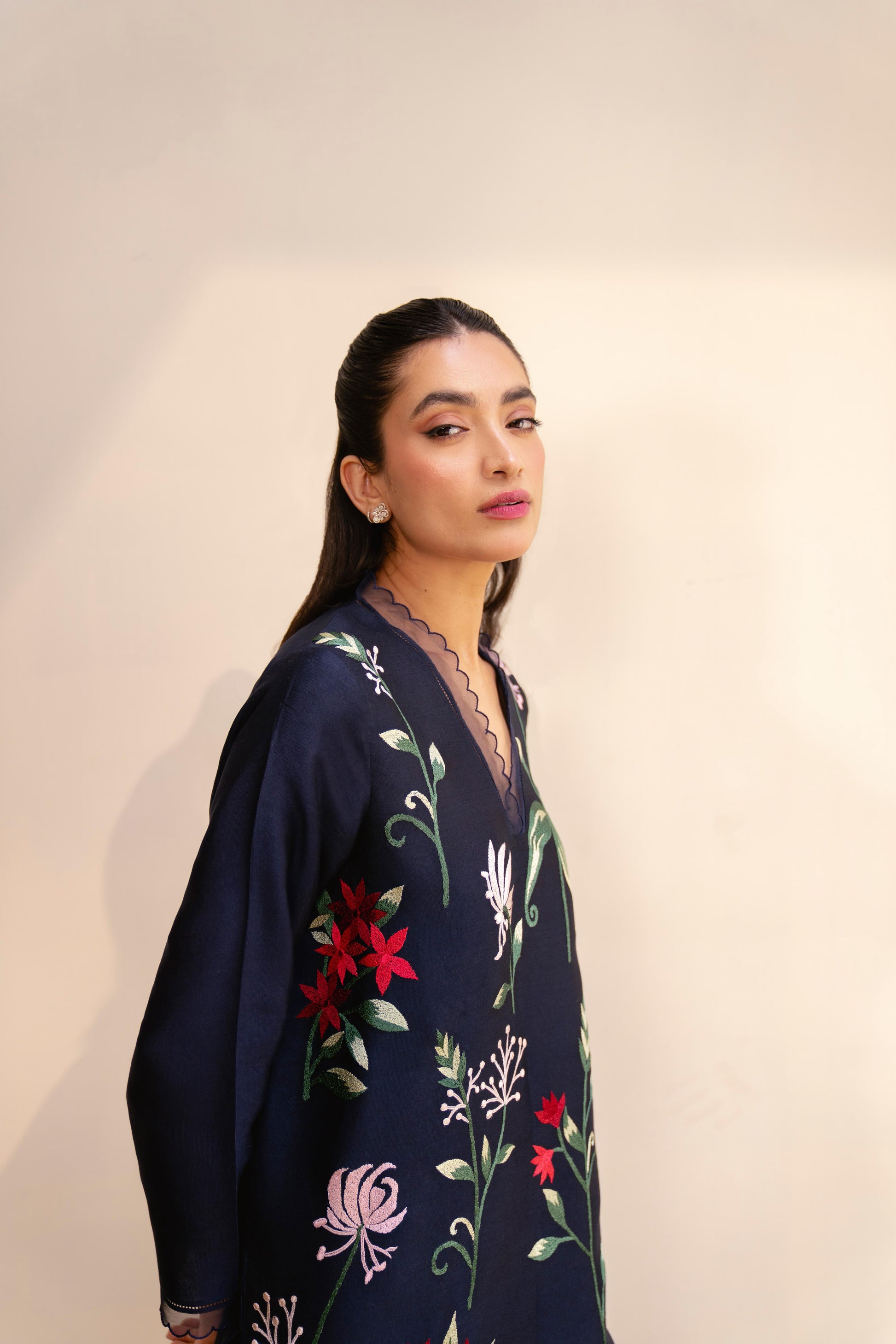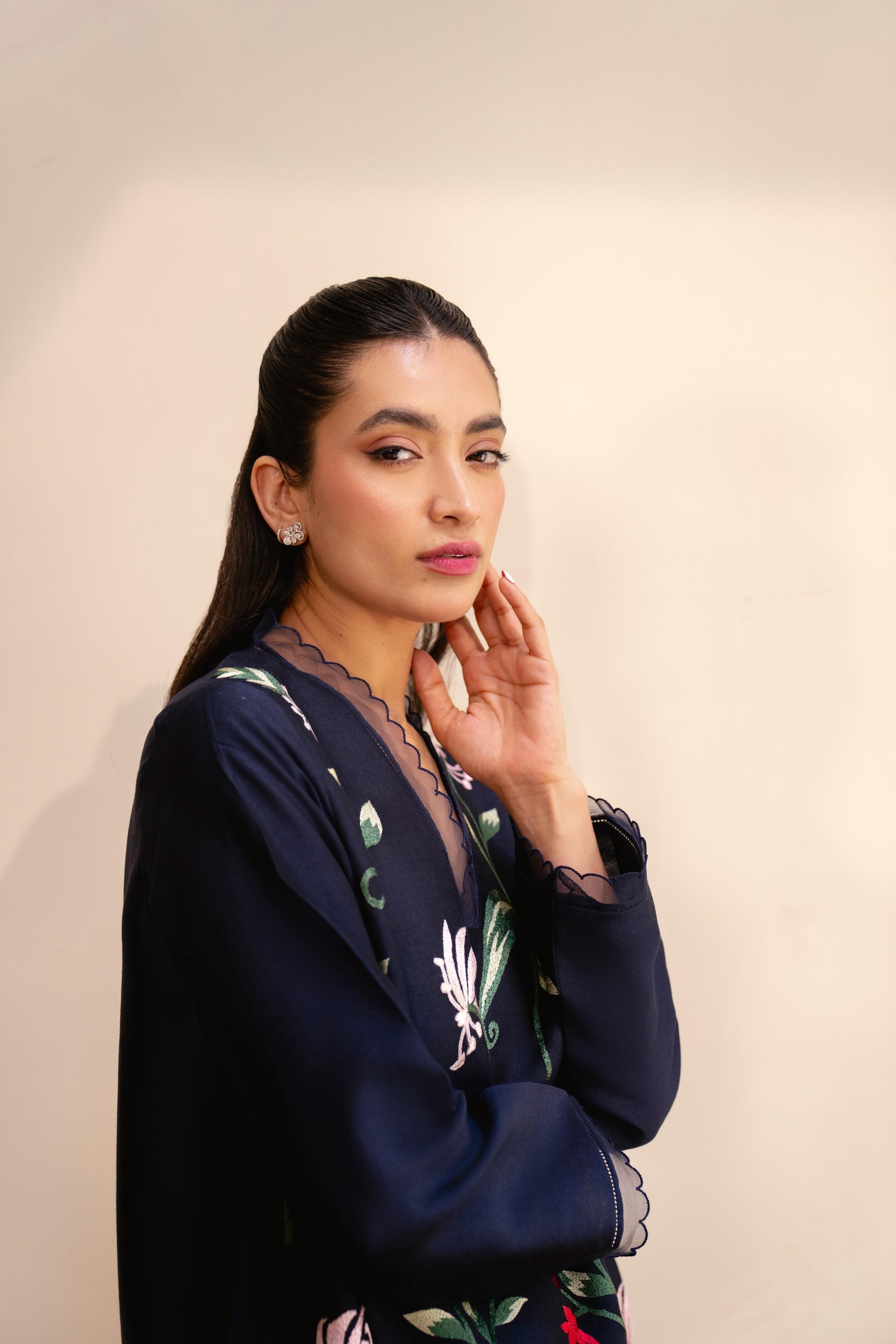 Our dazzling navy suit is crafted with khaddi net, giving vibrant floral embroidery that brings the design to life. Nayaab's shirt is adorned with colorful blooms, creating a bold palette. The matching khaddi net cullotes (sold separately) complement the shirt with traditional artistry.