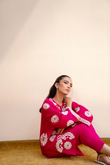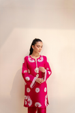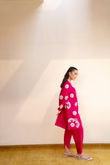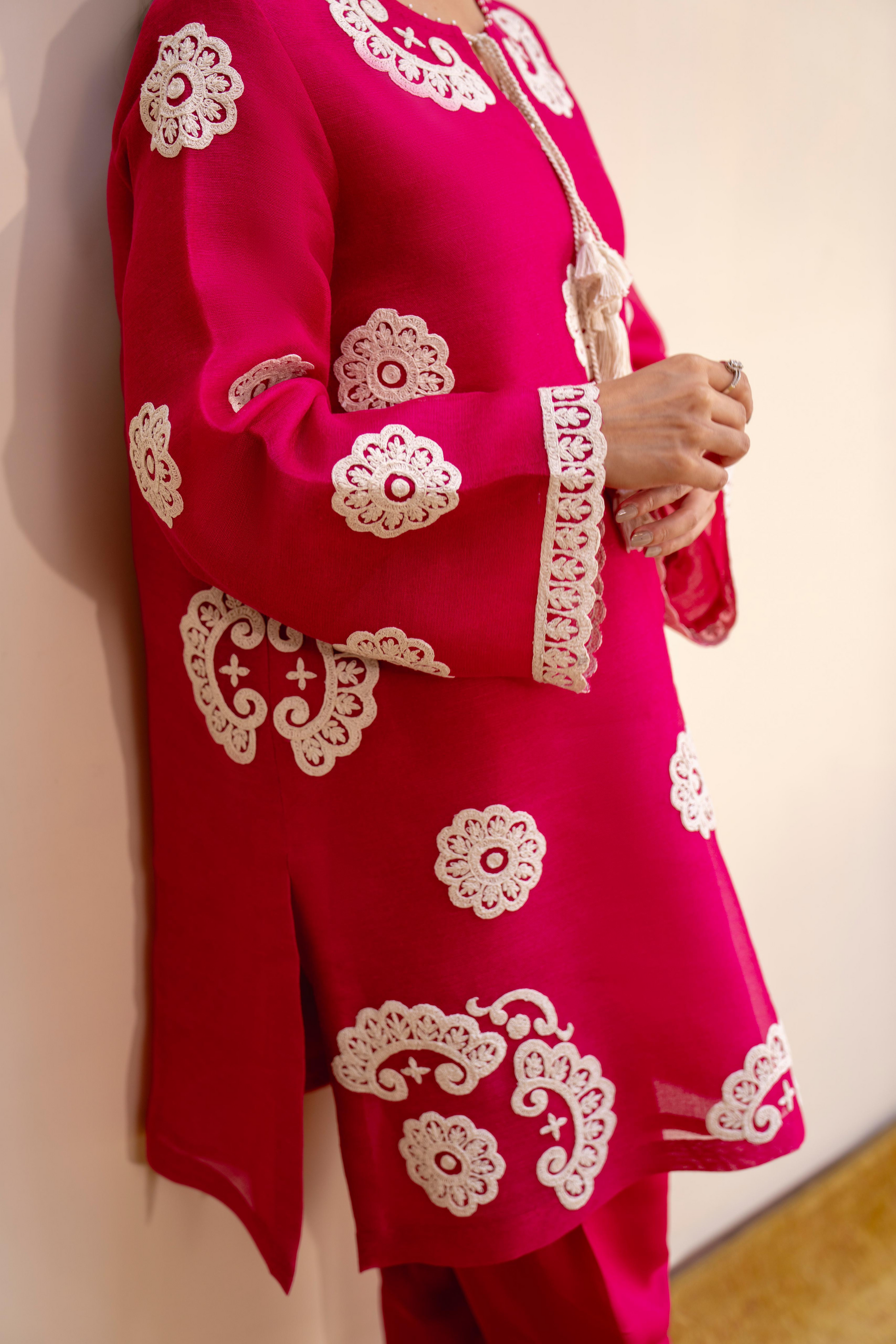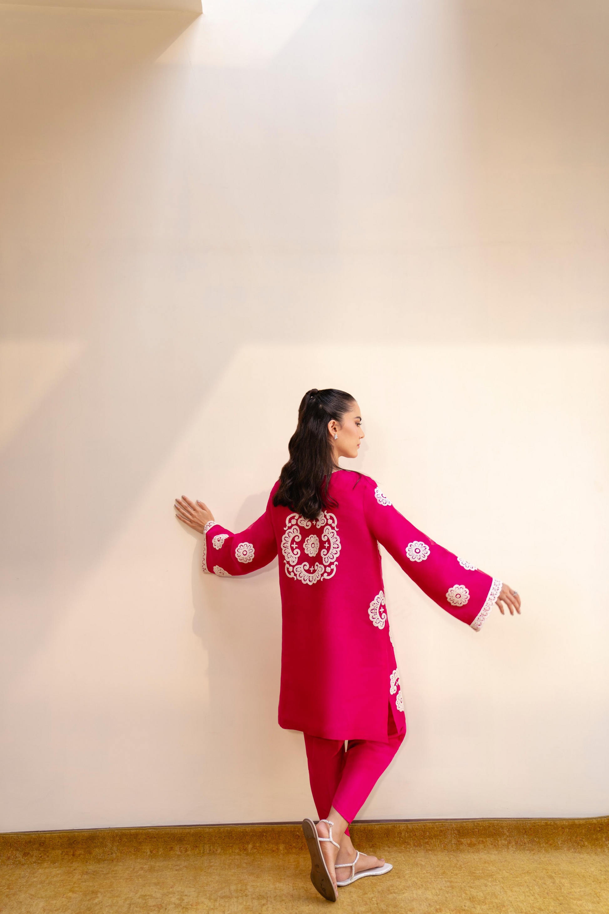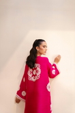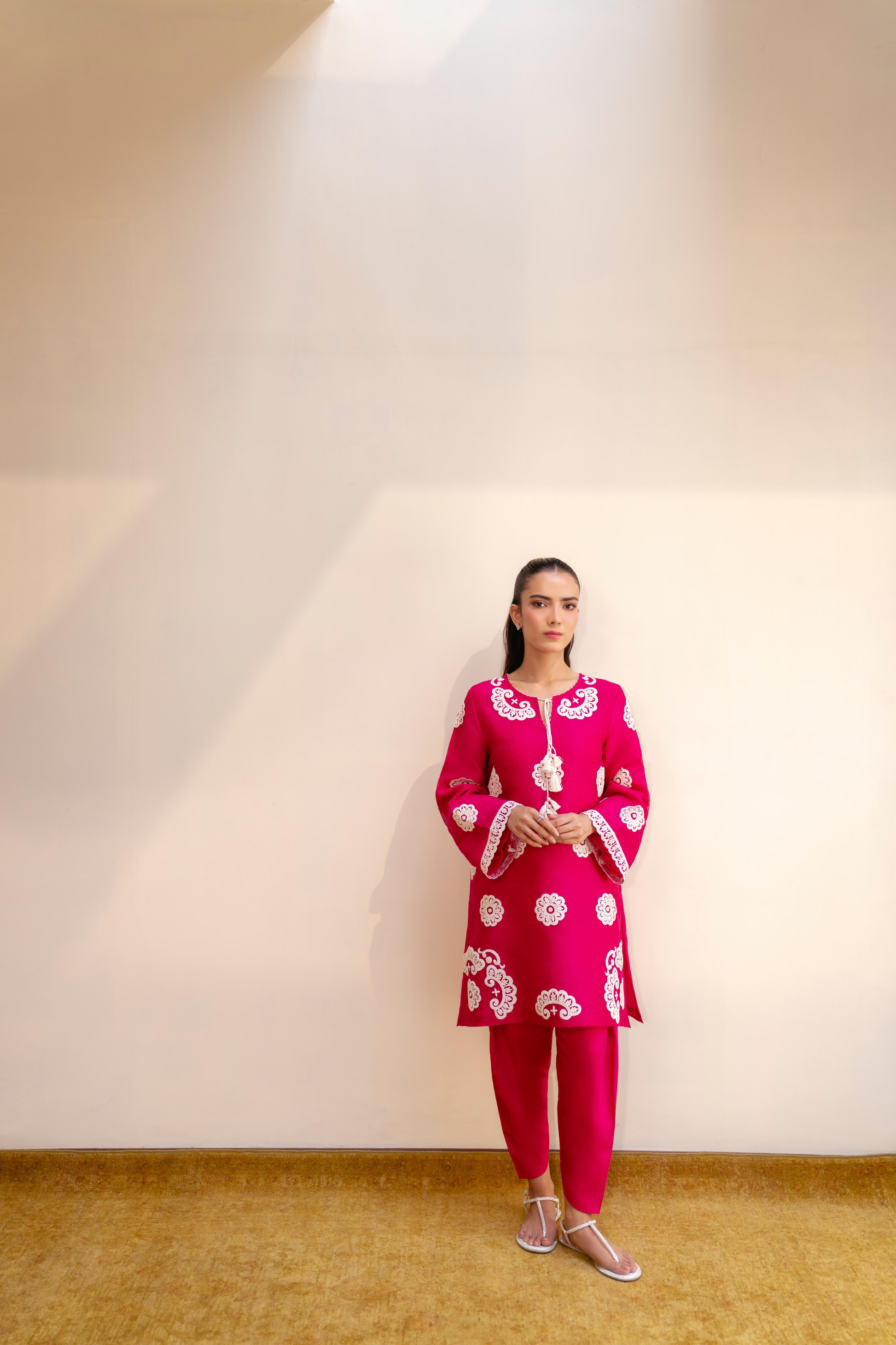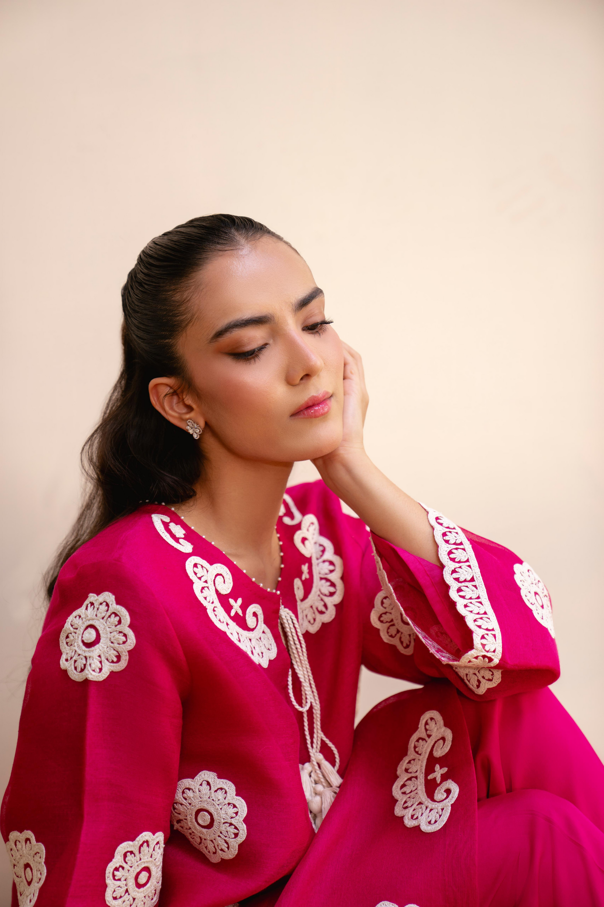 This striking pink ensemble is crafted from luxurious khaddi net with intricate floral embroidery that brings an artistic touch to its vibrant design. The shirt is beautifully adorned with delicate motifs, while the raw silk shalwar (sold separately) completes the look.