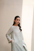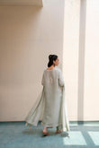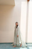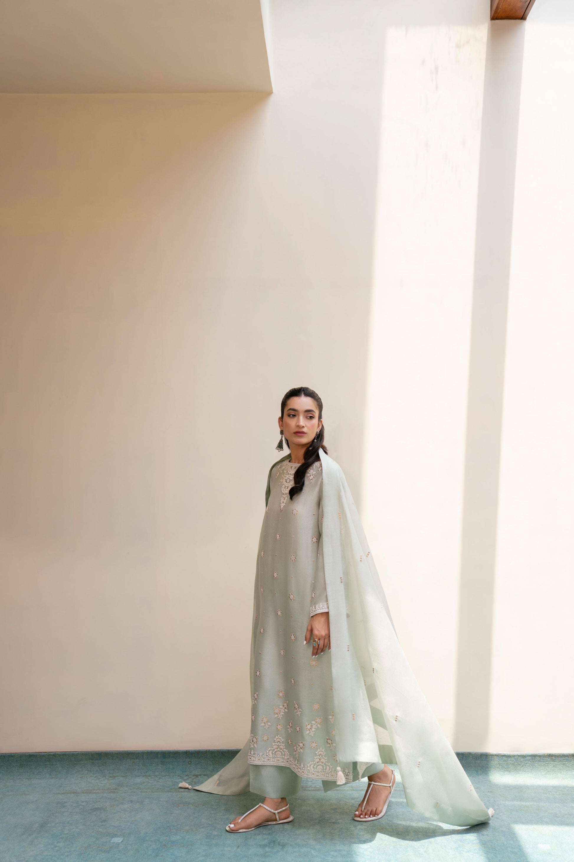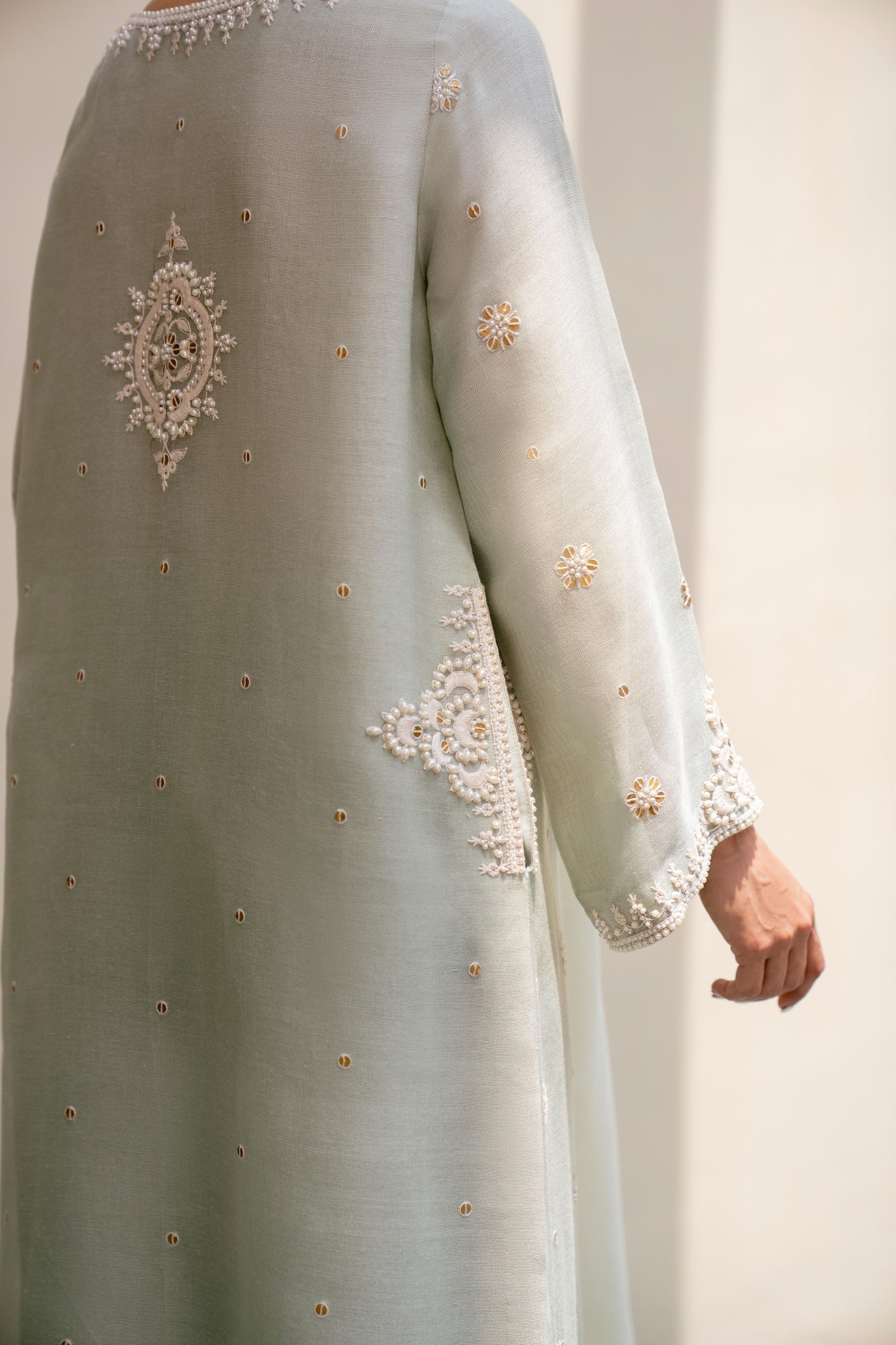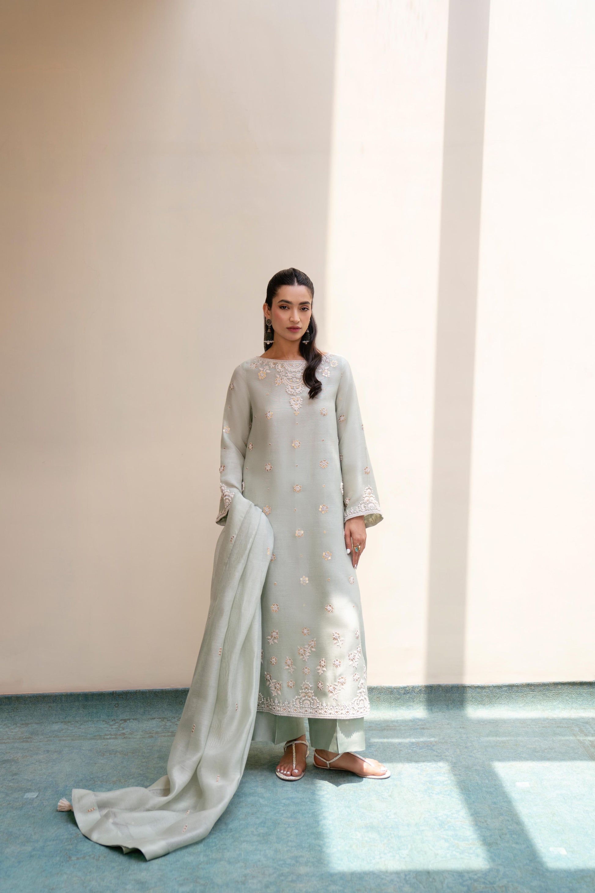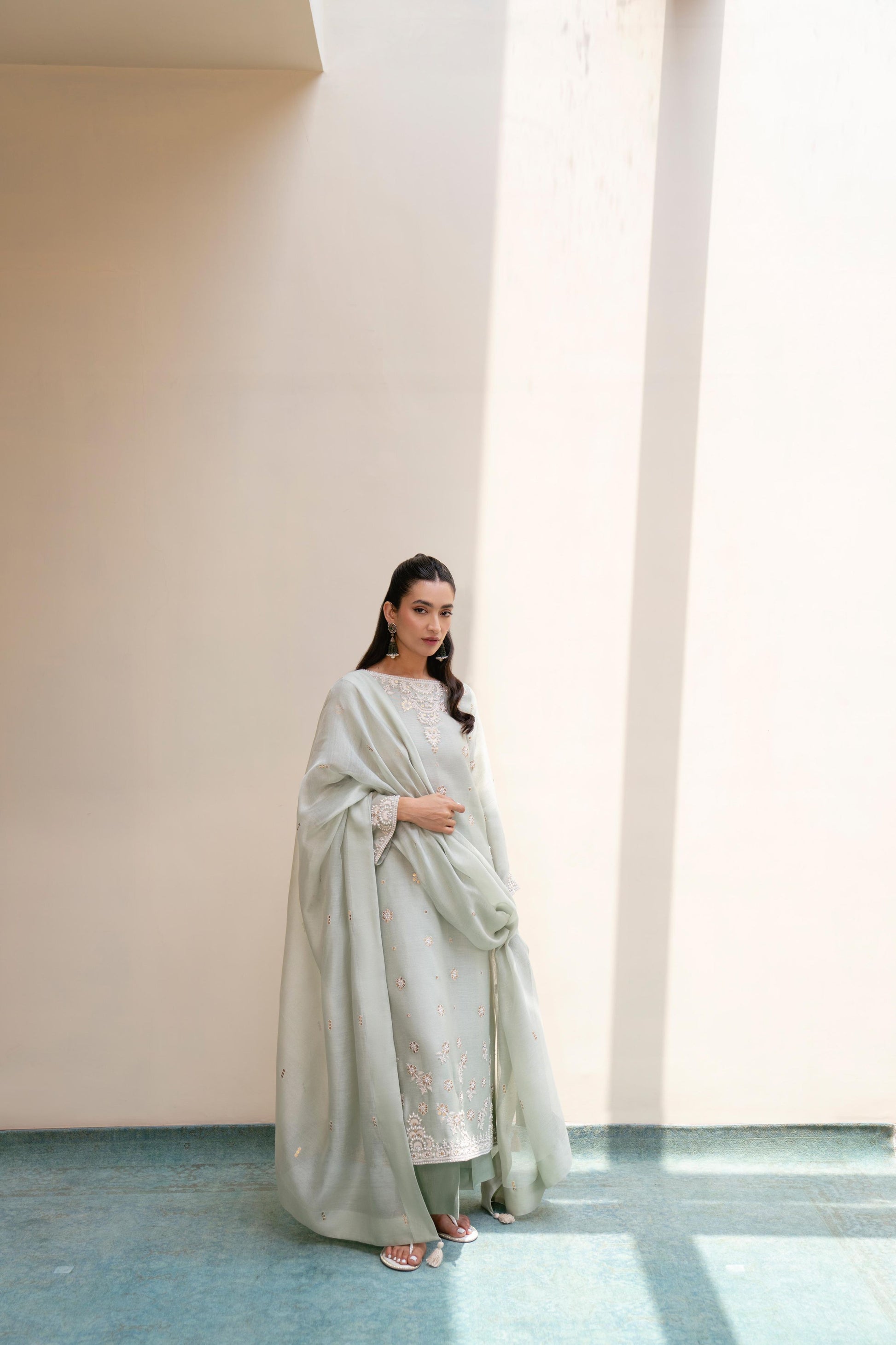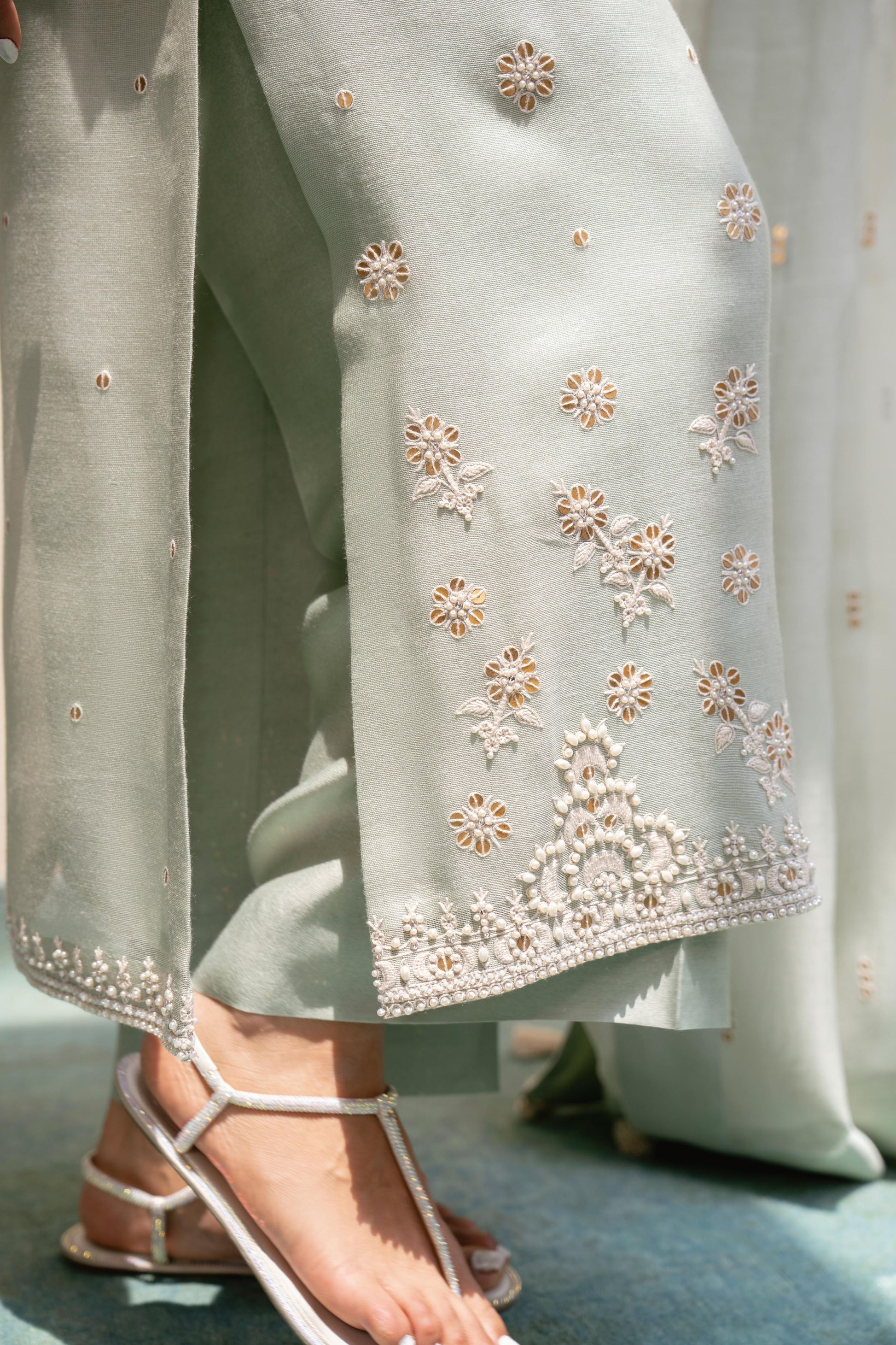 This mint green outfit made with rich khaddi net fabric, features dainty embroidery with pearl embellishments. The shirt is gracefully adorned with floral patterns and the matching khaddi net dupatta adds an ethereal feel to the look. The cullotes (sold separately) provide a chic silhouette.