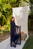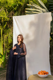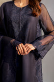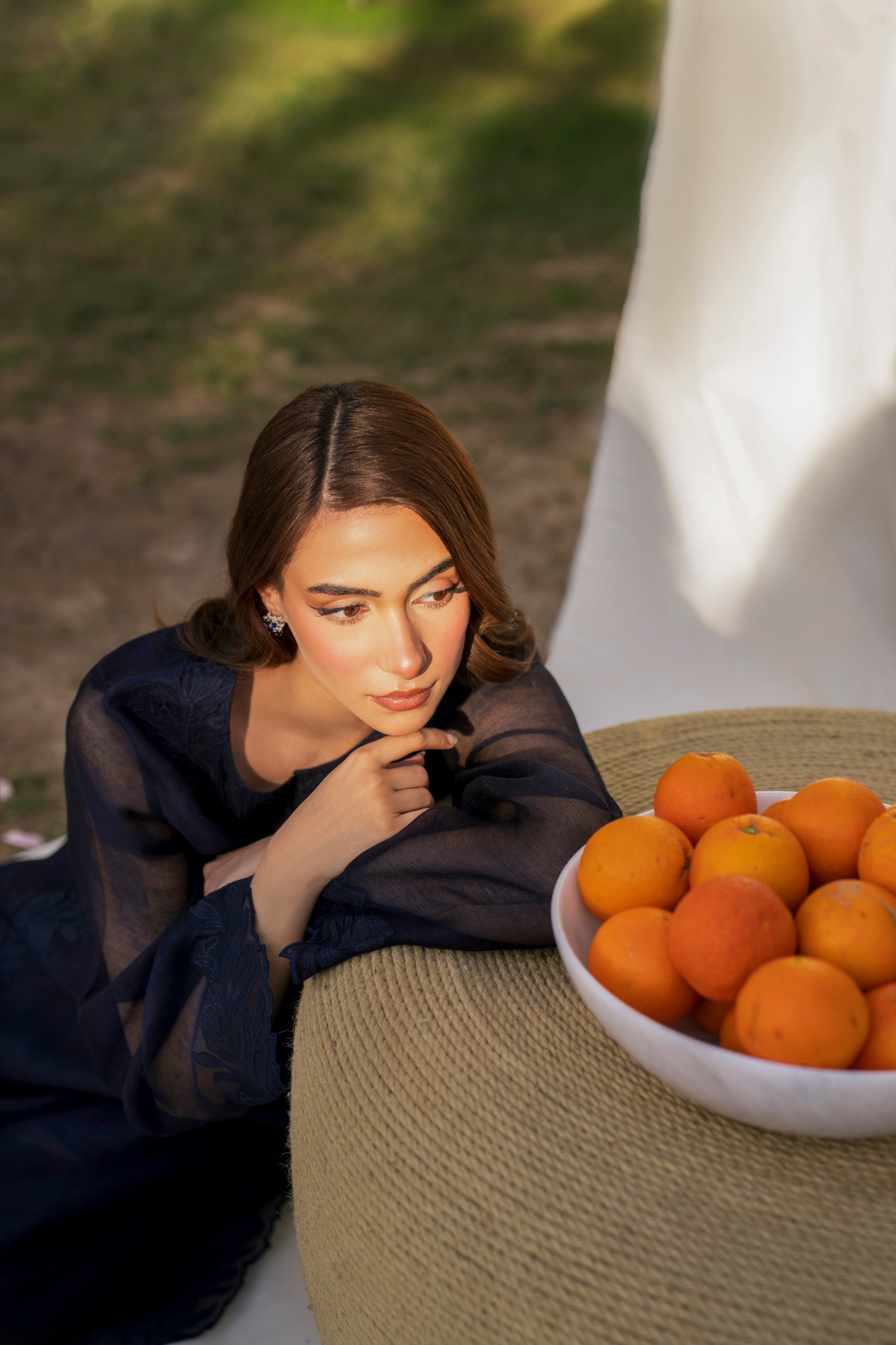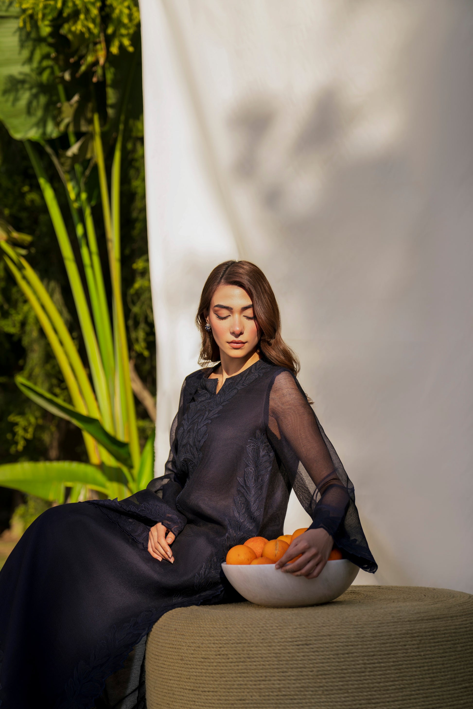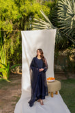 Nilay is a stunning blend of rich and graceful allure. The navy shirt embellished with delicate appliqué floral detailing, is perfectly paired with a matching dupatta and culottes (sold separately).