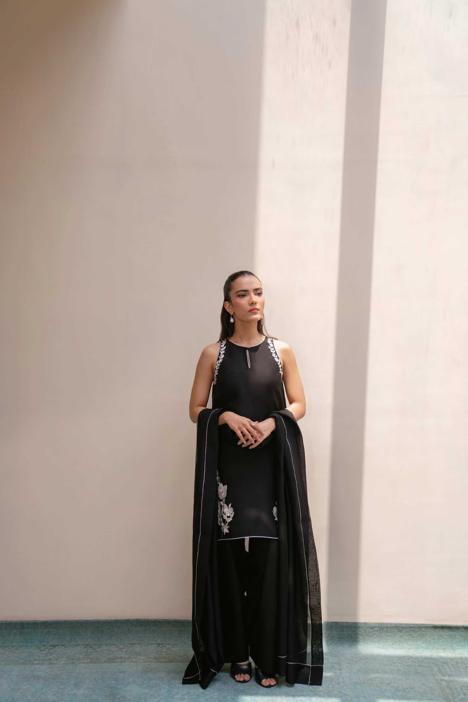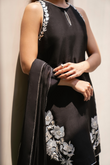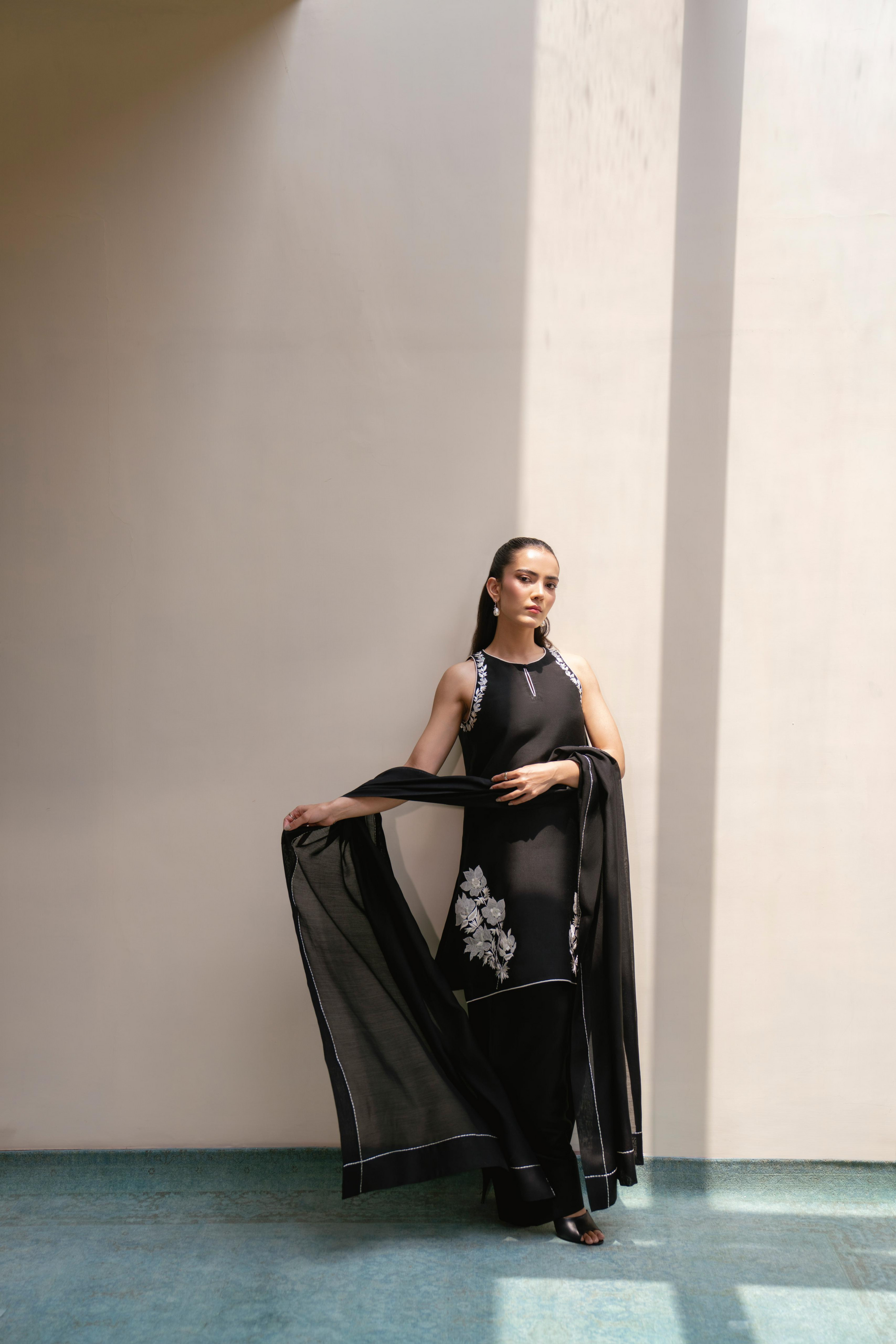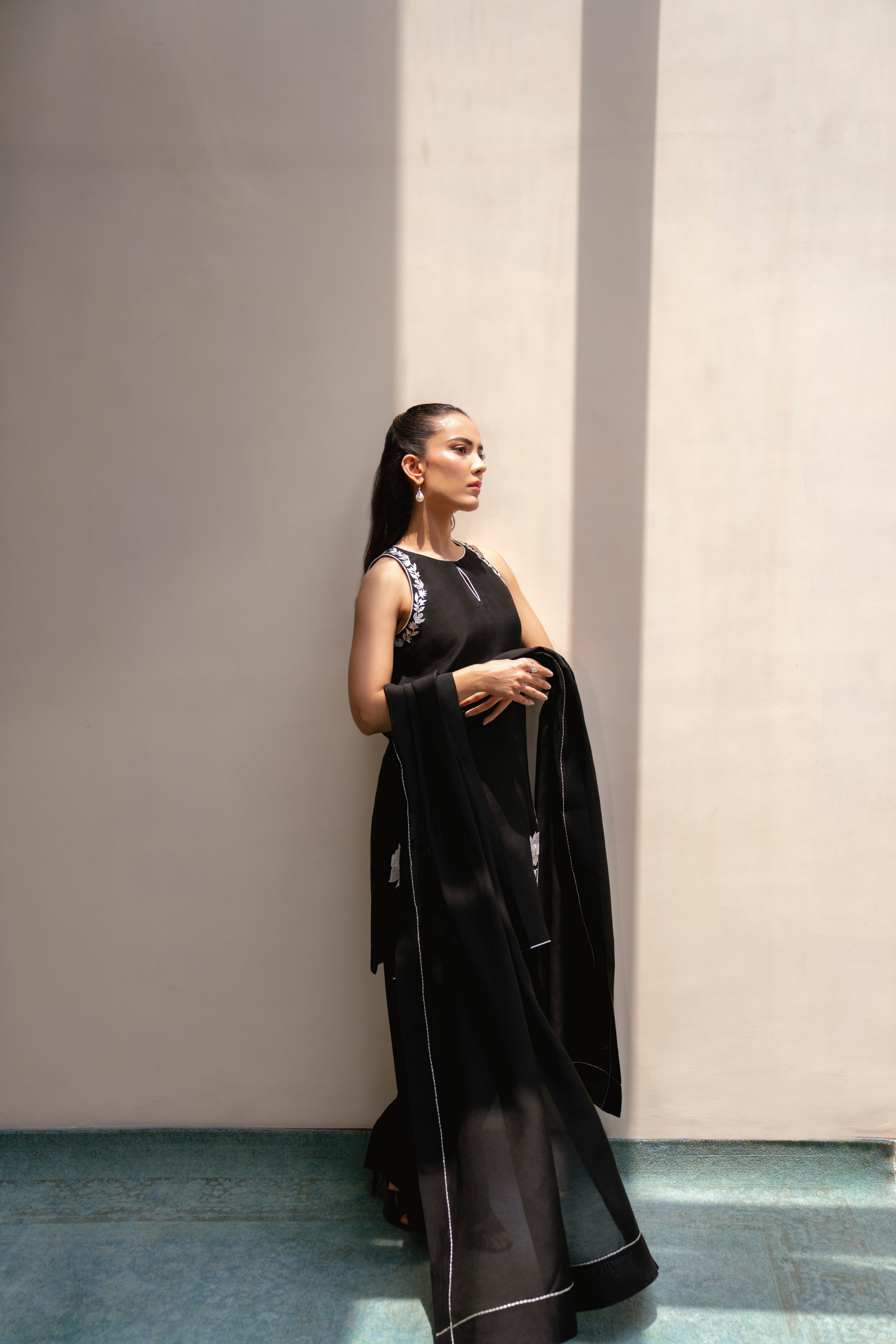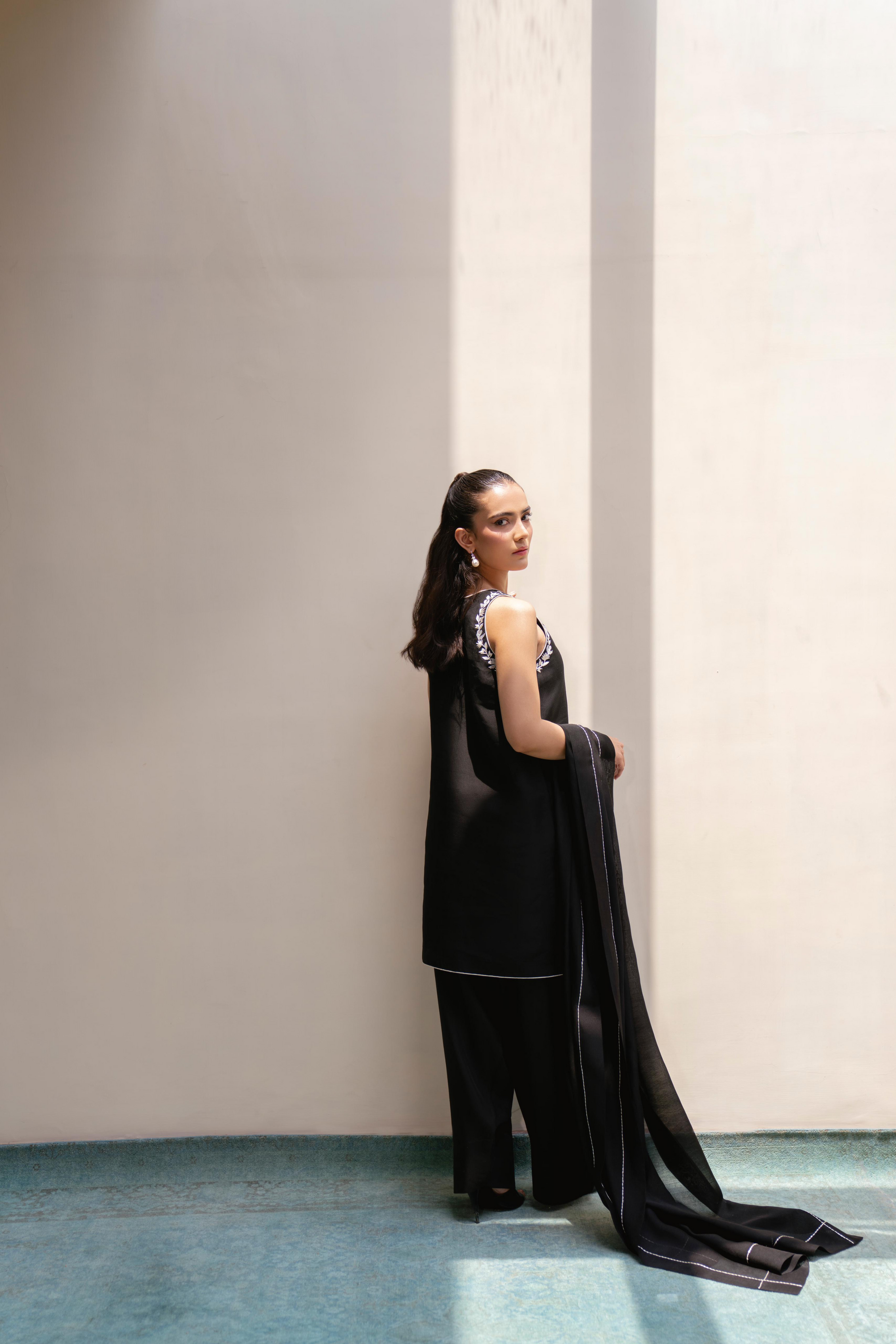 Our striking black suit is crafted from a lavish khaddi silk fabric, with subtle embroidery adding sophistication. Its shirt is complemented by a matching khaddi silk dupatta, elevating the elegance of the piece. The raw silk farshi shalwar (sold separately) creates the perfect balance.