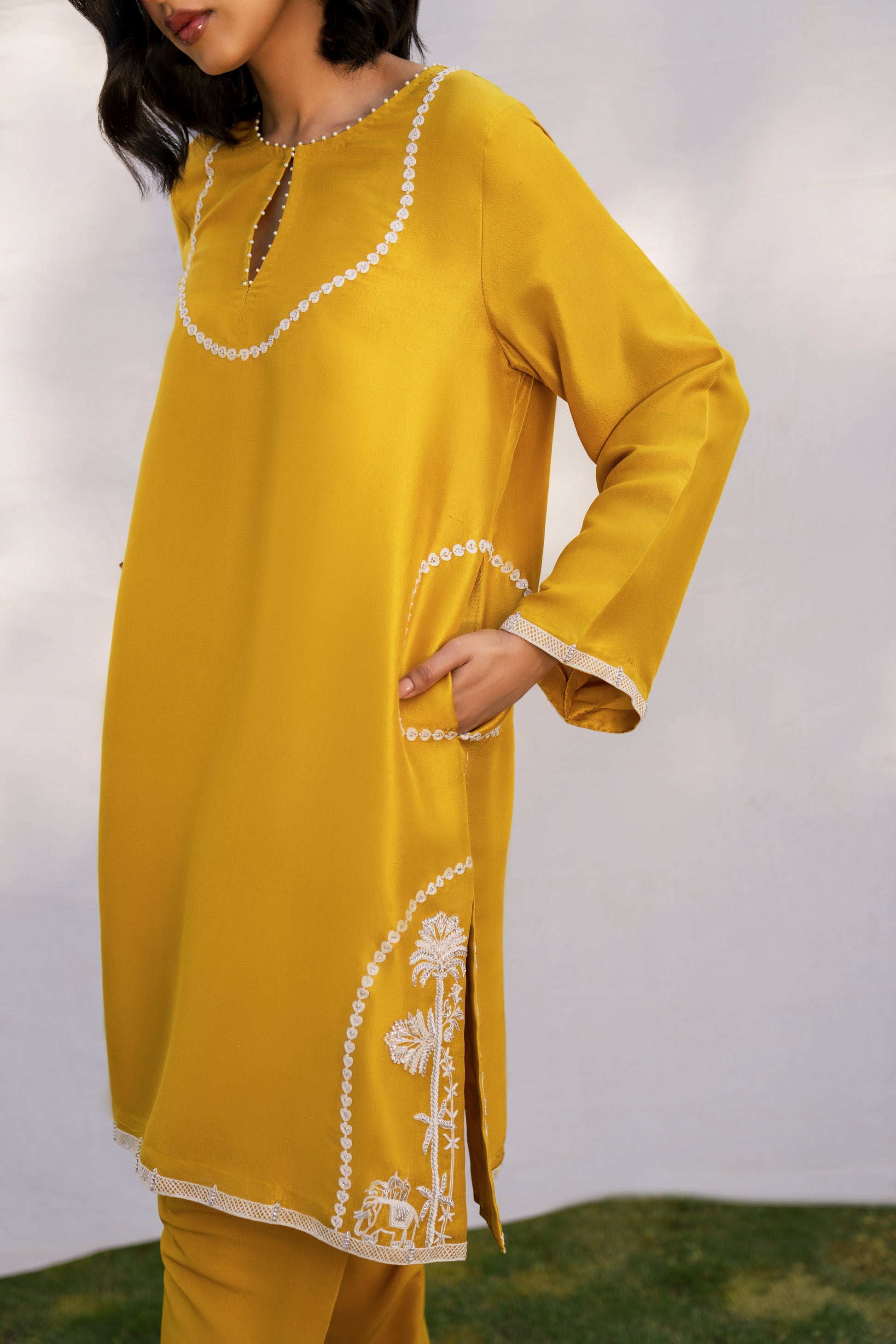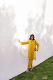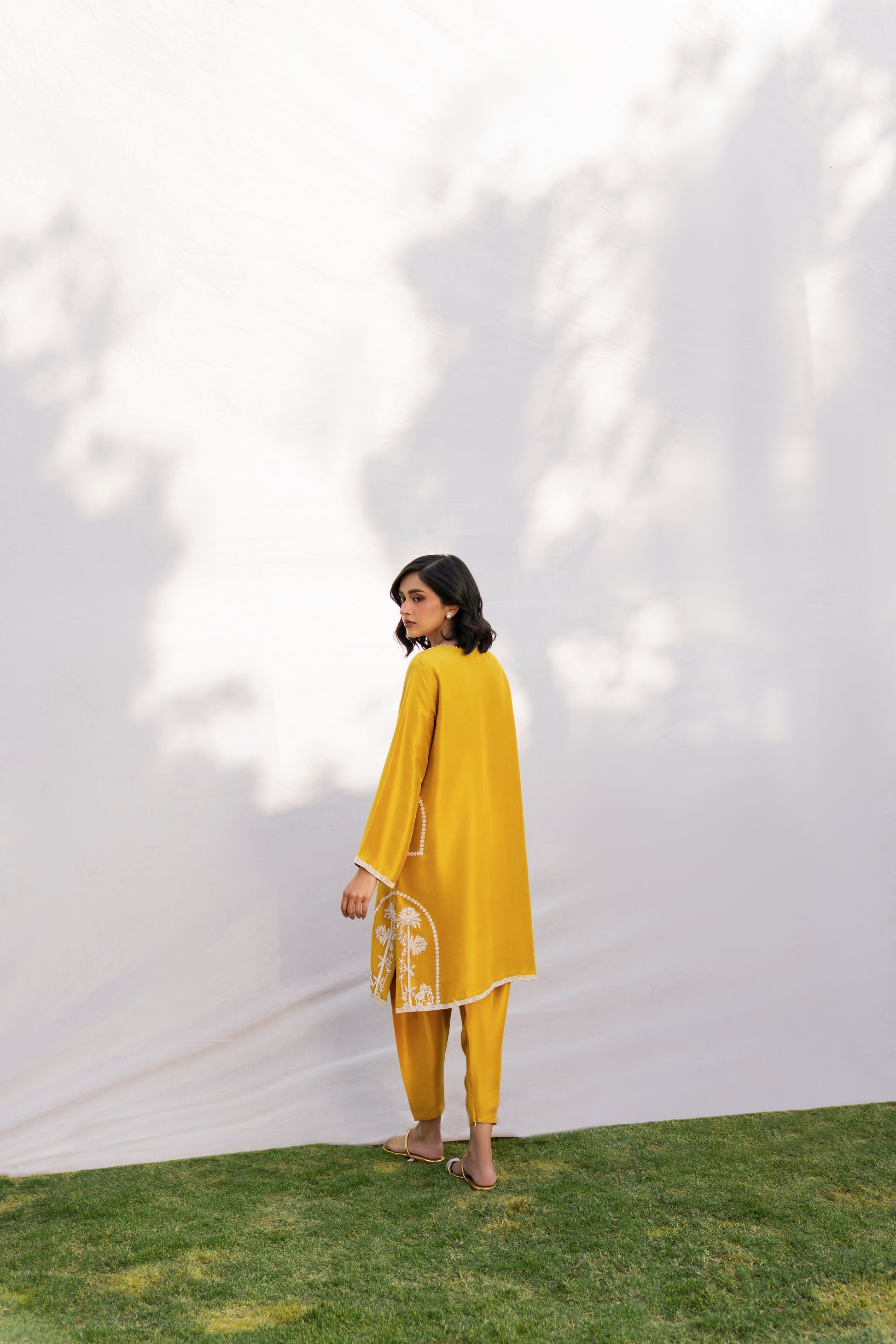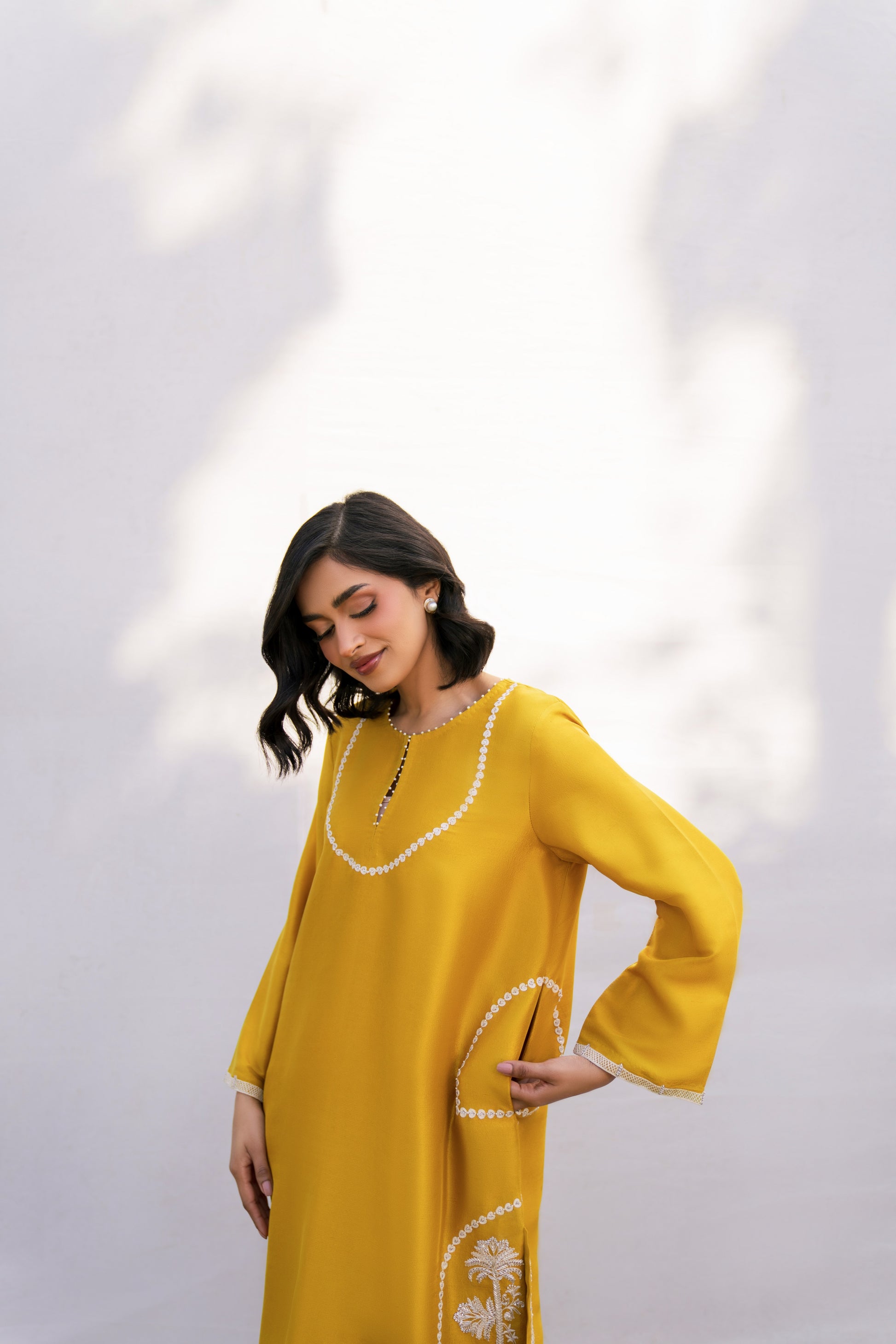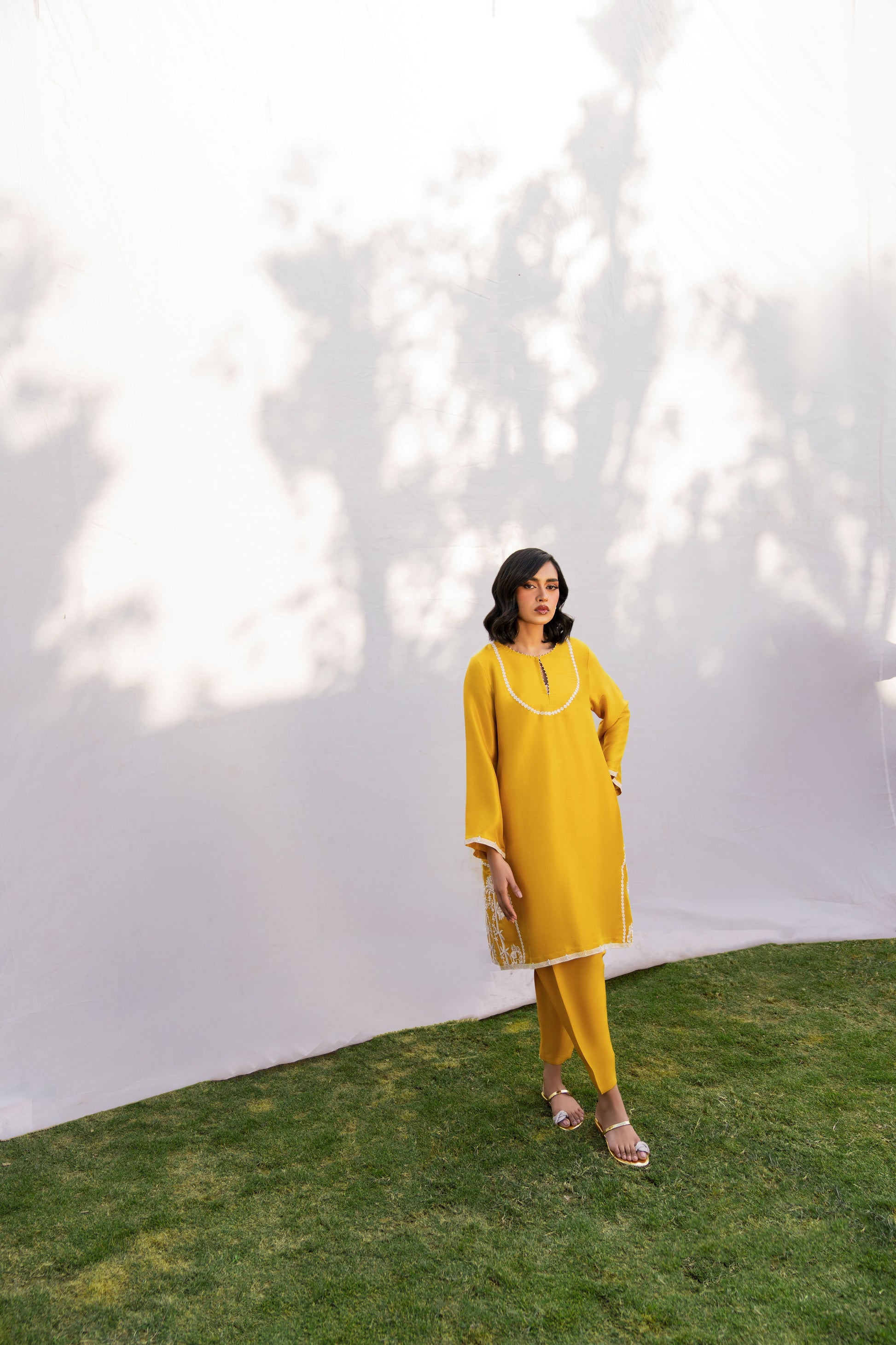 Crafted in a striking mustard hue, this piece is adorned with delicate hand embellishments, adding a touch of artisanal charm. Paired with a matching raw silk shalwar (sold separately), this ensemble is the perfect balance of tradition and modern refinement.