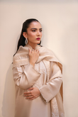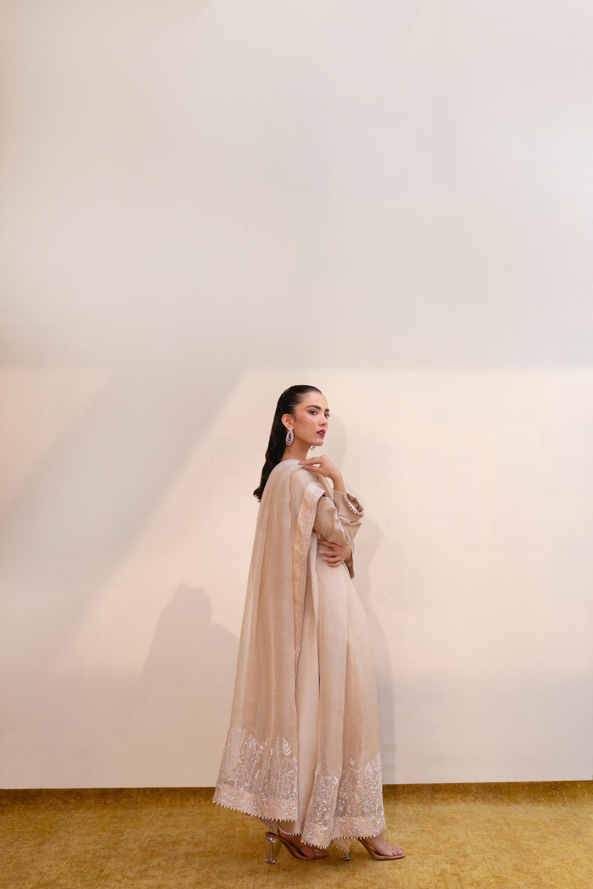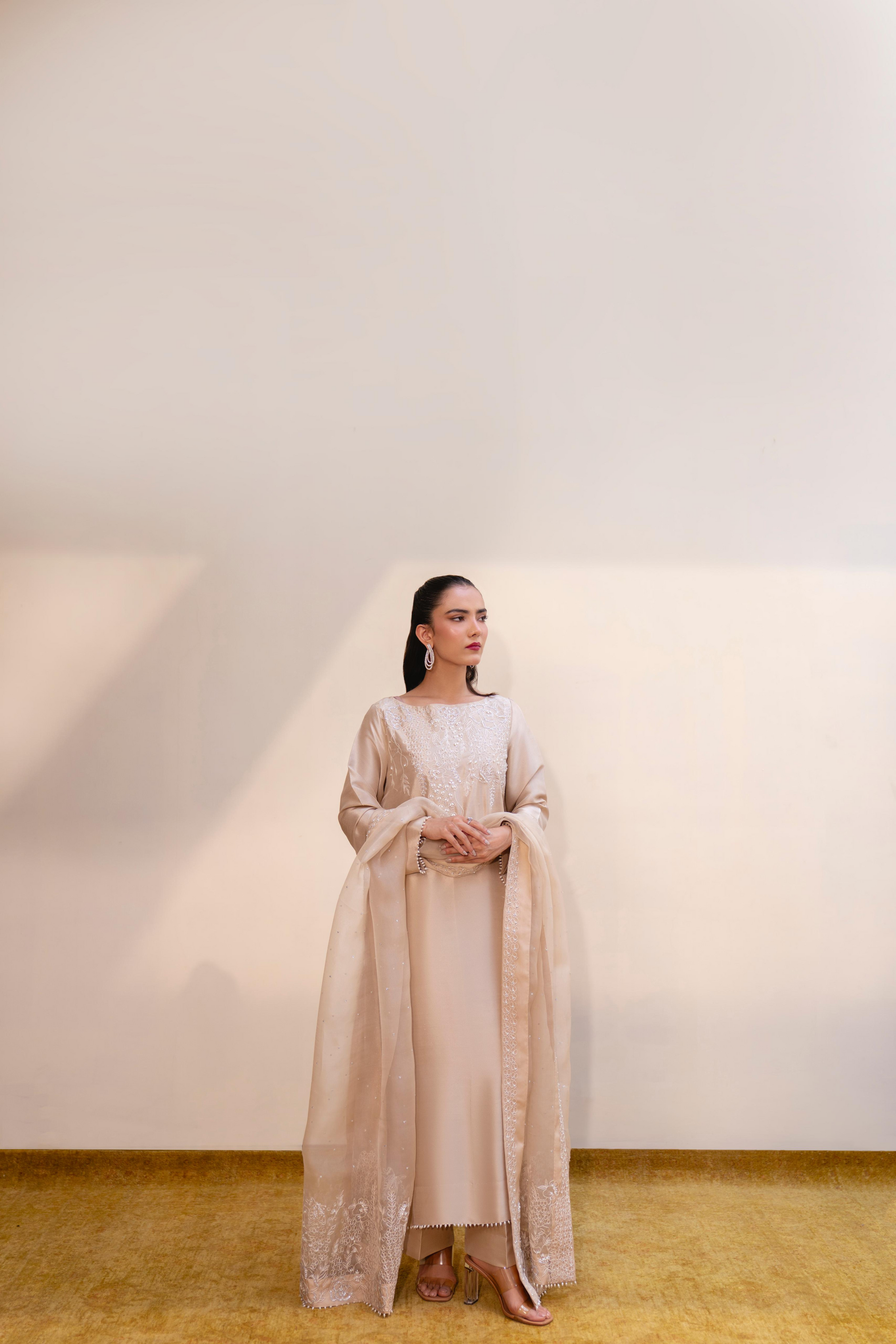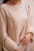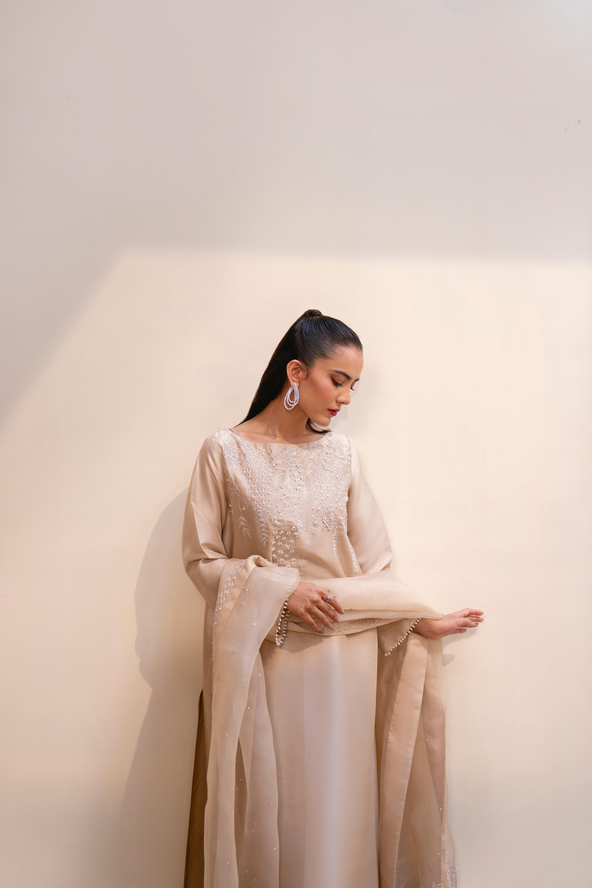 This stunning beige ensemble is crafted from delicate raw silk, featuring exquisite hand embroidery with pearl embellishments. The shirt is paired with a beautiful organza dupatta, creating a timeless look. The matching raw silk pants (sold separately) complete the ensemble.