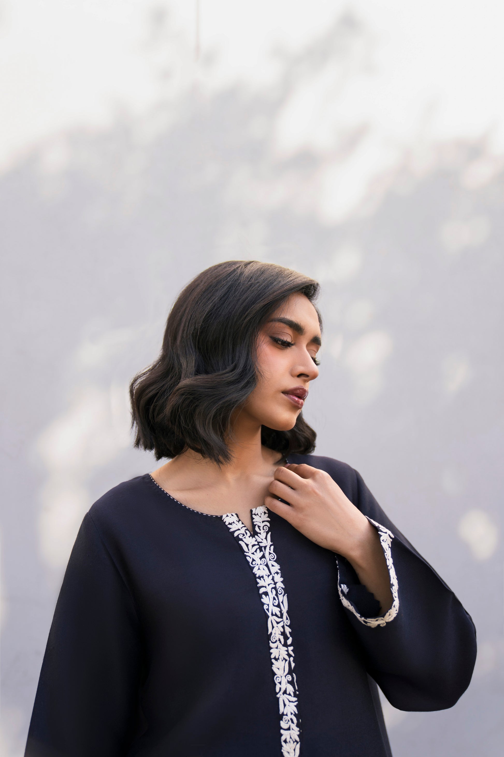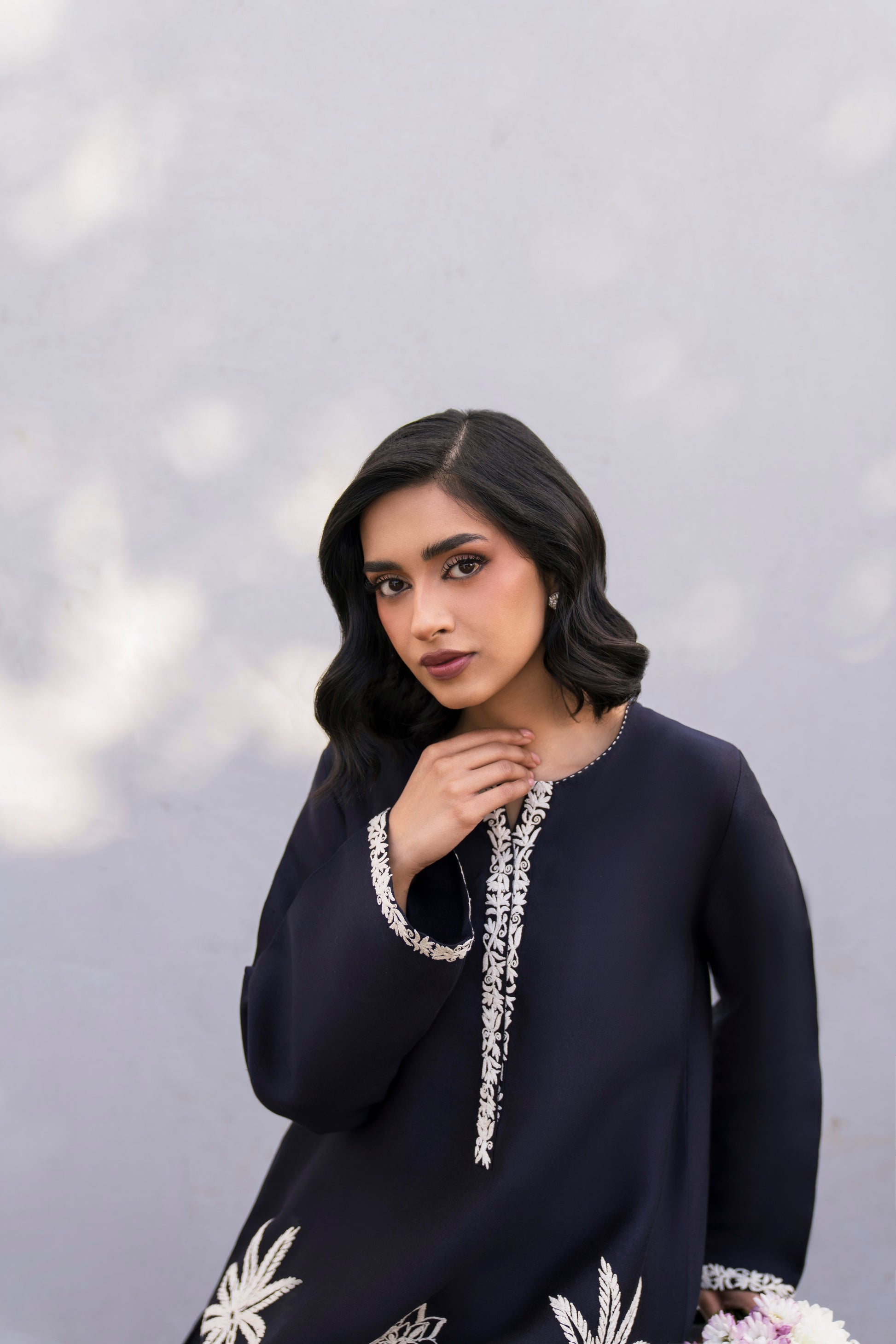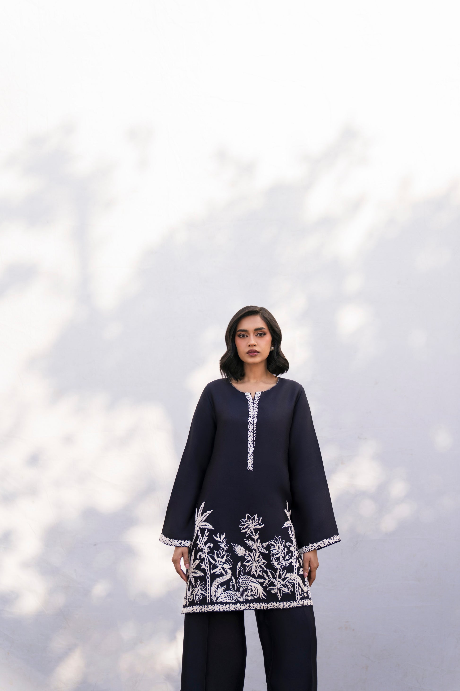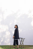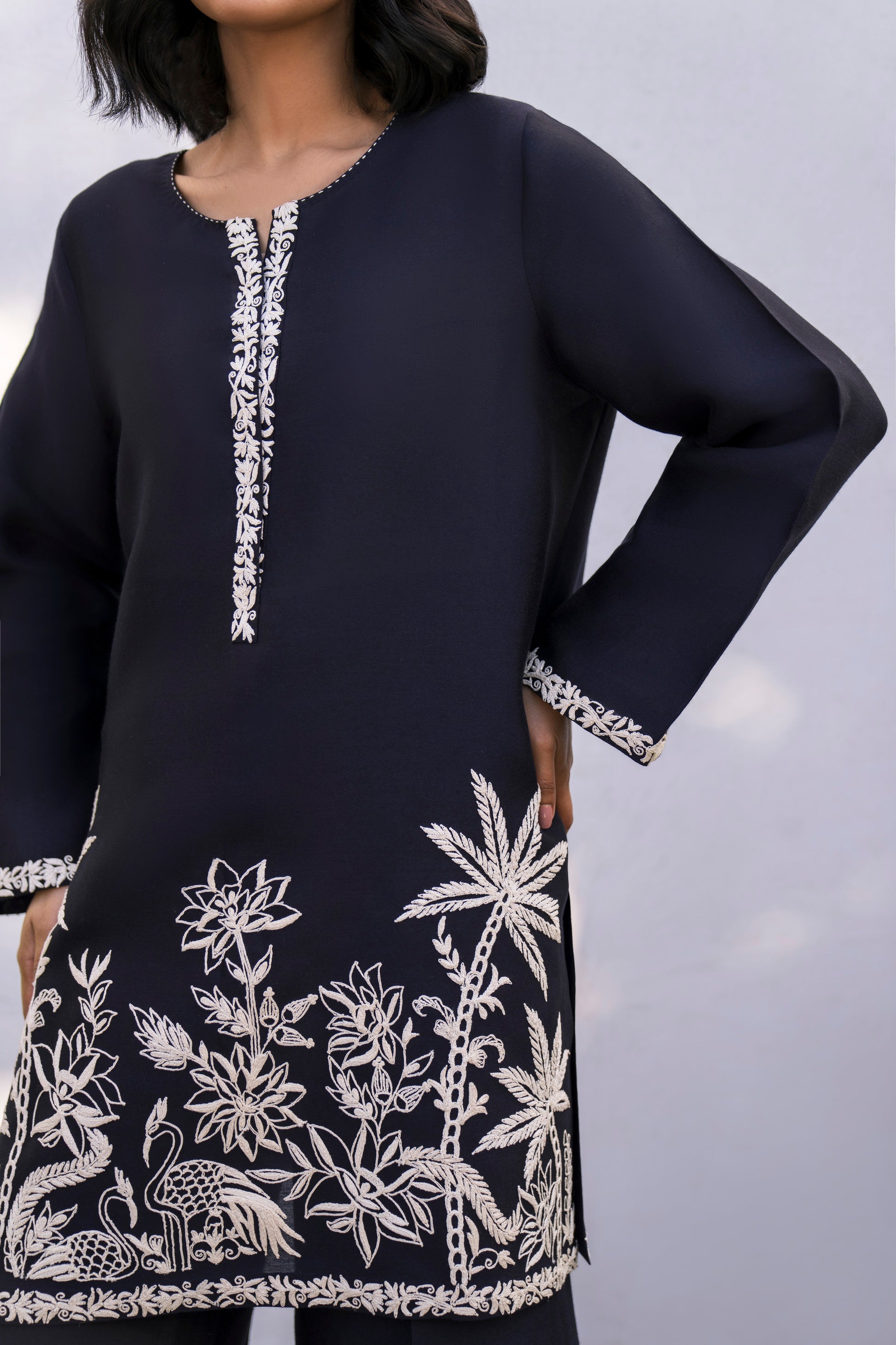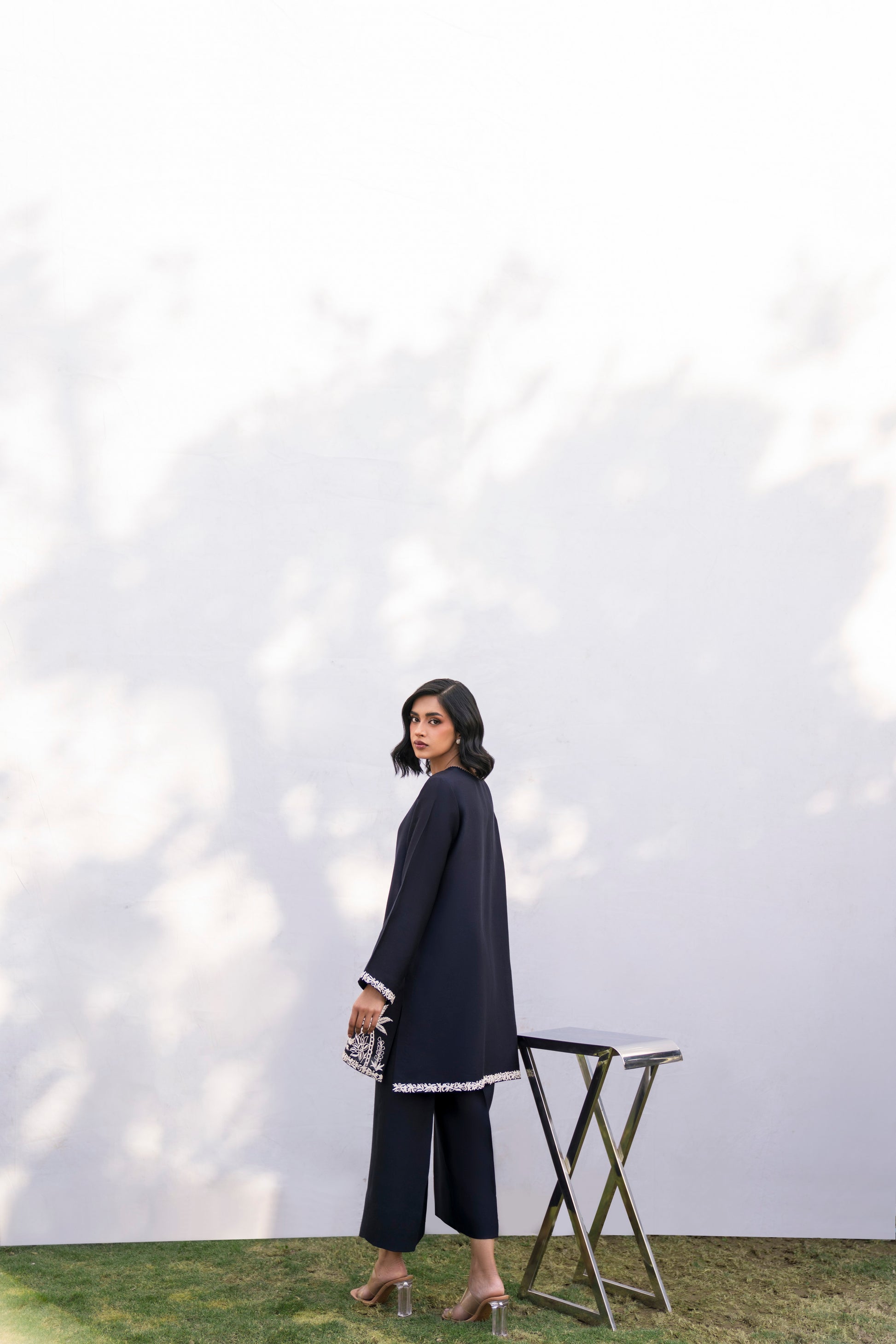 In rich teal colour, the piece is accented with subtle embroidery, paired seamlessly with matching culottes. A sophisticated choice for a minimalist look.