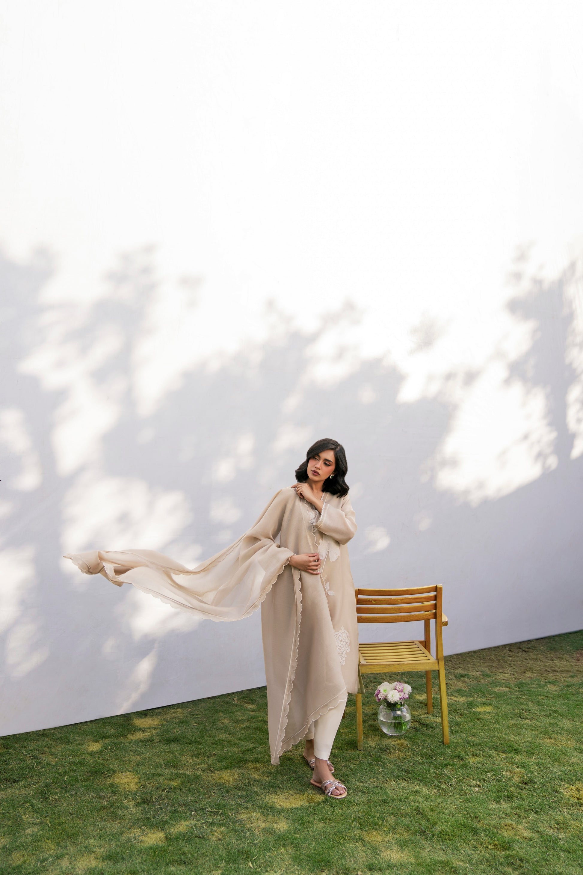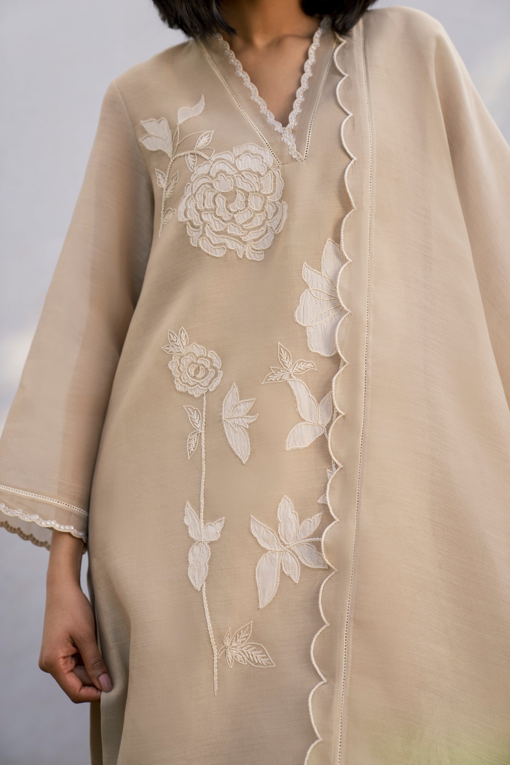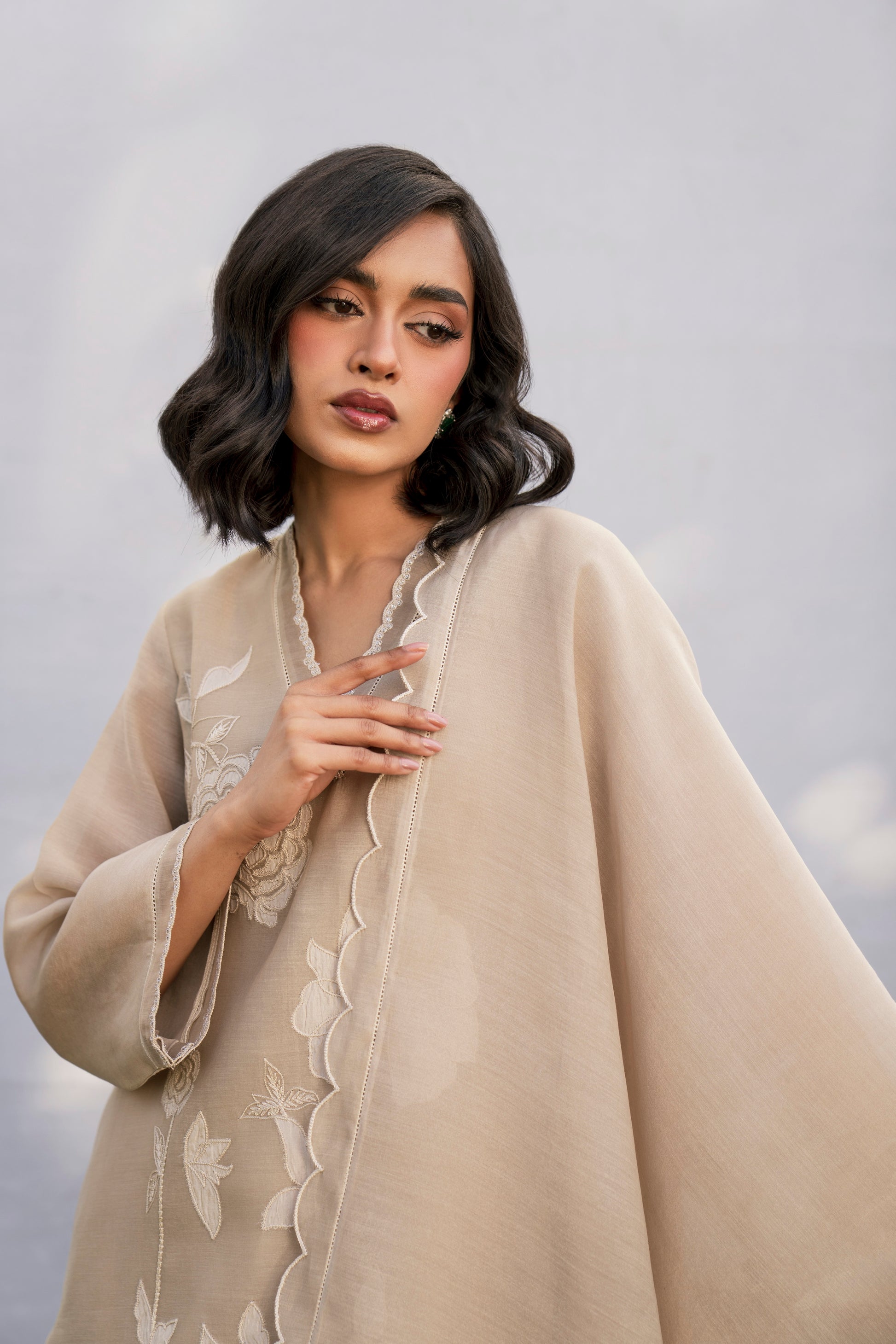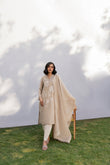 Crafted in soft taupe colour, the shirt displays exquisite floral appliqué detailing, elevating its simplicity. The dupatta adds an airy elegance and the shalwar (sold separately) completes the look.