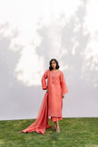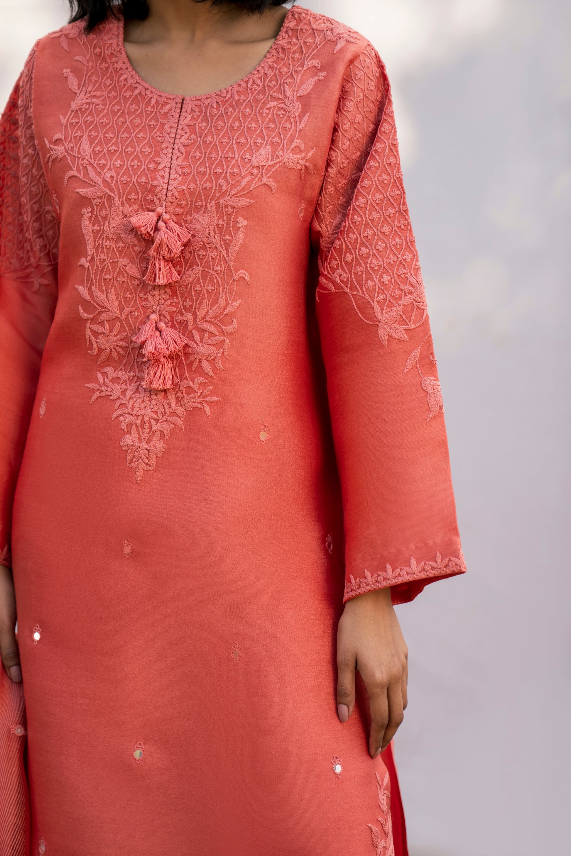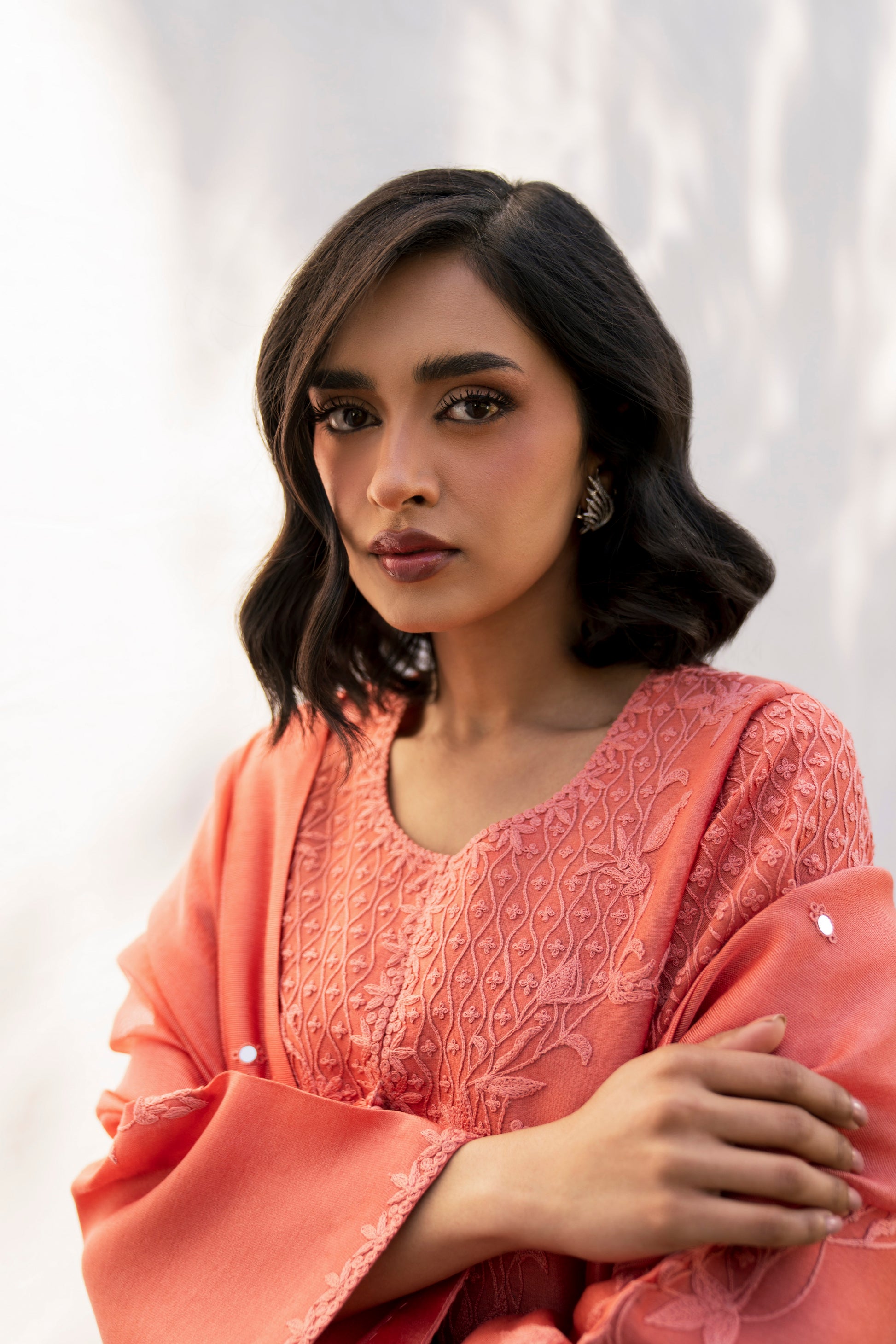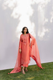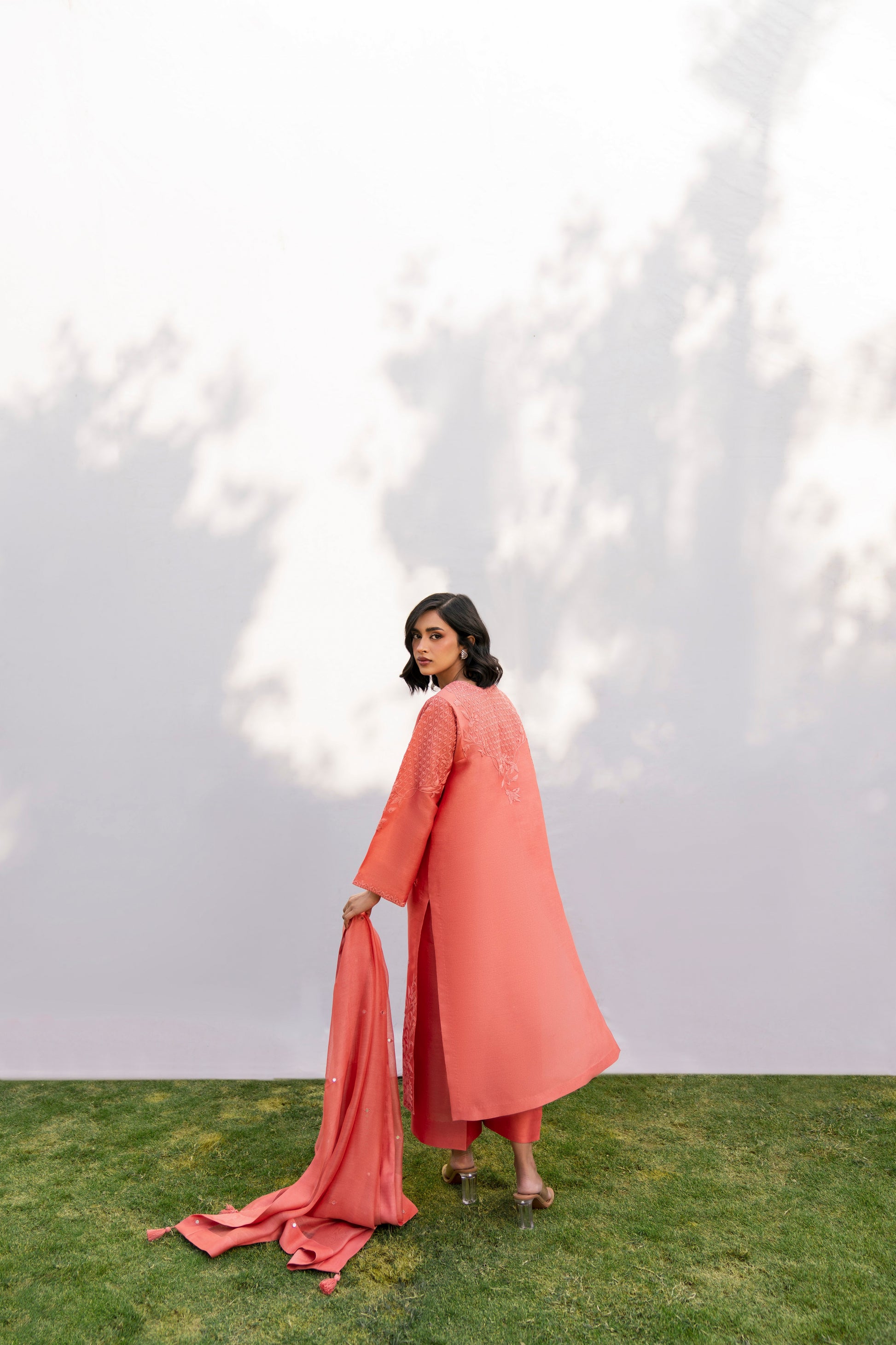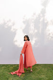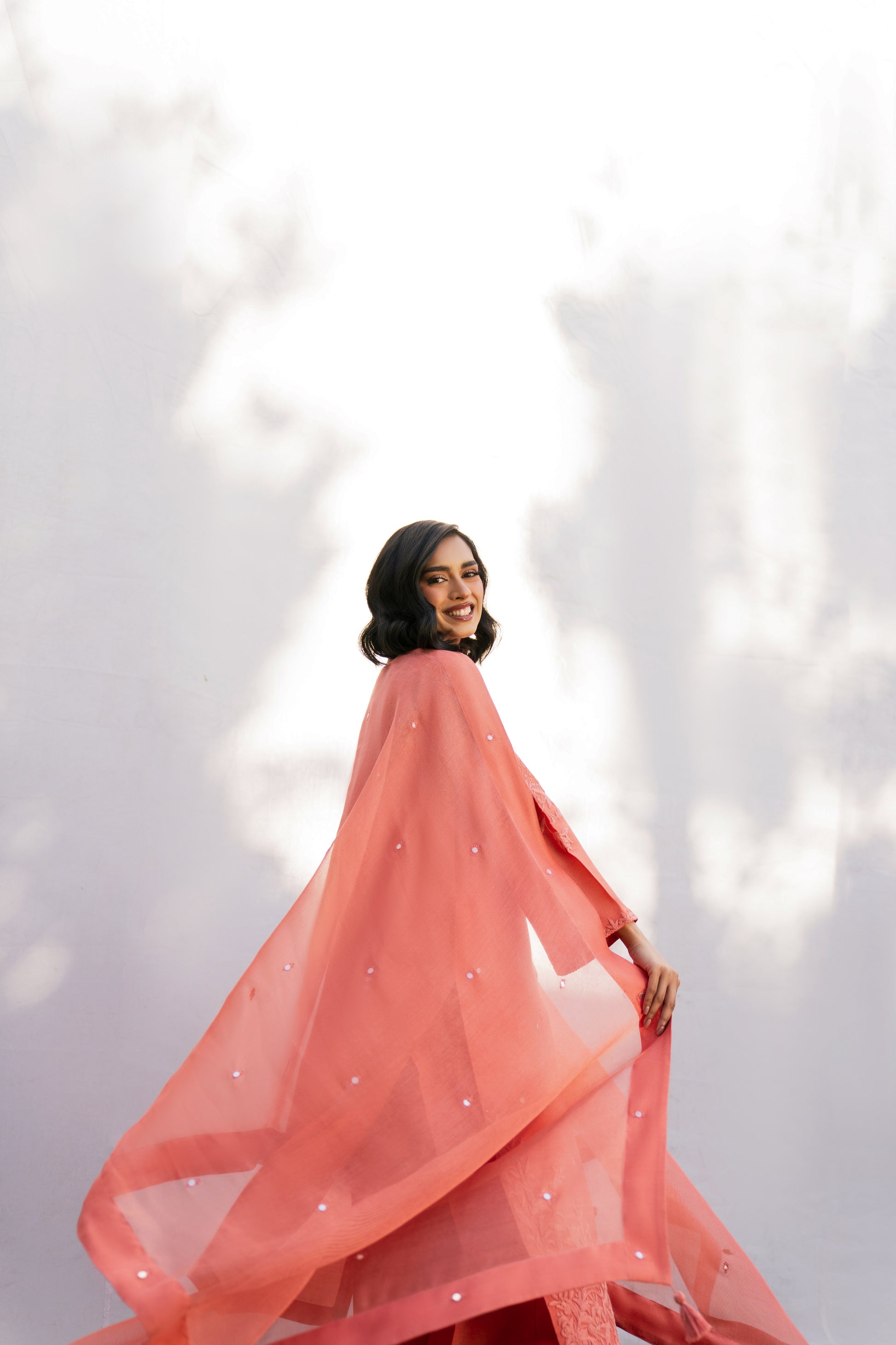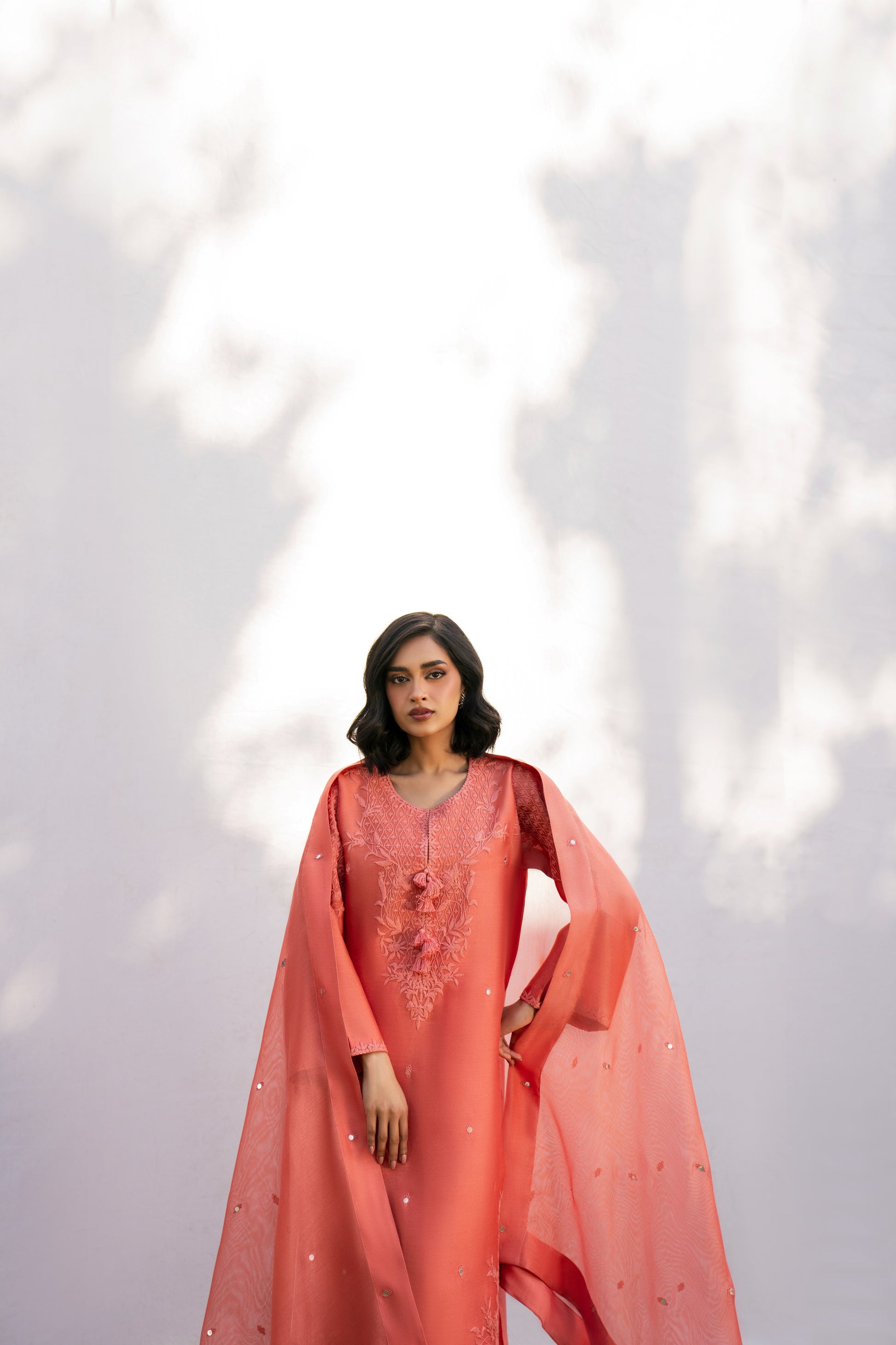 This soft coral ensemble is designed with delicate embroidery, refining its clean lines. The flowing dupatta complements the look, while the culottes (sold separately) bring balance to the ensemble, creating a fresh appearance.