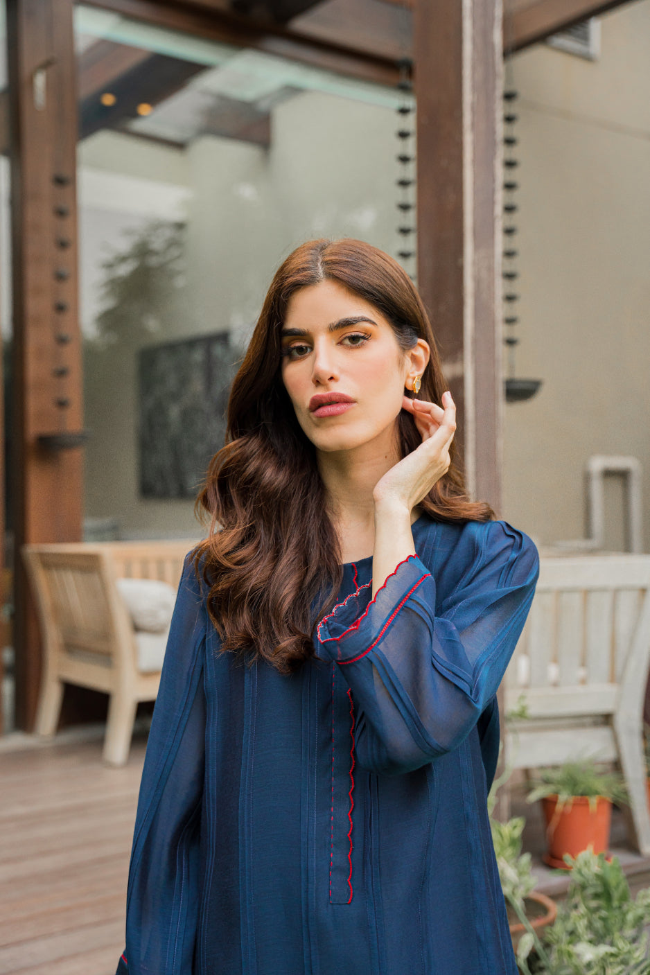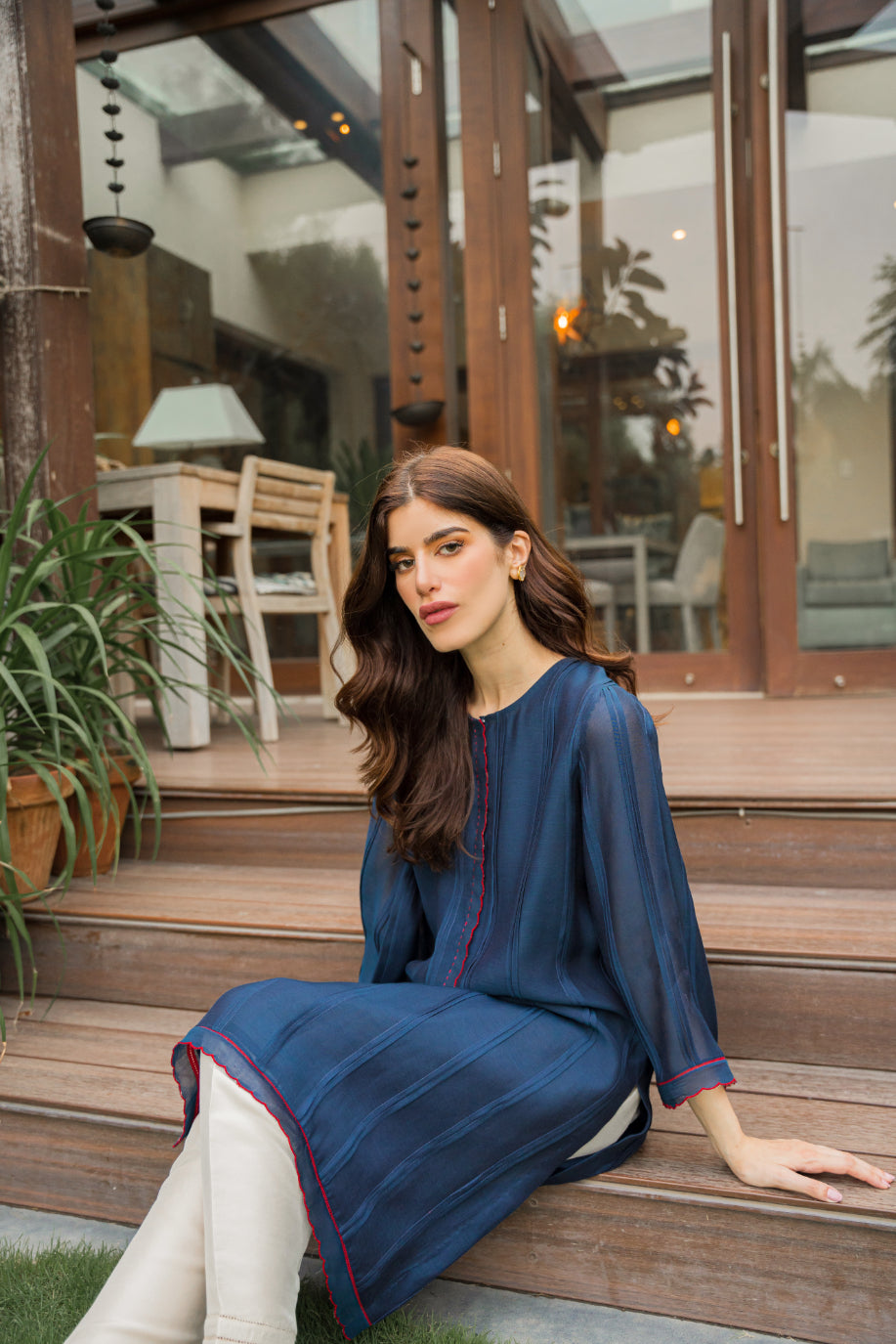 A modern loose-fitting kameez, it features expert pleating that flows down the front with pops of fire truck red piping across the hems and sleeves. This modern and timeless cut is perfect for any occasion and can shine as comfortably in the afternoon as it can in the nighttime. Pair it with our signature lowers to complete the look.