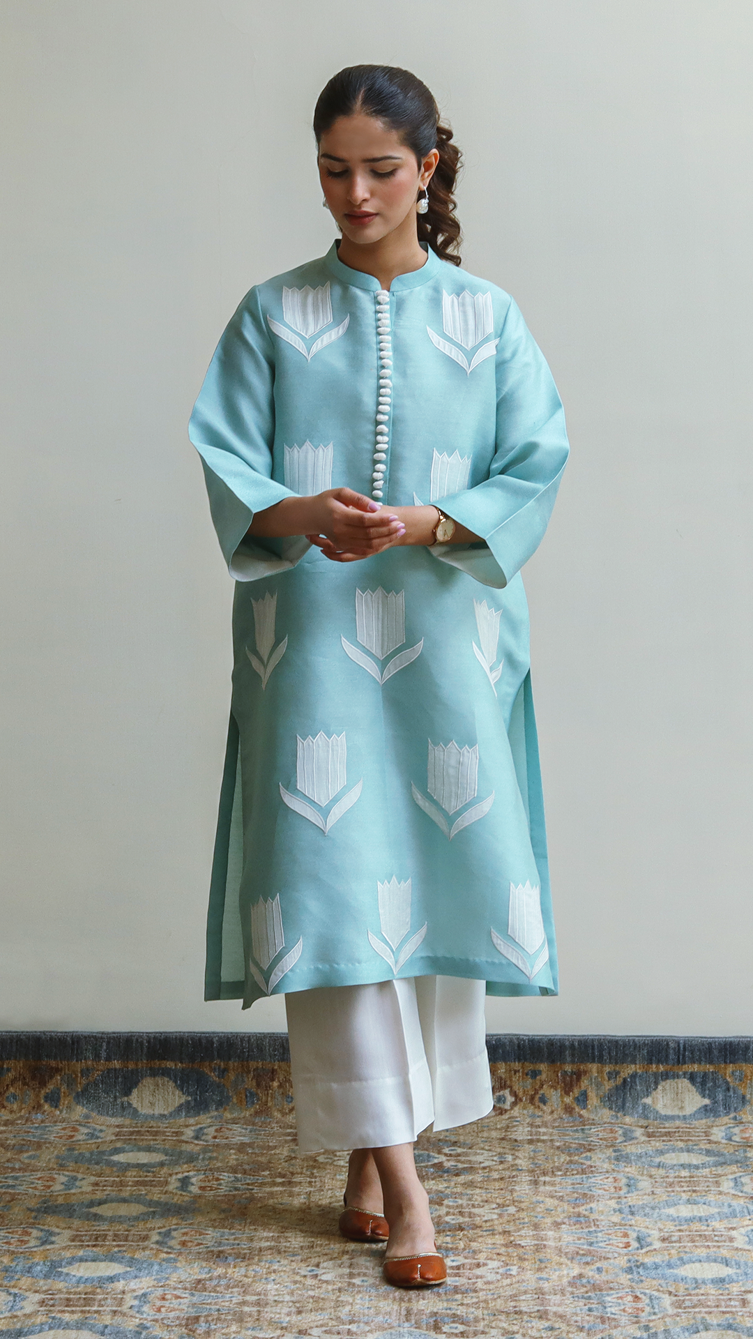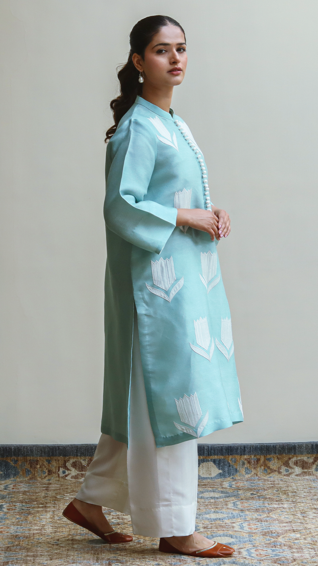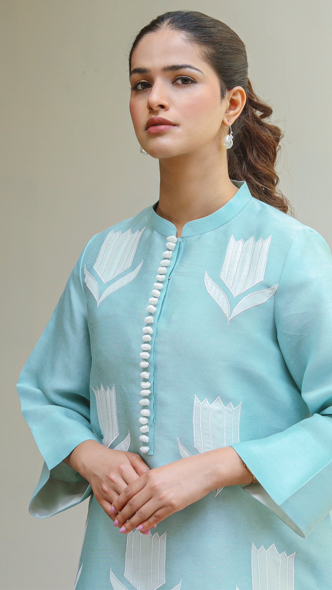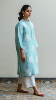 The charming cotton net “Skyward” in a lovely light sky shade, showcasing intricate appliqué work, is perfect for your easy, on-the-go style. Mix and match with our cotton net culottes.