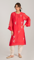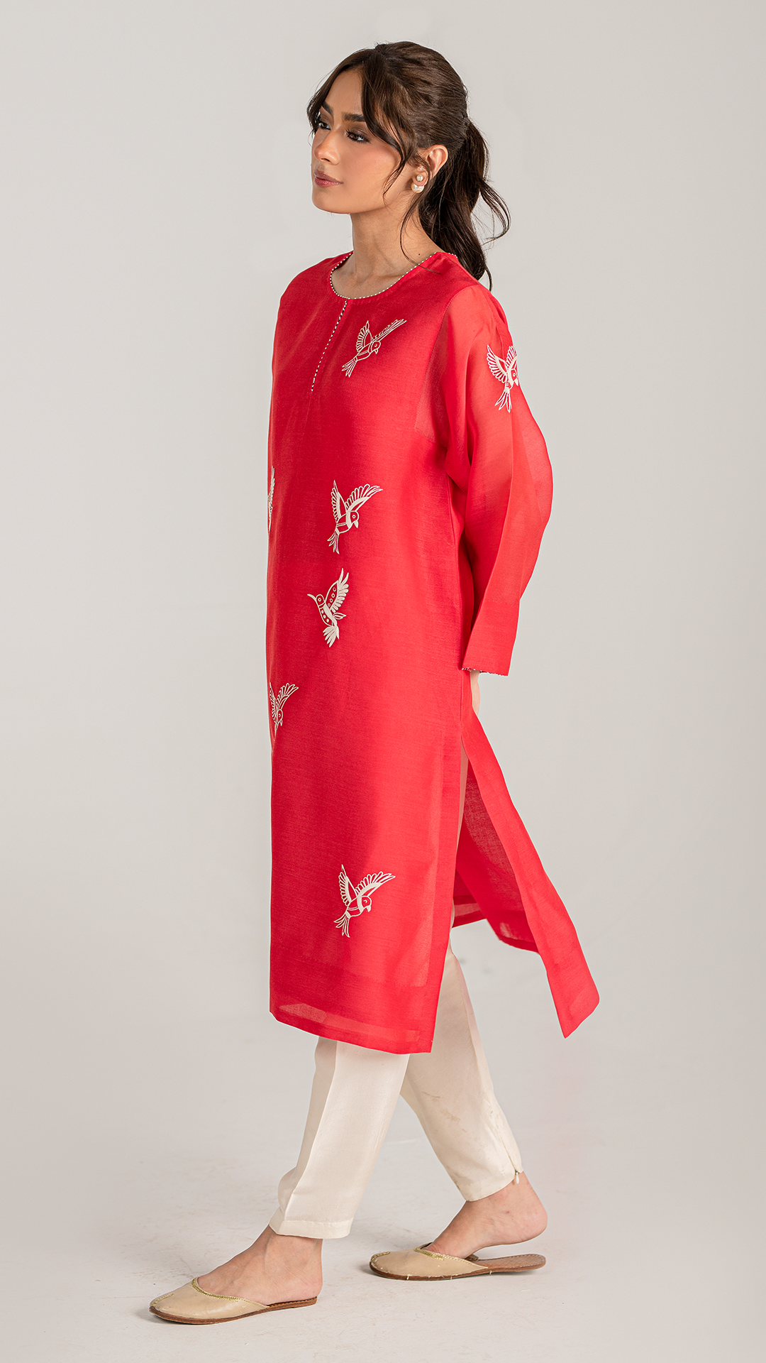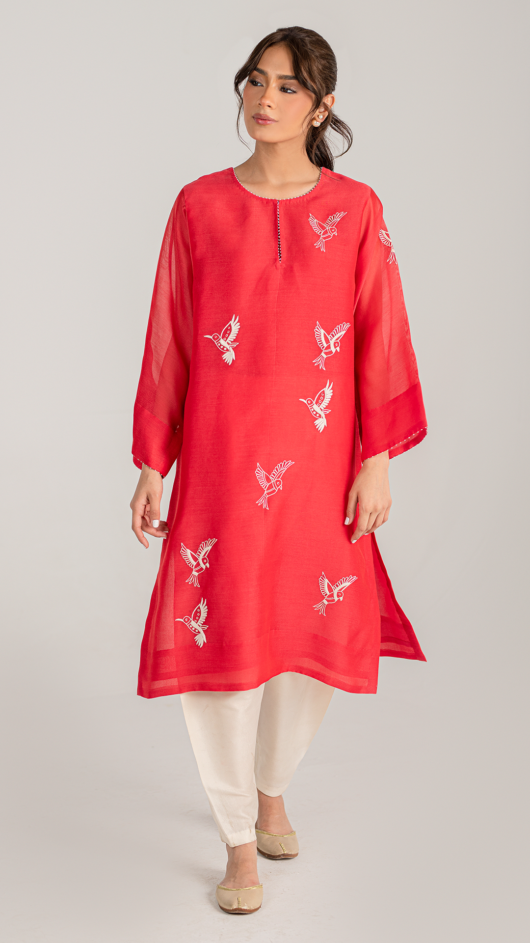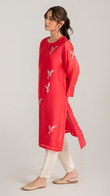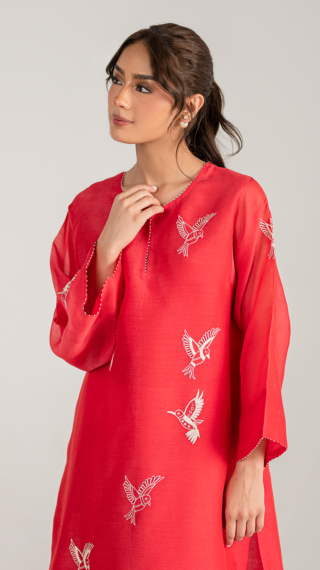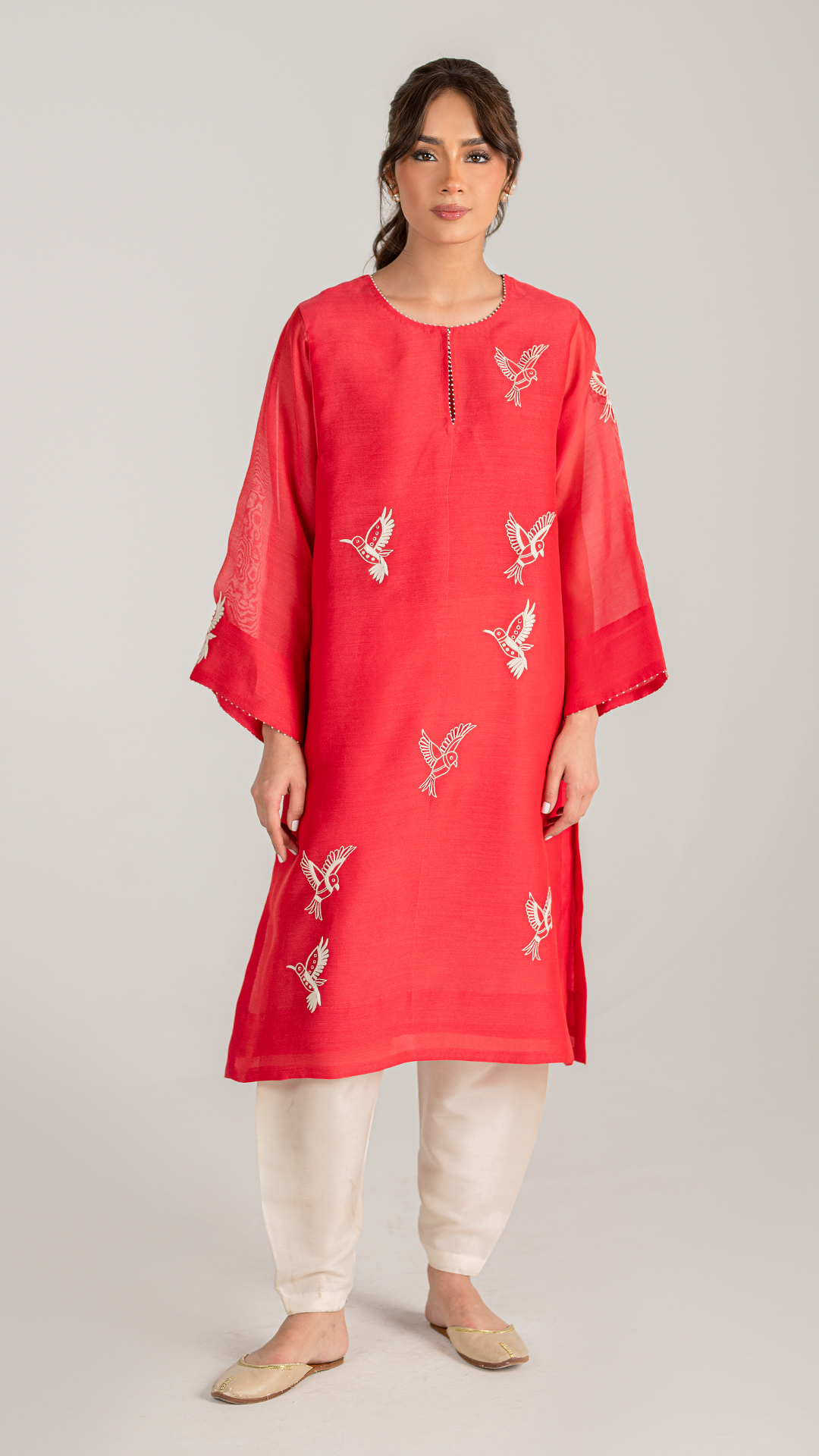 Summer vibes await with our 'Coral Crush' shirt! This vibrant coral paper lawn beauty features delicate yet dazzling hand embroidery. Pair it with our luxurious raw silk shalwar (sold separately) for a stylish and sophisticated look.