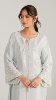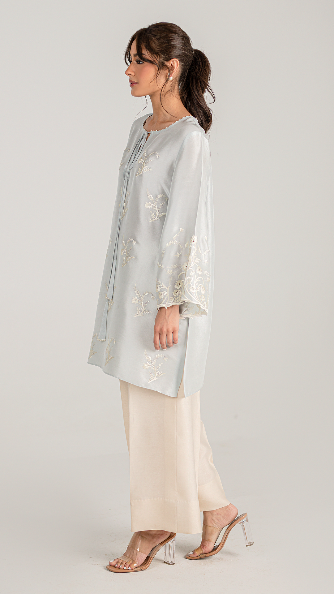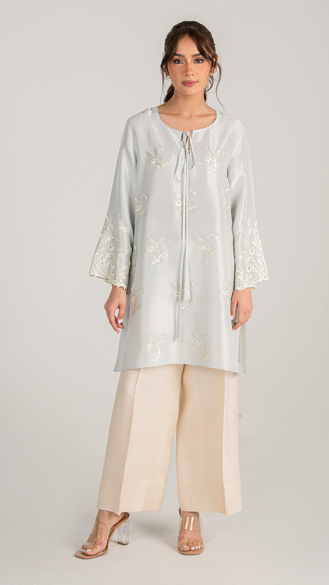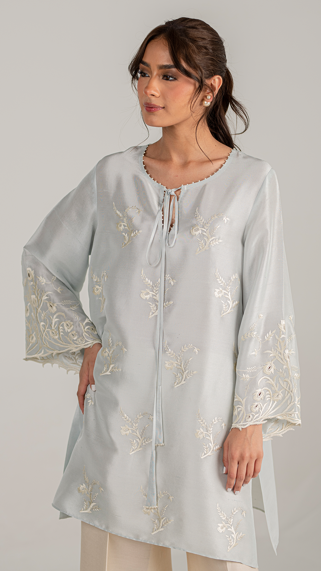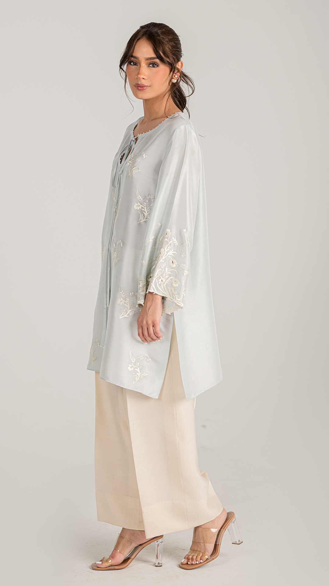 Softly shimmering, our 'Skybound Serenade' shirt whispers elegance. This heavenly sky-hued raw silk creation boasts delicate hand embroidery and resham details, evoking cloud-like radiance. Pair it with either lightweight cotton net or sumptuous silk culottes (sold separately).