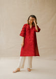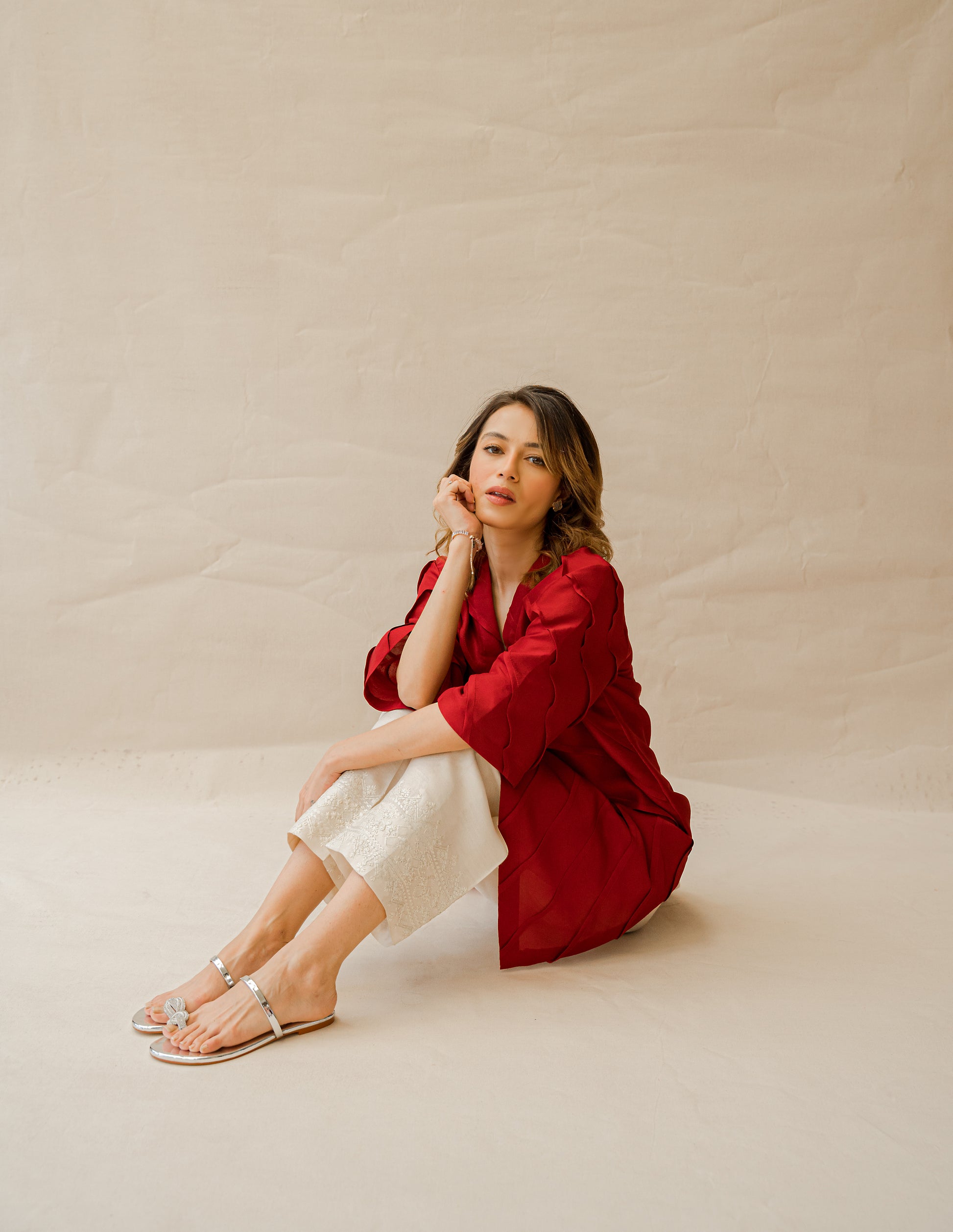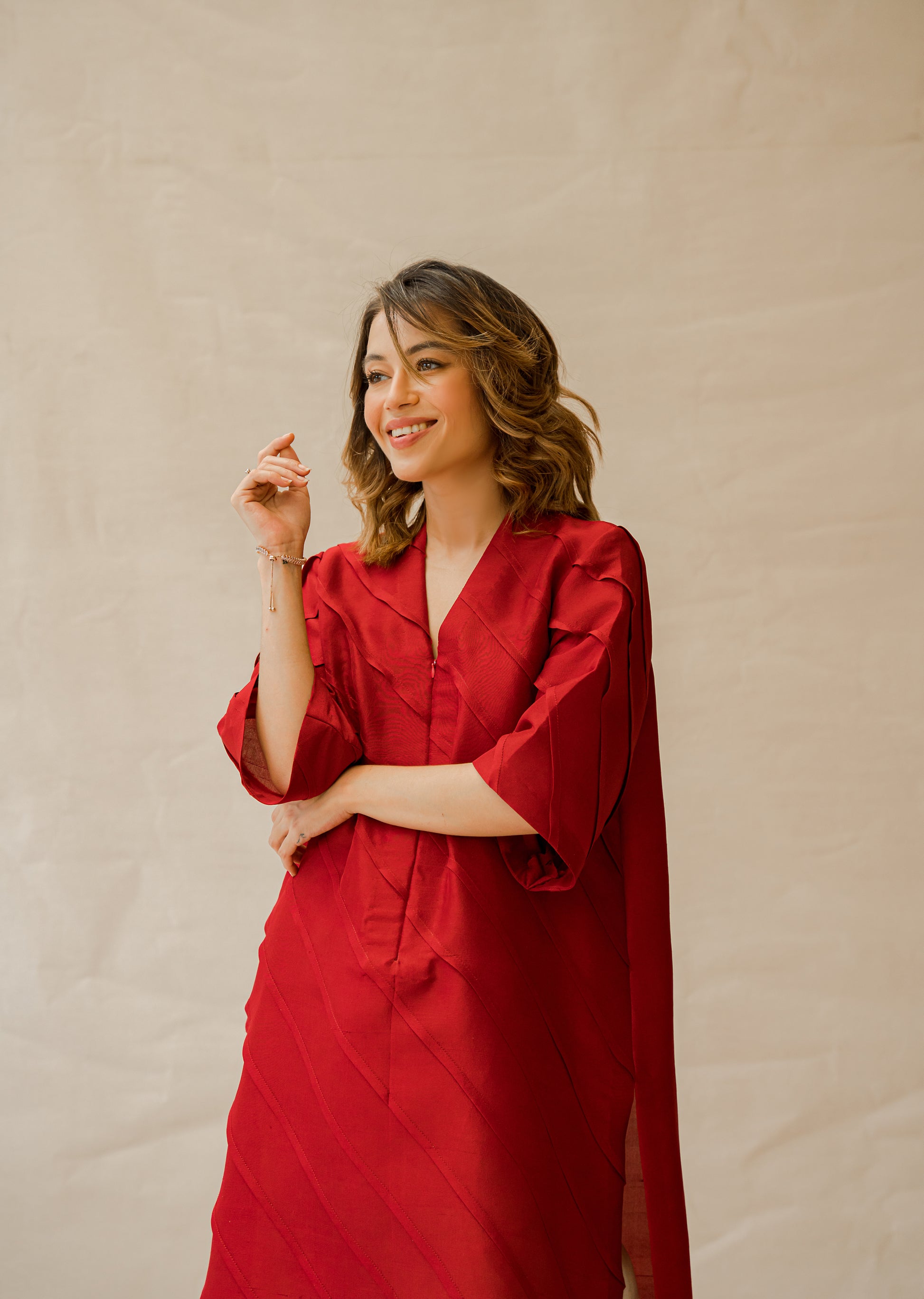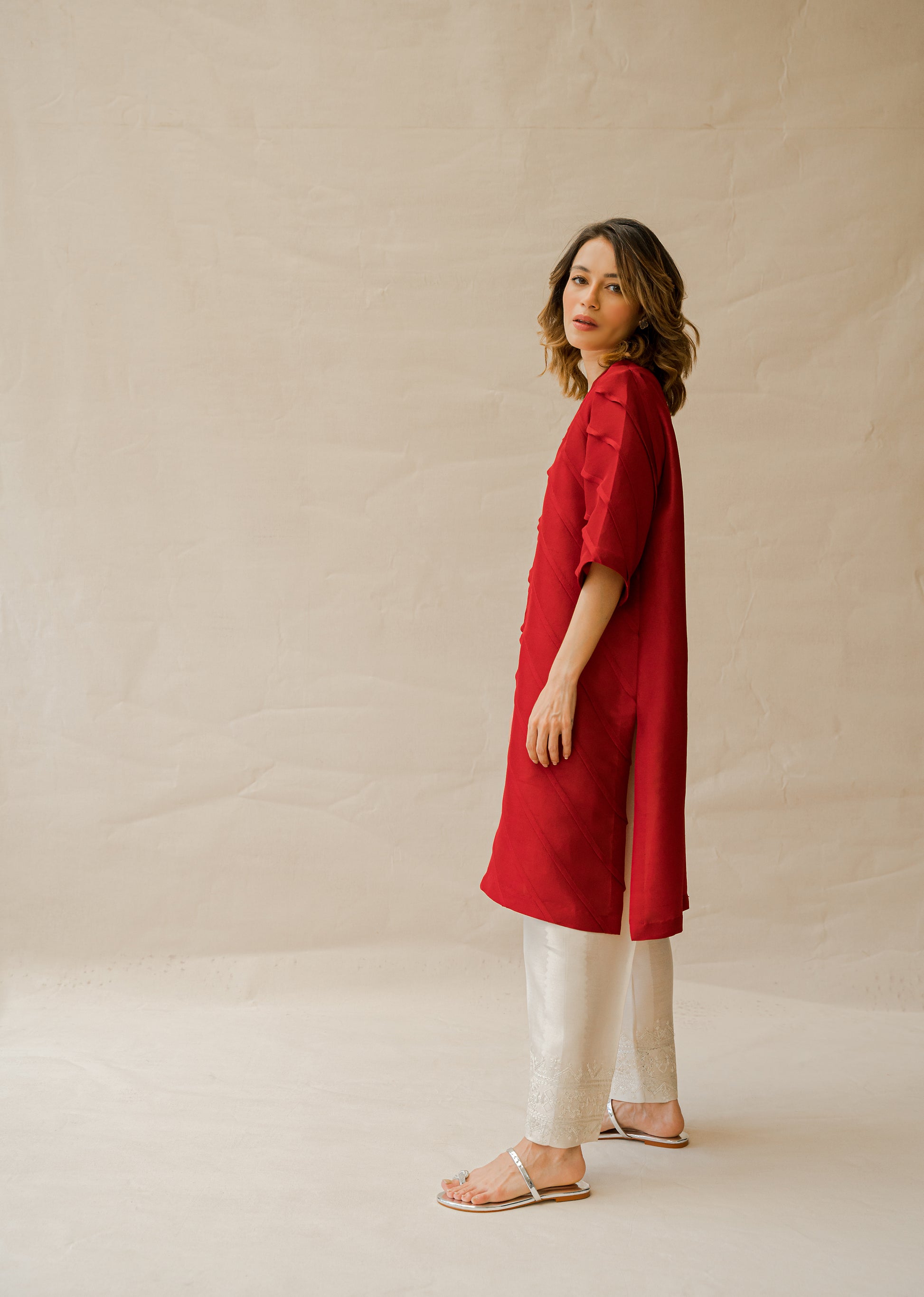 A rich oxblood-hued raw silk kameez that features pleating across the length and sleeves, and demure zipper detail at the neckline. This is a versatile formal look that can be paired with bespoke lowers.