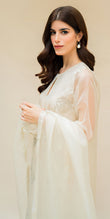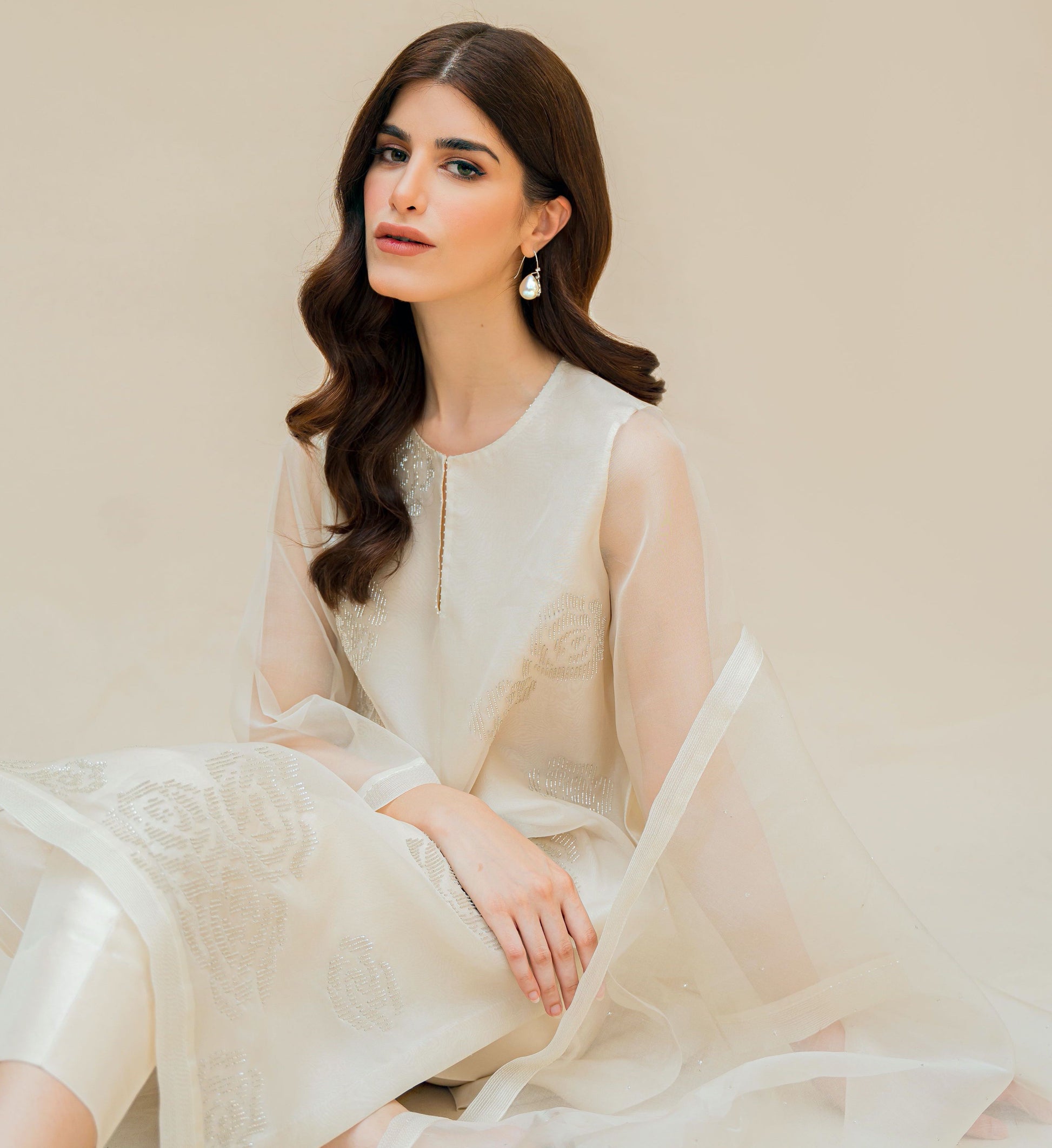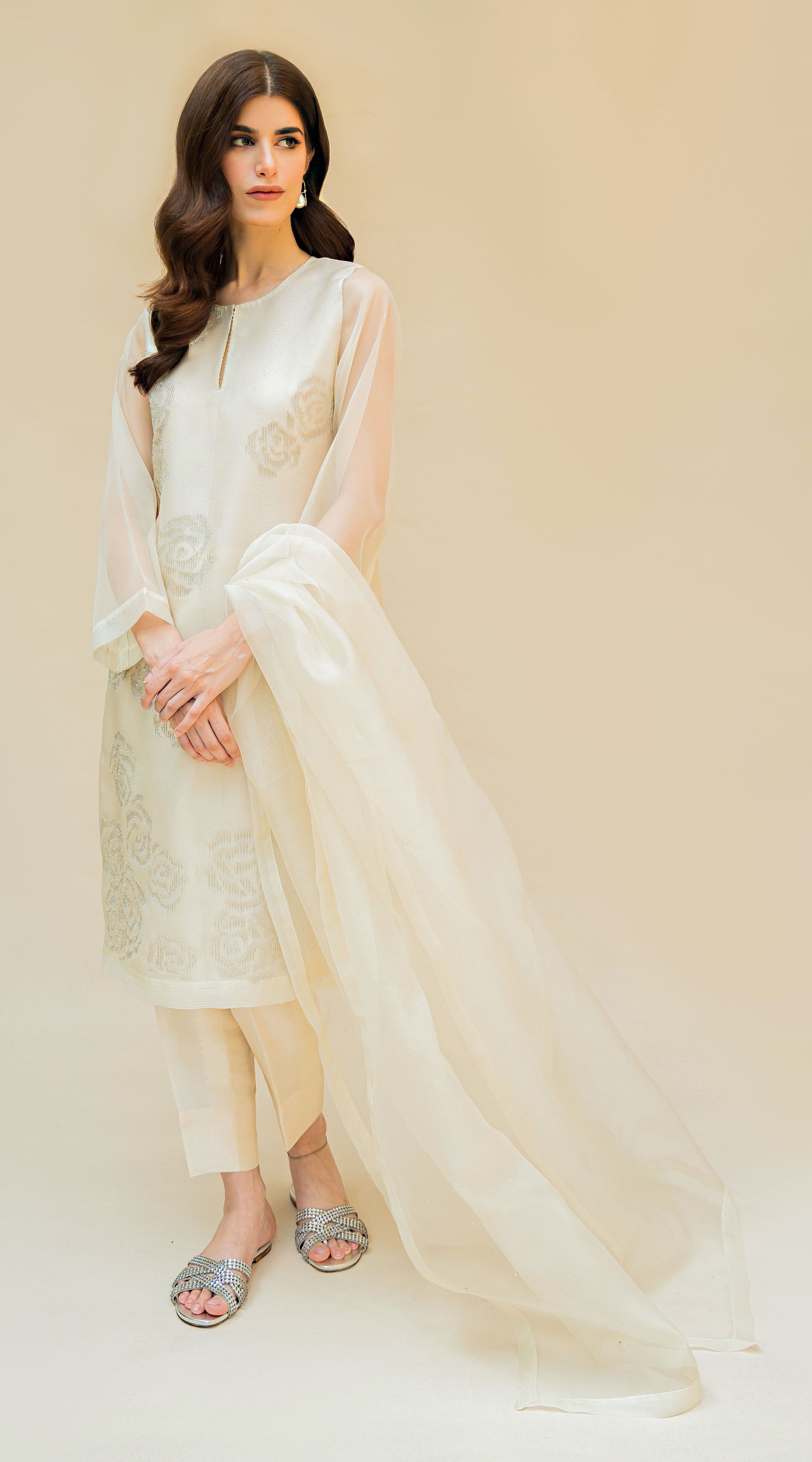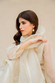 A whipped shade of cream, this dreamy outfit features rose motifs in muted threadwork that makes it shine. Paired with a beautiful organza dupatta, this is the perfect attire no matter what time of the day it is.