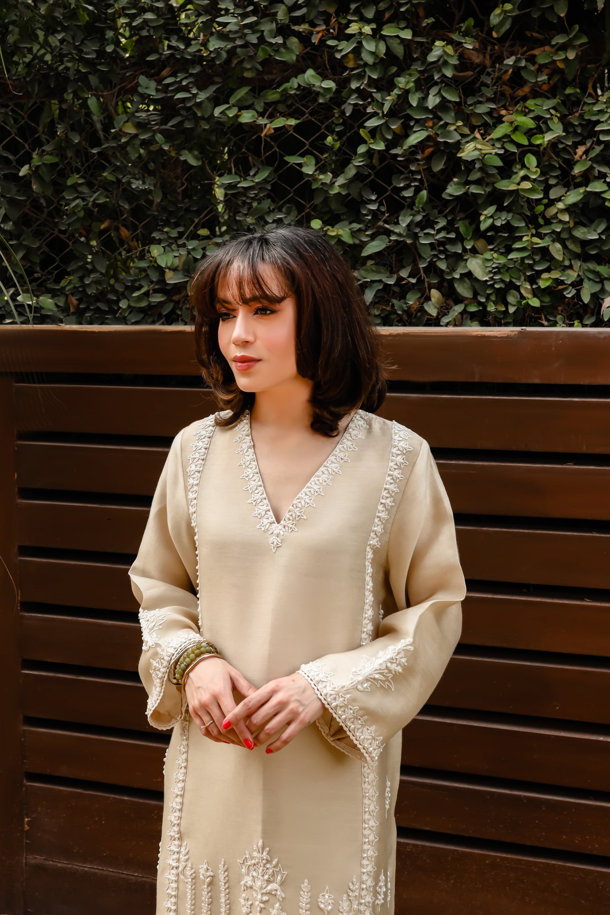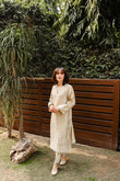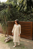 Crafted from cotton net, it features embroidery and pearl embellishments on the front and sleeves. Style yours with straight pants for an uplifted look.