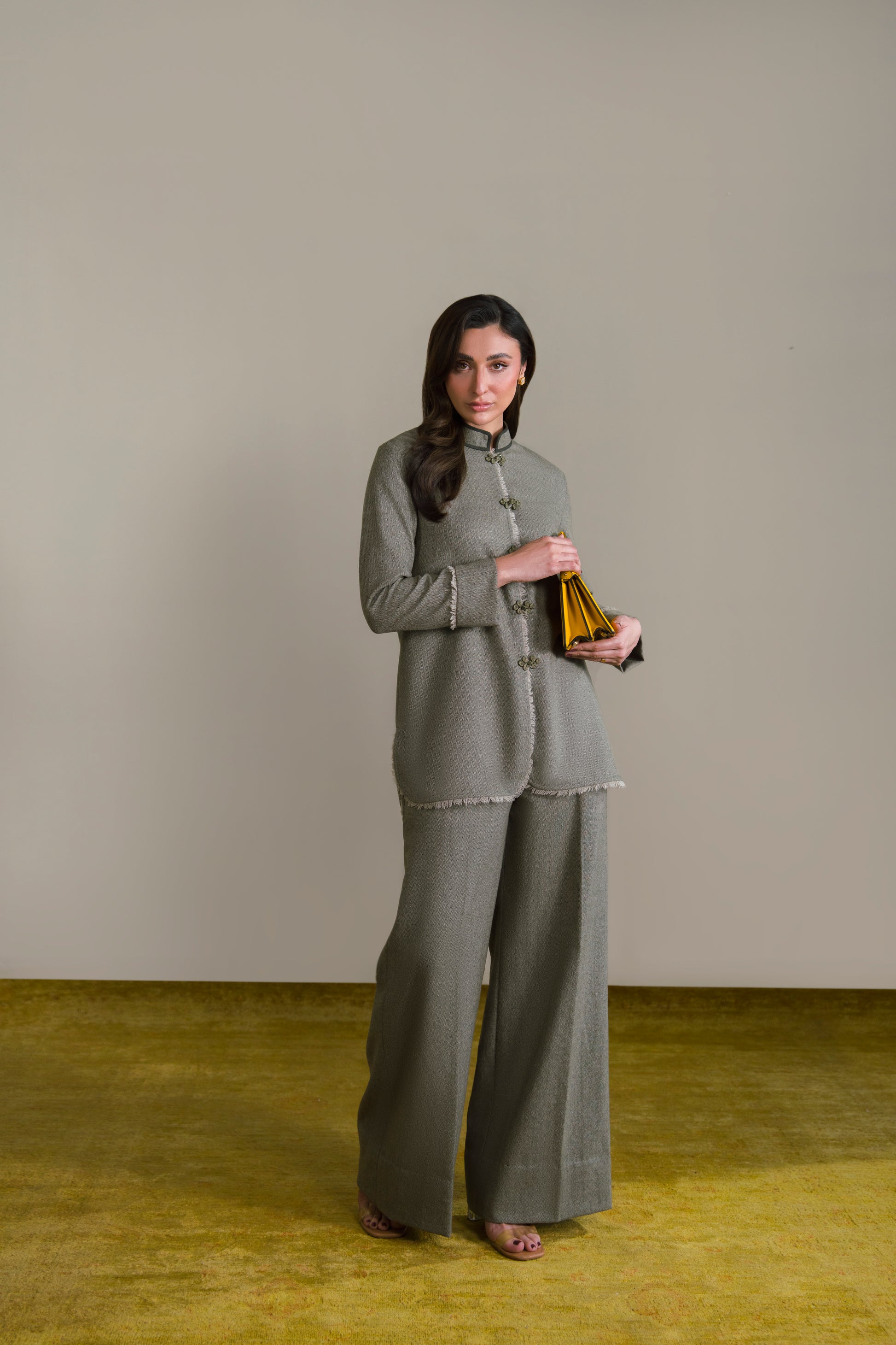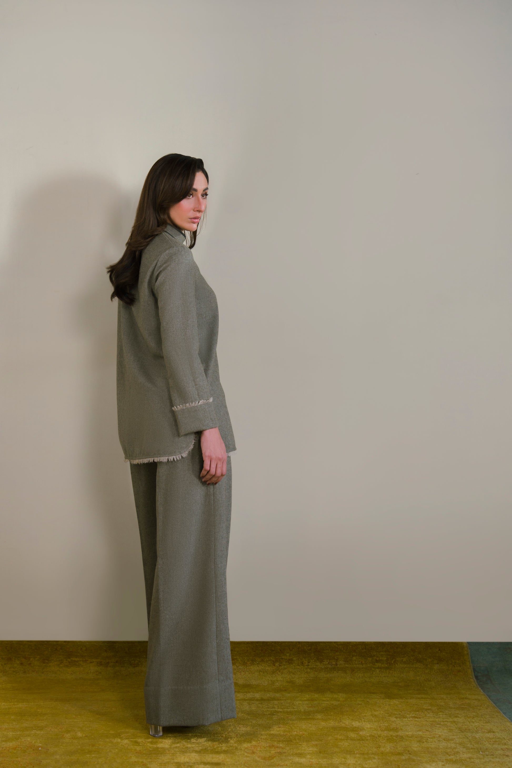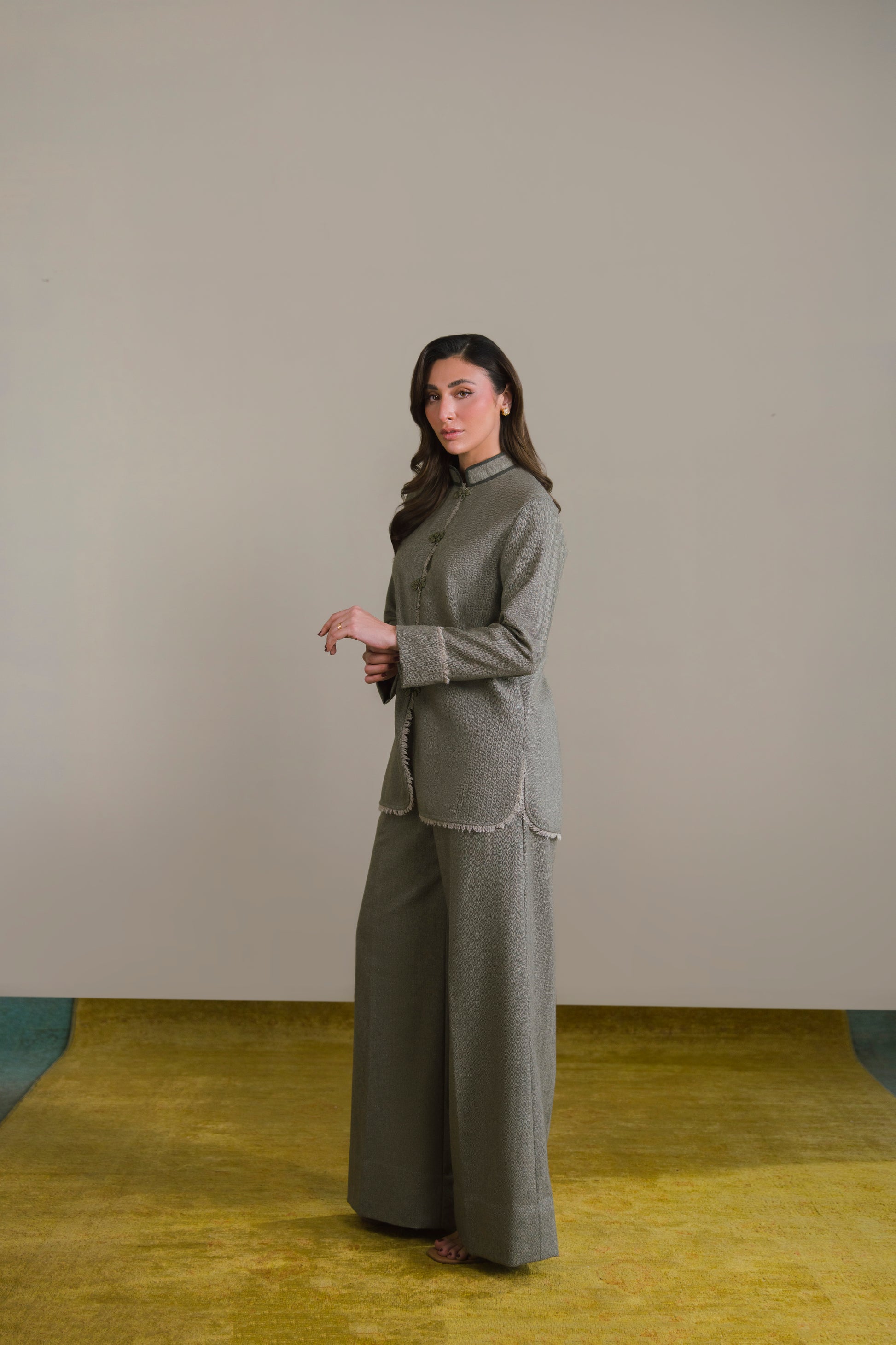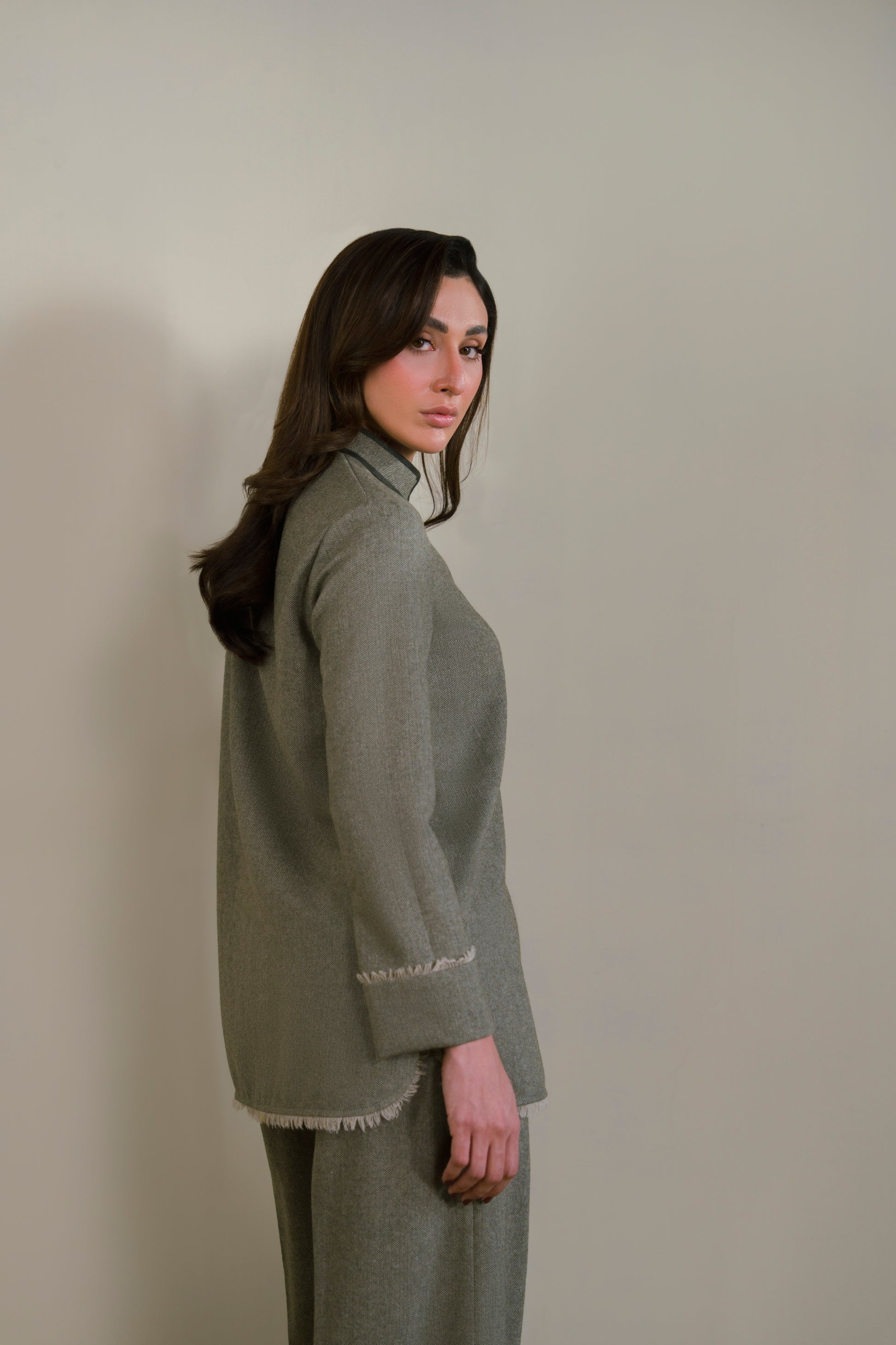 A refined winter essential crafted in soft wool, this sage green co-ord set brings structure, warmth, and understated sophistication. The shirt features a tailored front with statement fabric button accents and subtle fringed edging, creating a distinctive yet minimal look. Paired with wide-leg wool culottes, the ensemble offers clean lines and effortless elegance with a modern, textured finish.