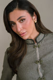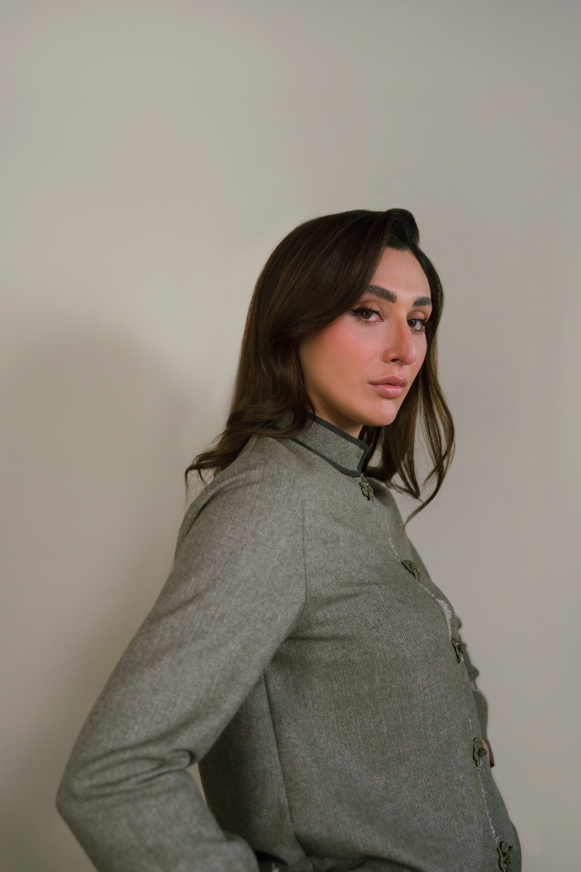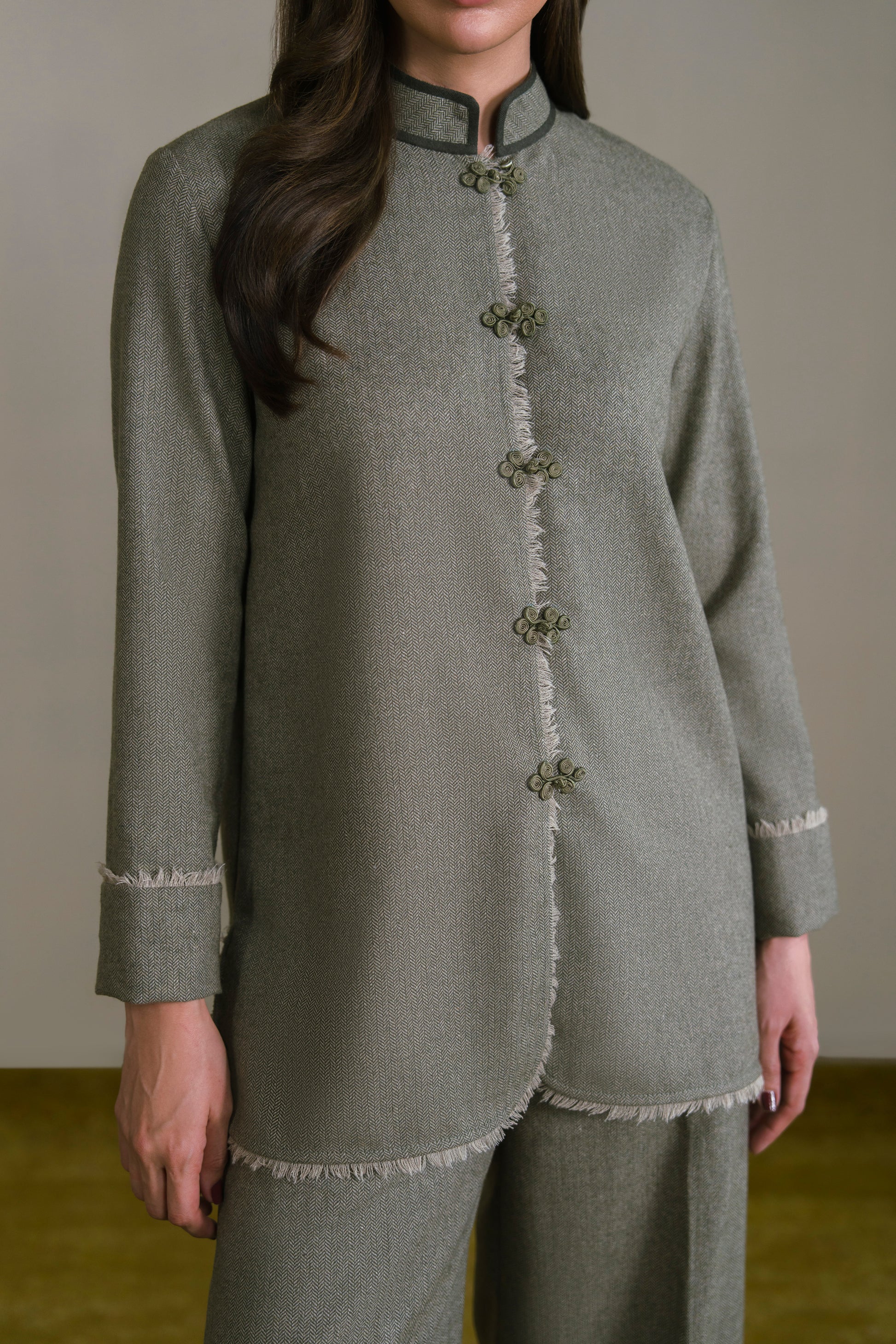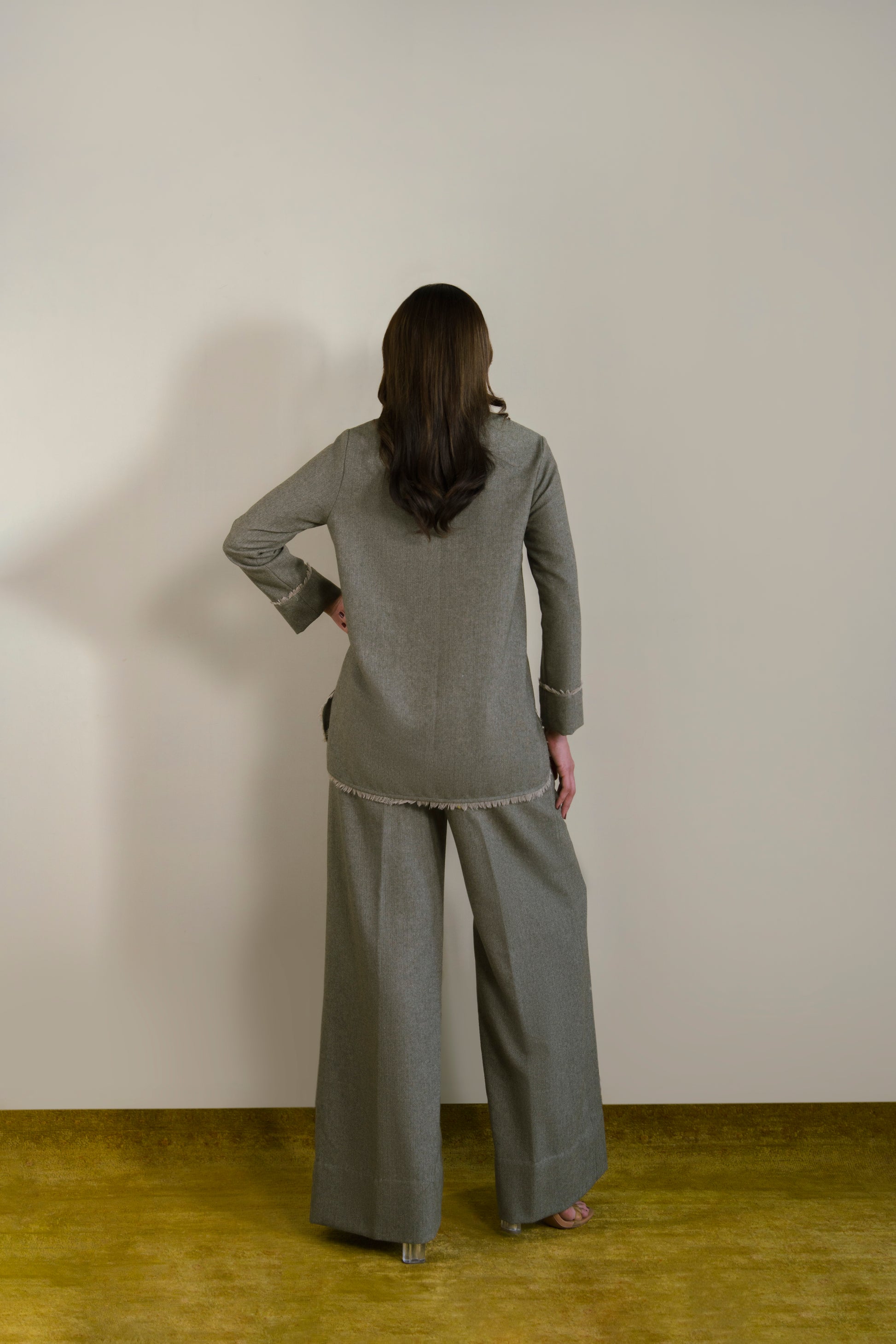 A refined winter essential crafted in soft wool, this sage green co-ord set brings structure, warmth, and understated sophistication. The shirt features a tailored front with statement fabric button accents and subtle fringed edging, creating a distinctive yet minimal look. Paired with wide-leg wool culottes, the ensemble offers clean lines and effortless elegance with a modern, textured finish.