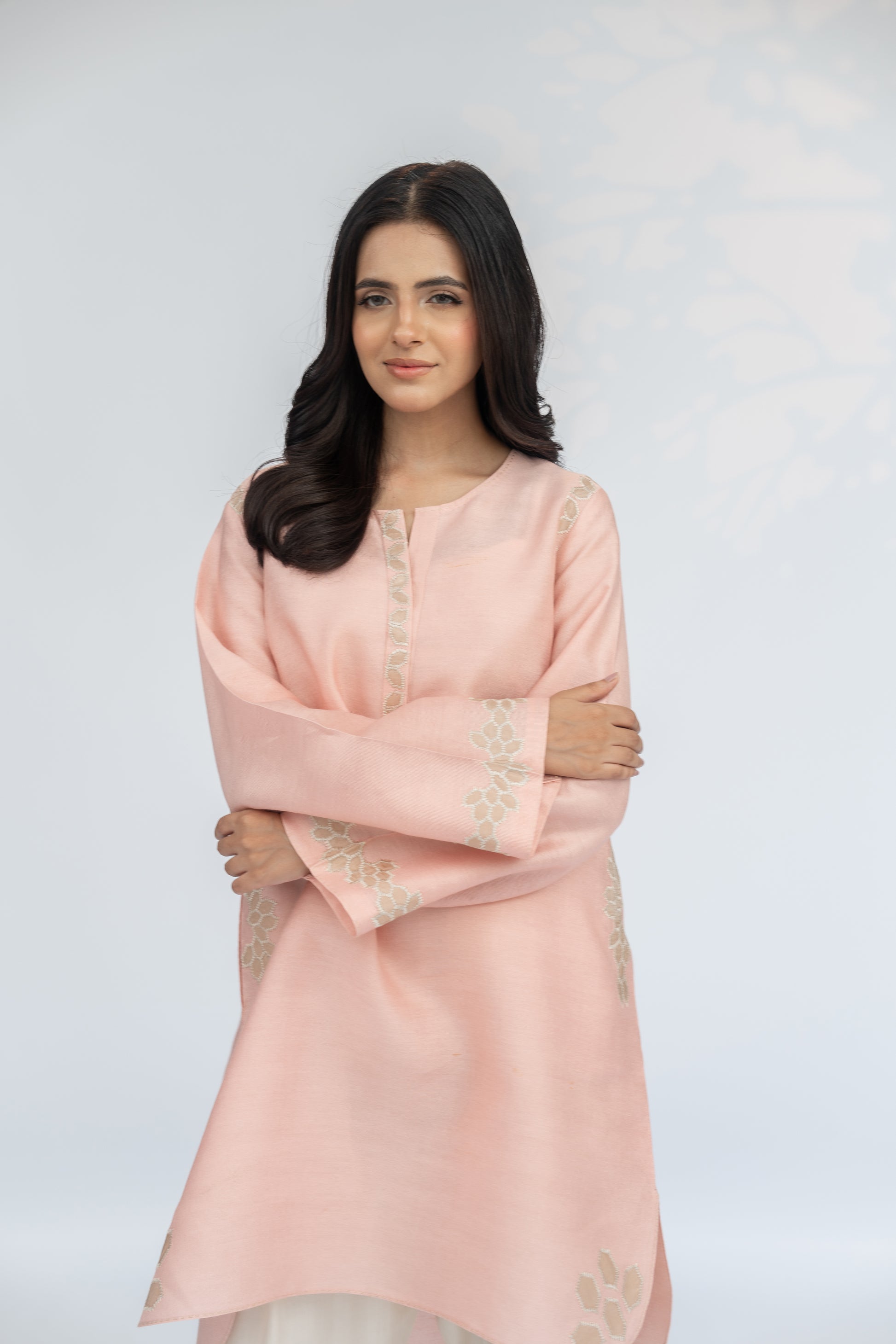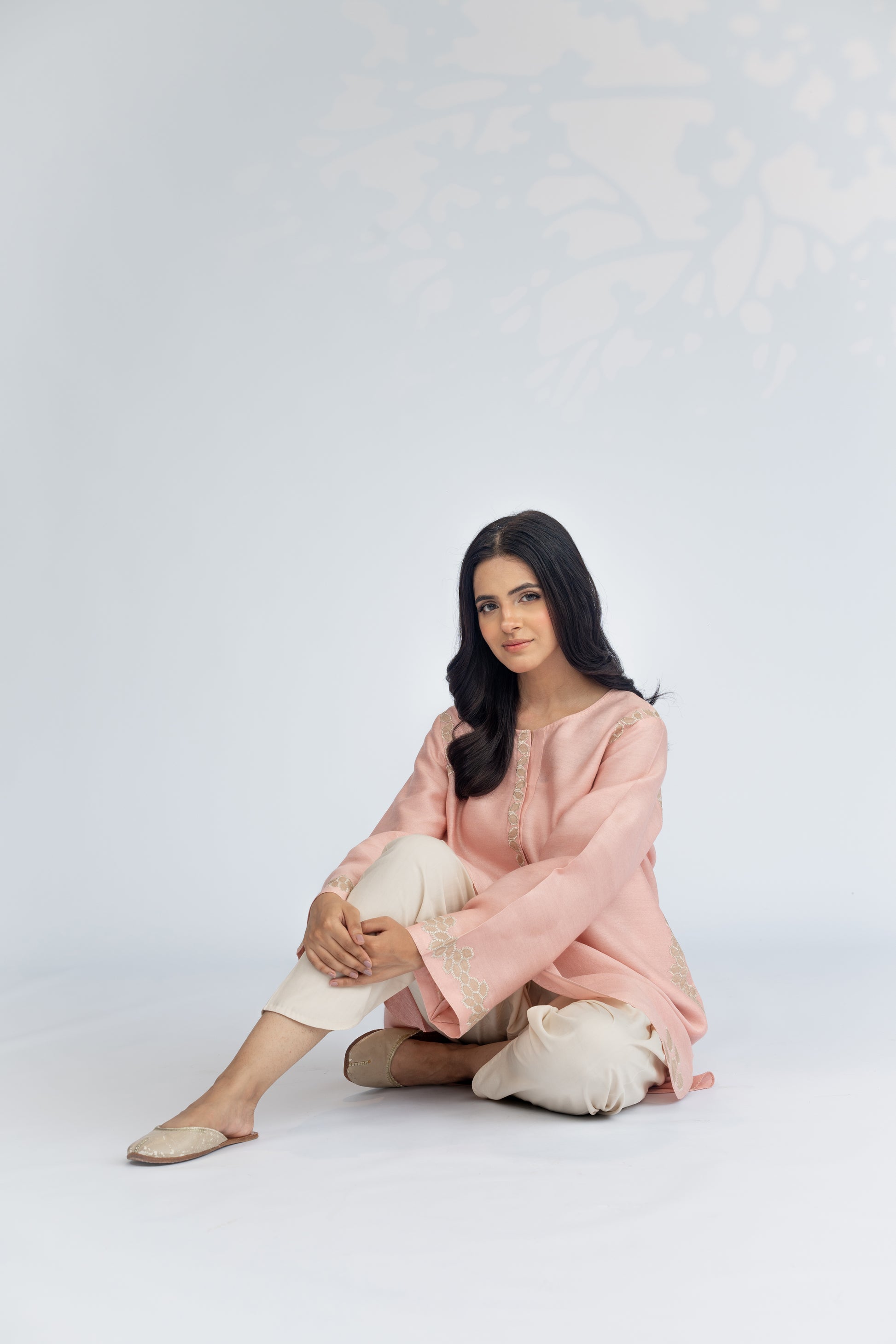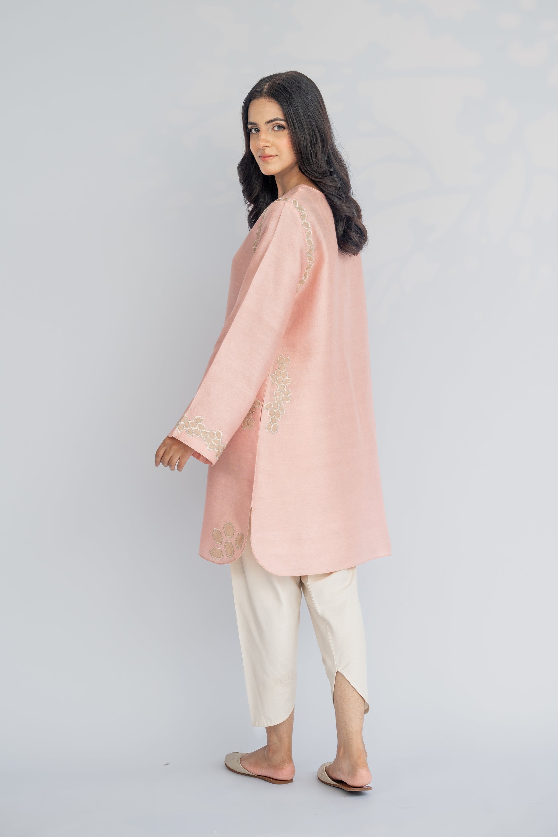 This tea-pink shirt in delicate Khaddi net radiates feminine charm. Adorned with intricate applique work, the 34-inch length creates a graceful, elongated silhouette. The airy texture of kaddi net paired with detailed craftsmanship makes it a perfect choice for festive and semi-formal occasions.