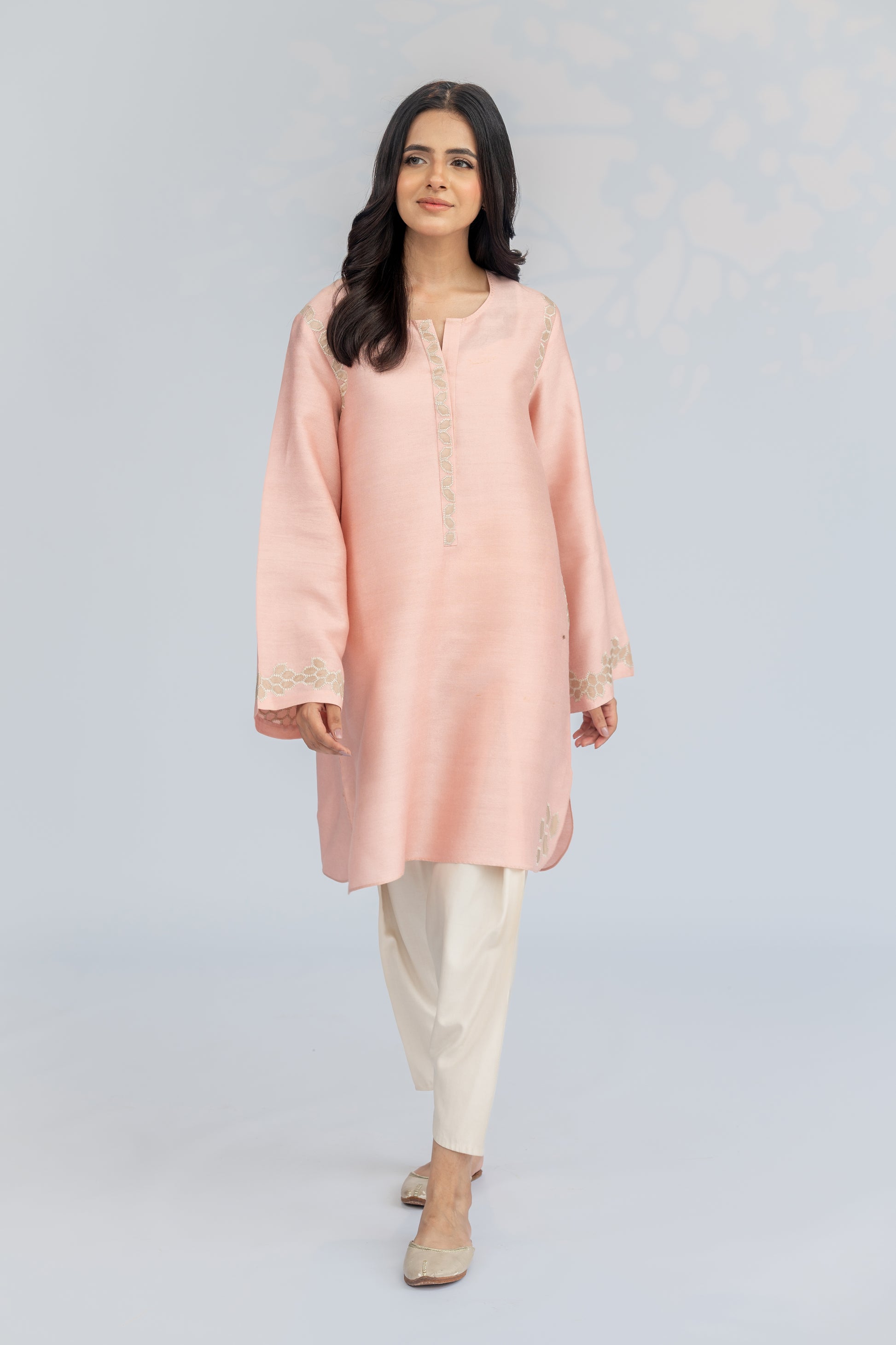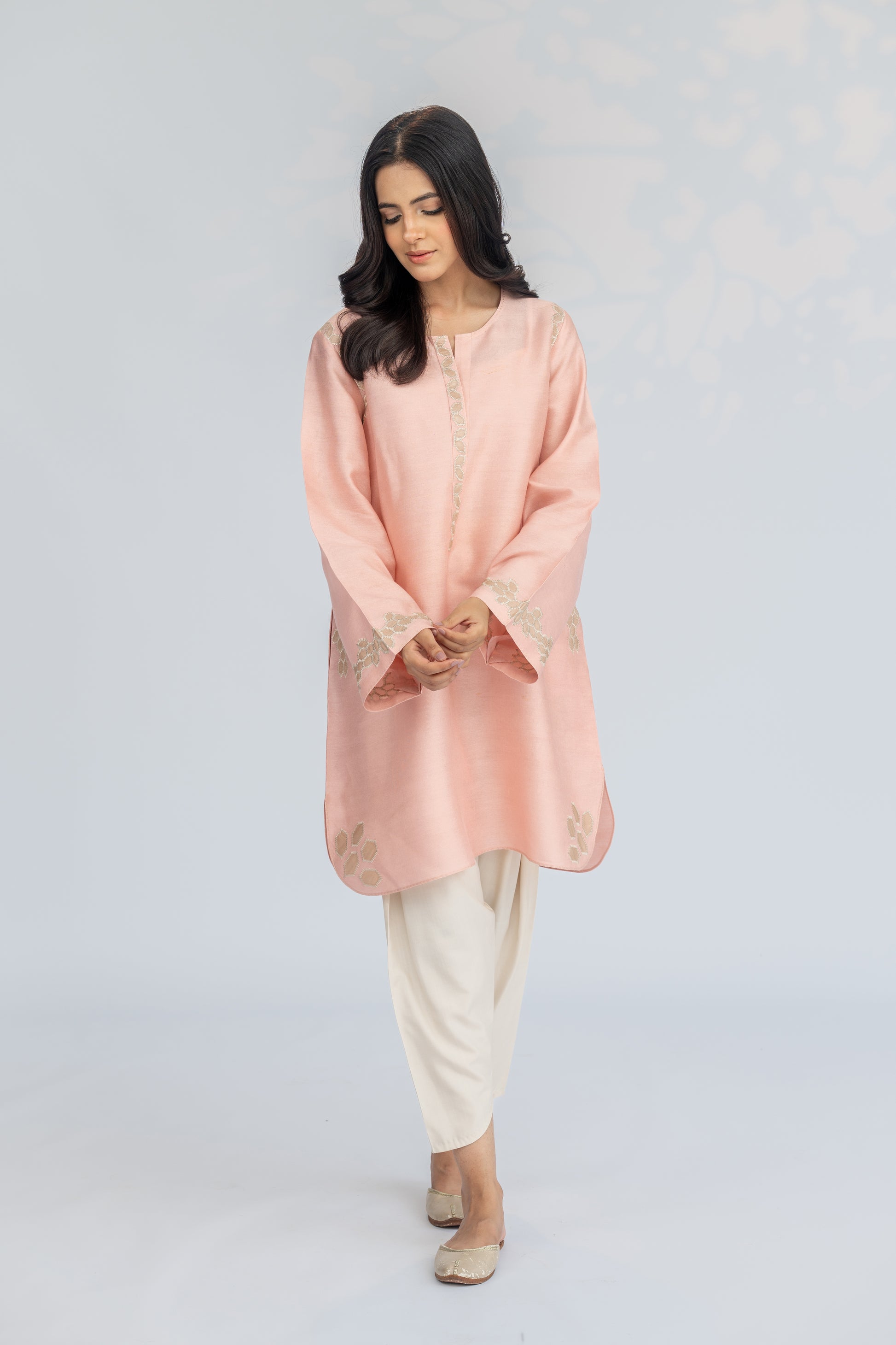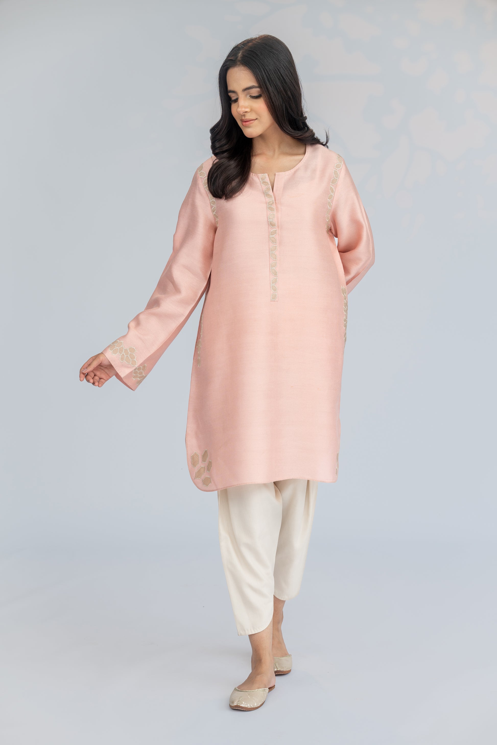 This tea-pink shirt in delicate Khaddi net radiates feminine charm. Adorned with intricate applique work, the 34-inch length creates a graceful, elongated silhouette. The airy texture of kaddi net paired with detailed craftsmanship makes it a perfect choice for festive and semi-formal occasions.