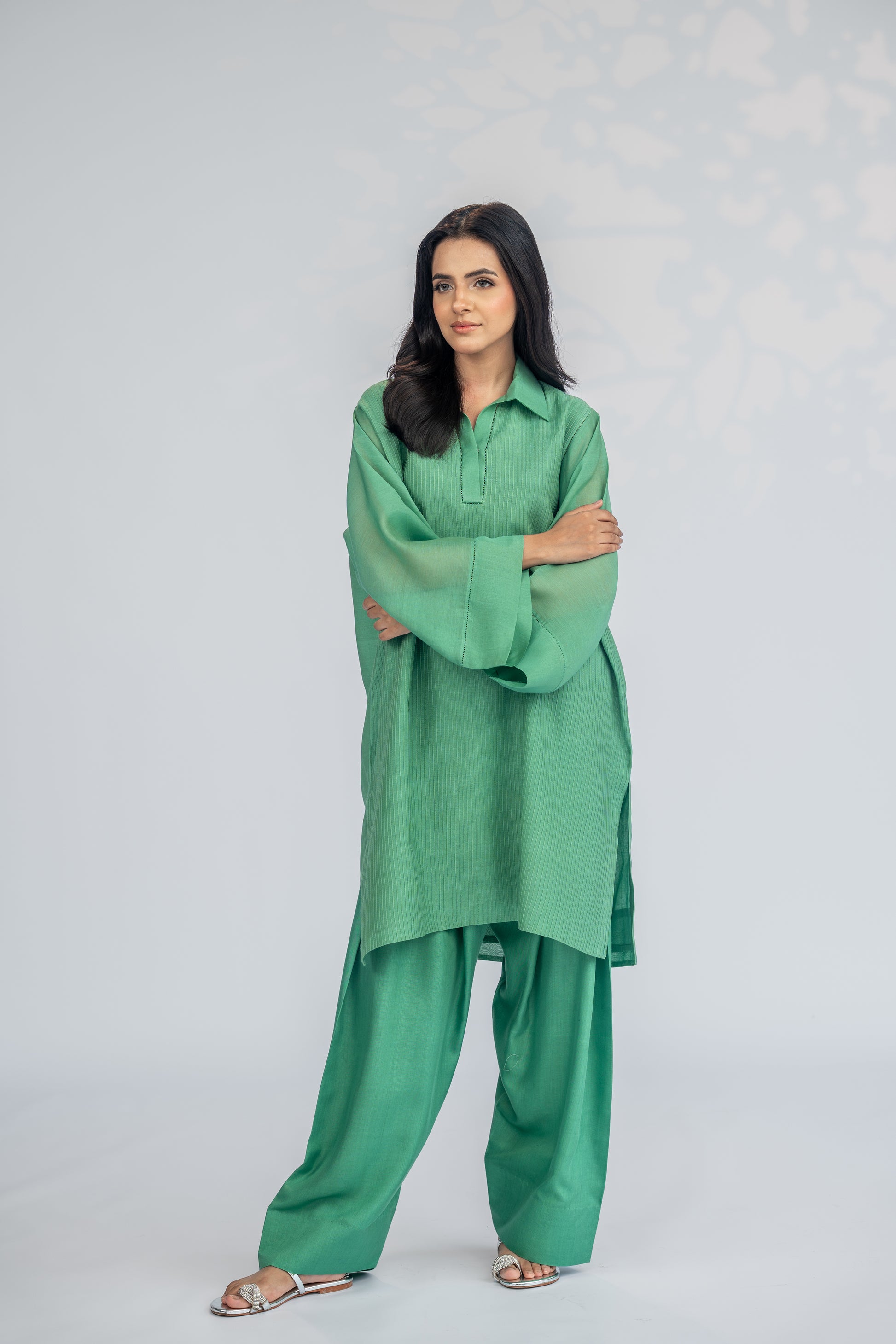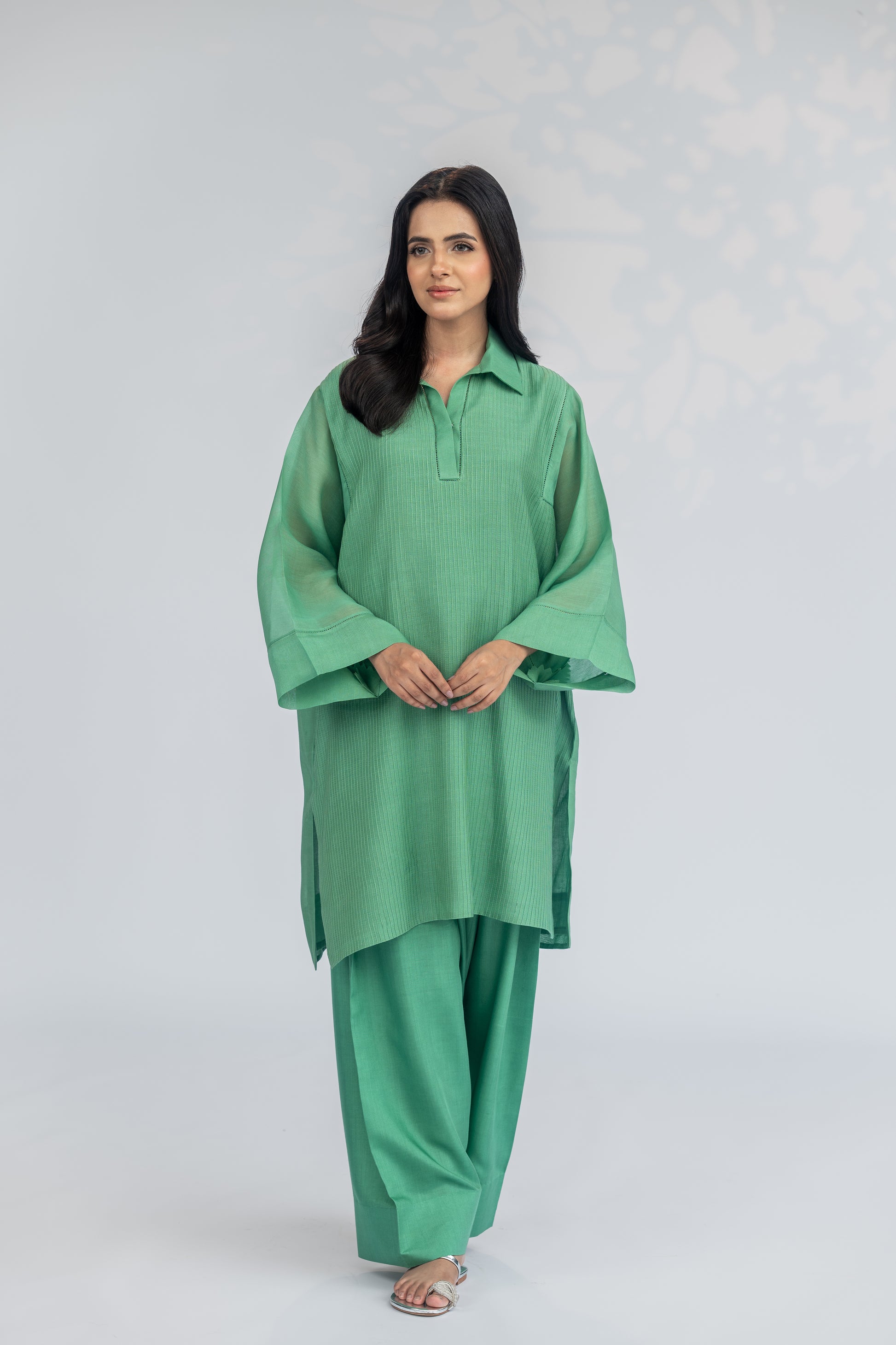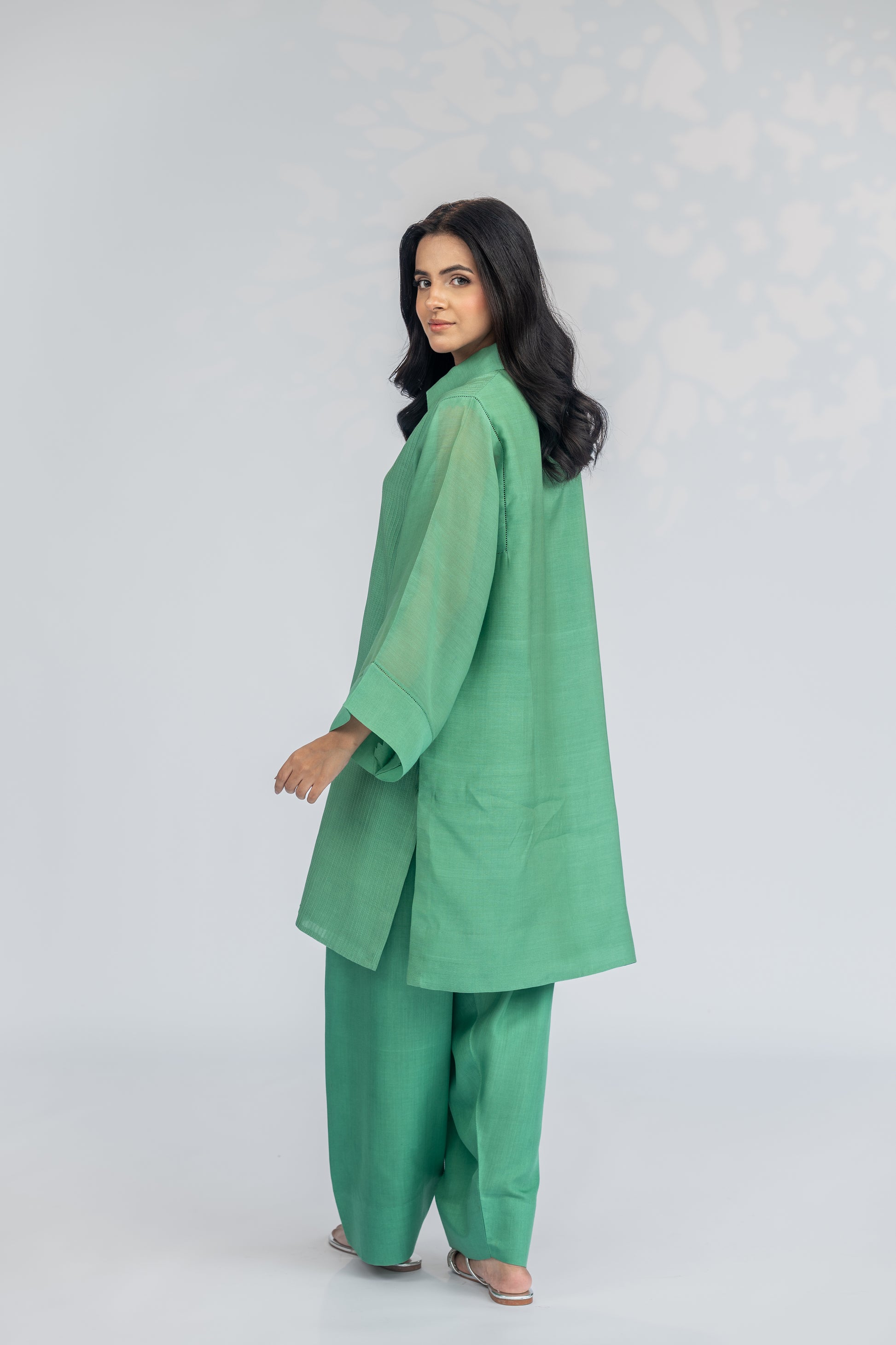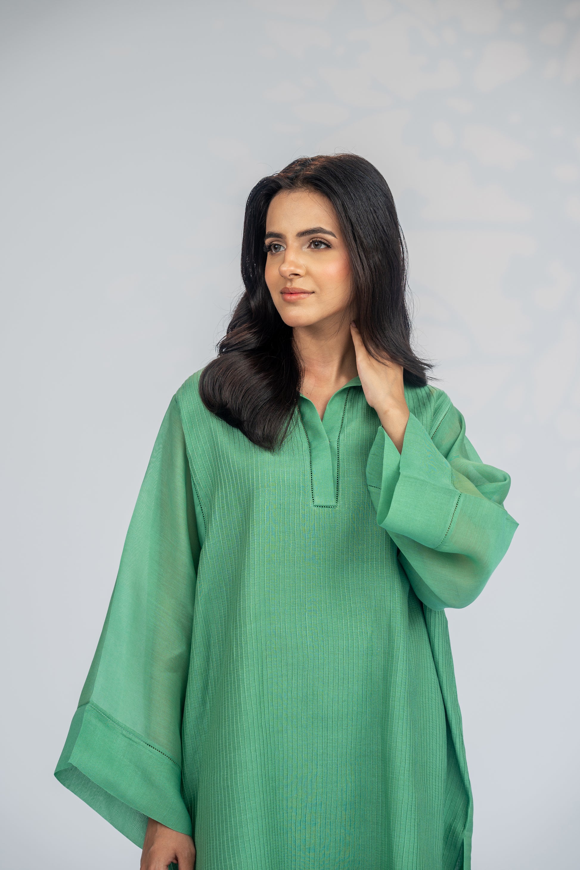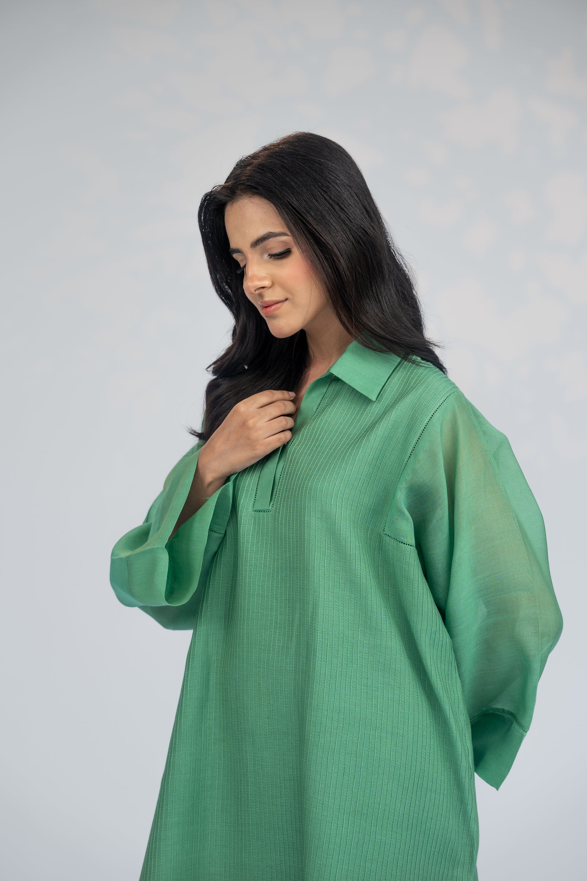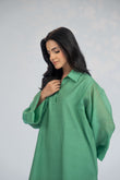 This sea-green shirt in luxurious paper silk embodies understated elegance. Enhanced with refined pintex work on the front, its graceful 34-inch length offers a flattering silhouette perfect for both day and evening wear. The subtle sheen of paper silk combined with the structured detailing adds timeless charm to the piece.