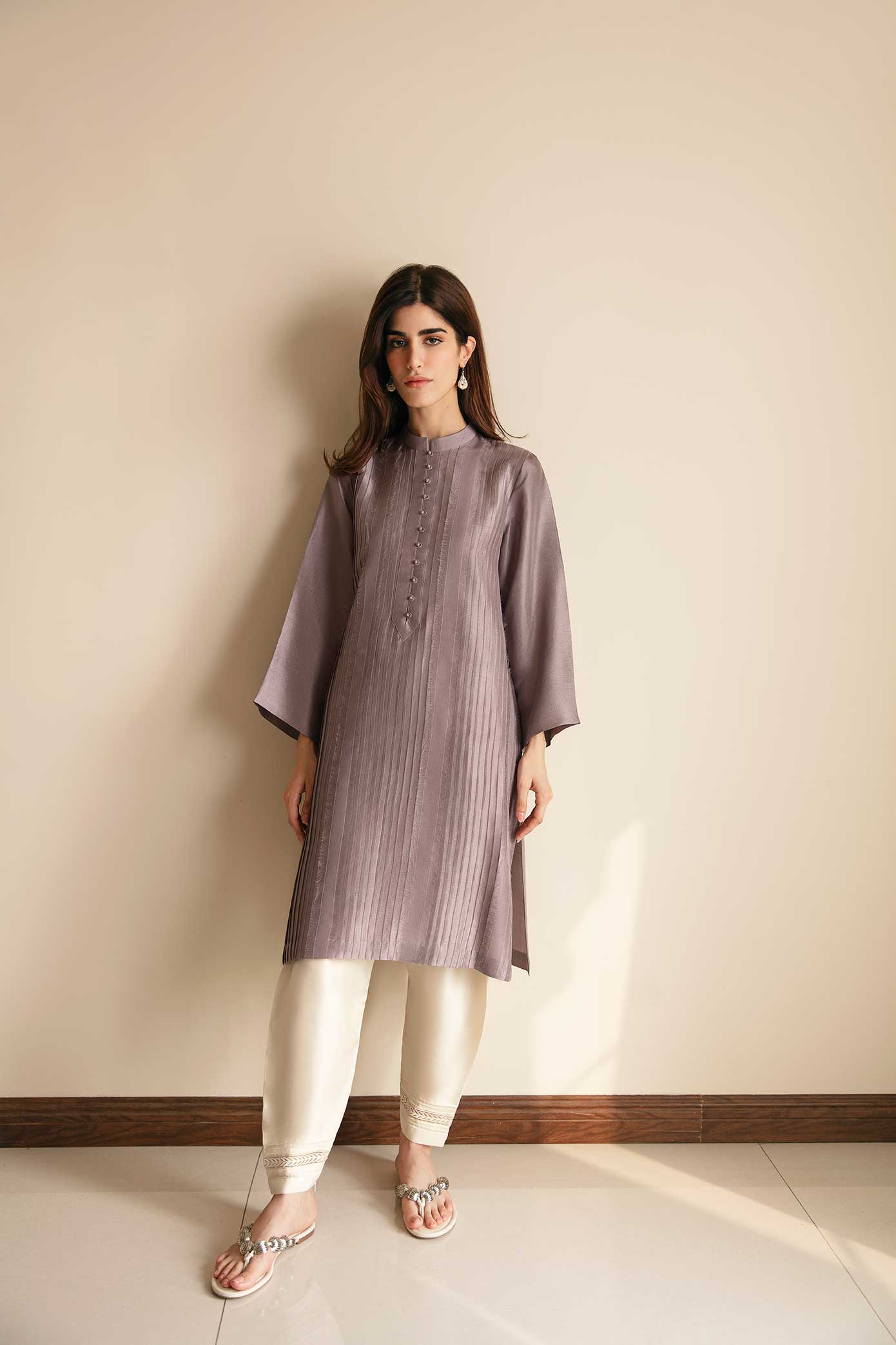 Lavender Canvas - a symphony of soothing elegance that redefines every wardrobe essential. The straight pleated design is an ode to understated luxury, creating a silhouette that flatters and flows effortlessly. Enveloped in the gentle embrace of raw silk, the fabric’s texture and luster evoke a sense of timeless charm, while the delicate shade of dull lavender captures the essence of calm.