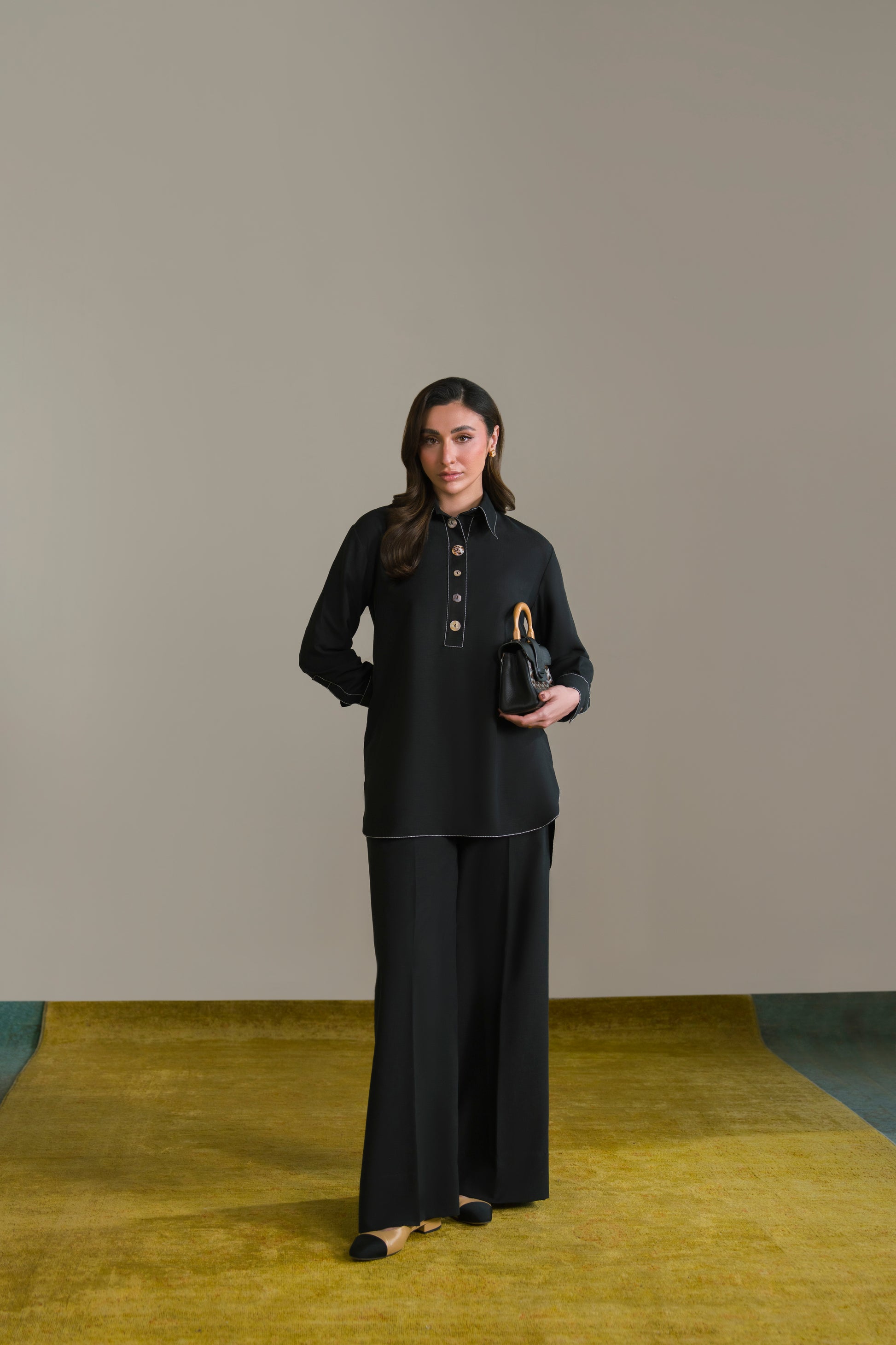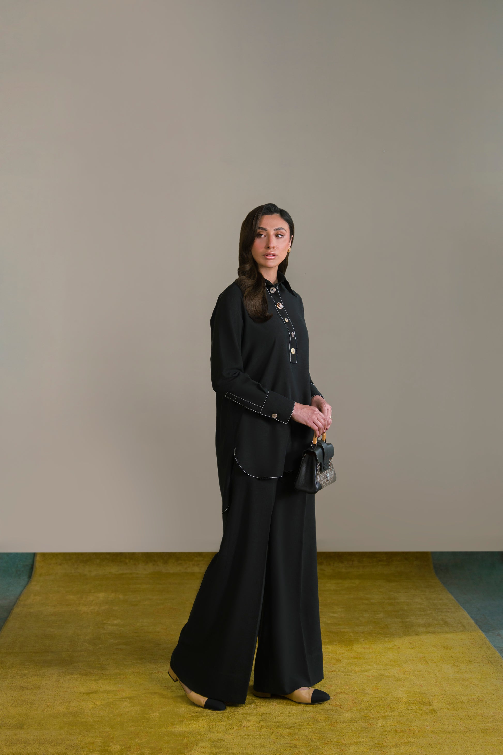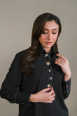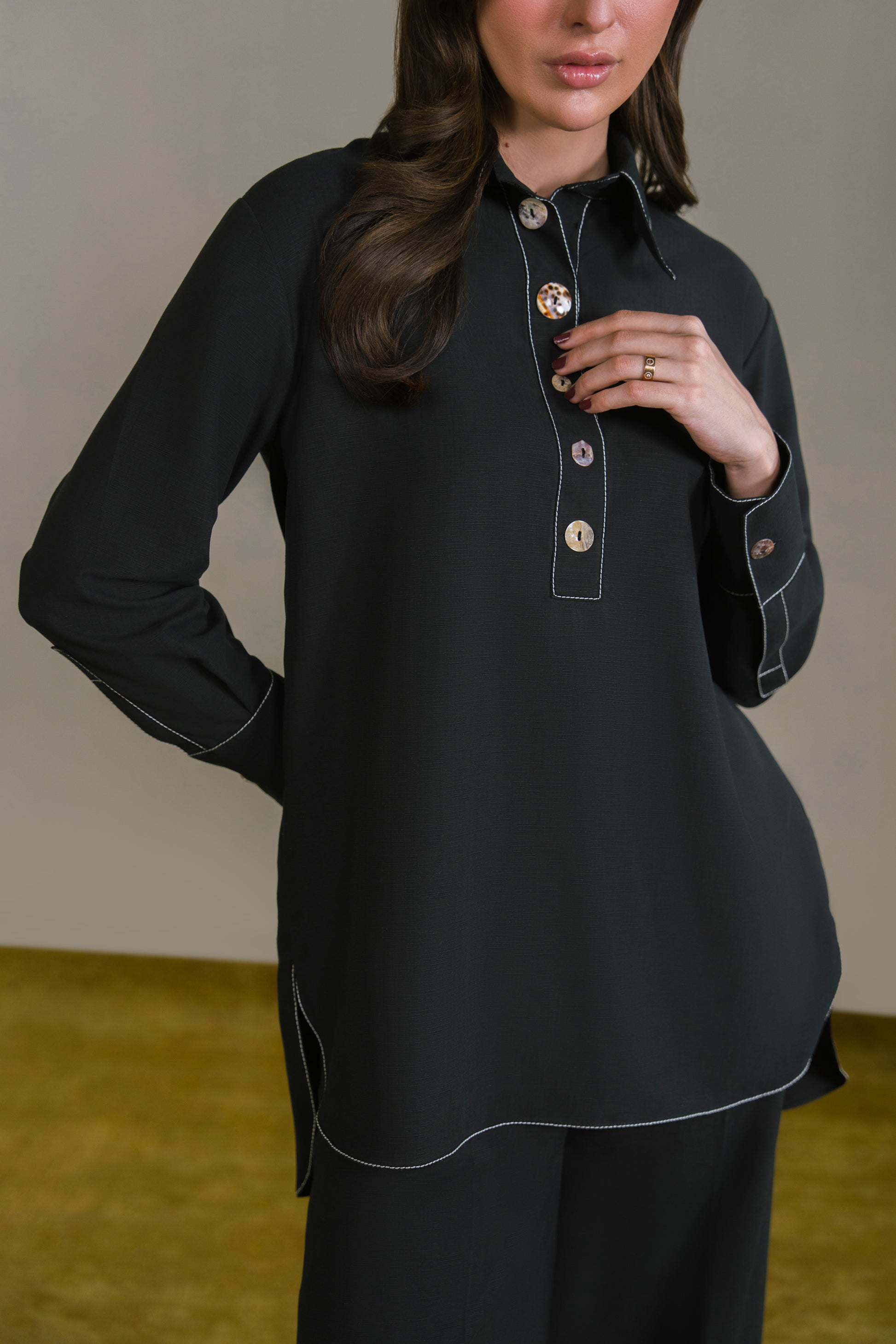 Crafted in smooth winter luxe fabric, this Charcoal Noir co-ord set blends comfort, structure, and understated modern elegance. The shirt features contrast stitching and a distinctive button placket that adds subtle character while keeping the silhouette refined. Paired with wide-leg culottes in matching winter luxe, the ensemble achieves a sleek, polished look ideal for elevated everyday wear.
