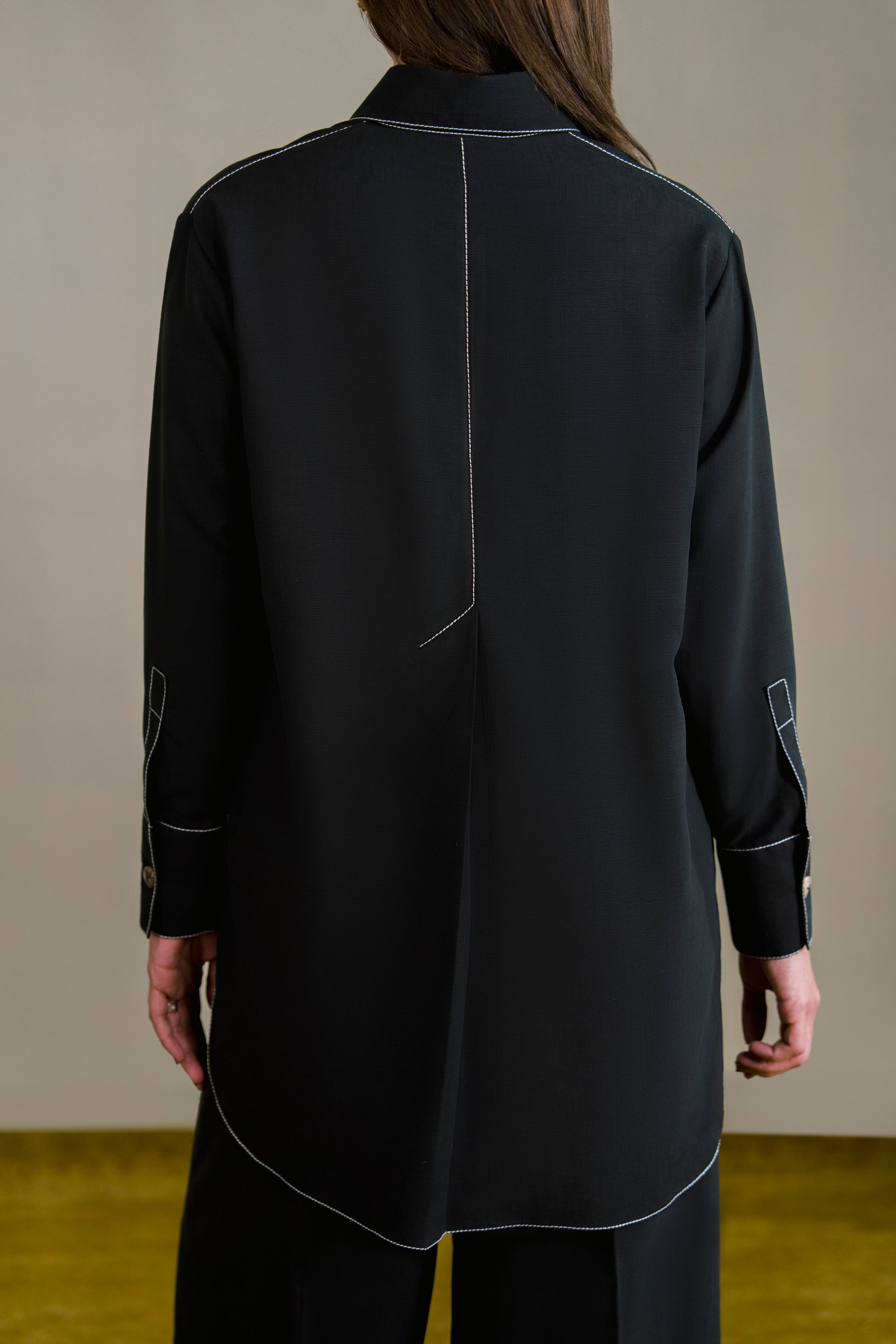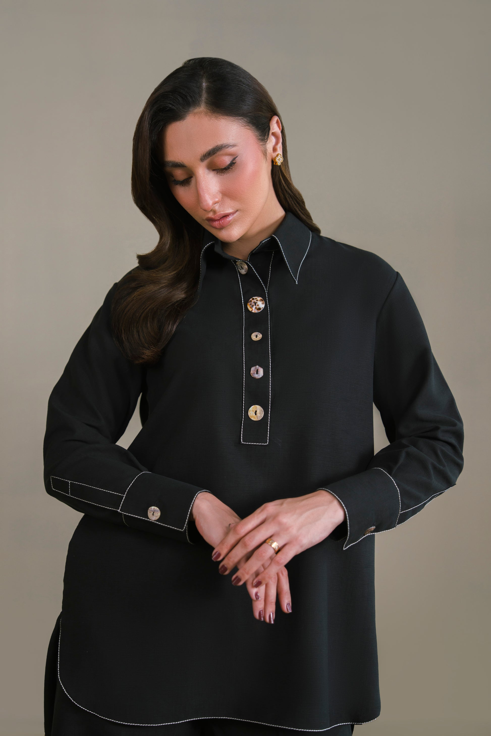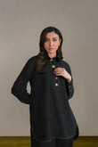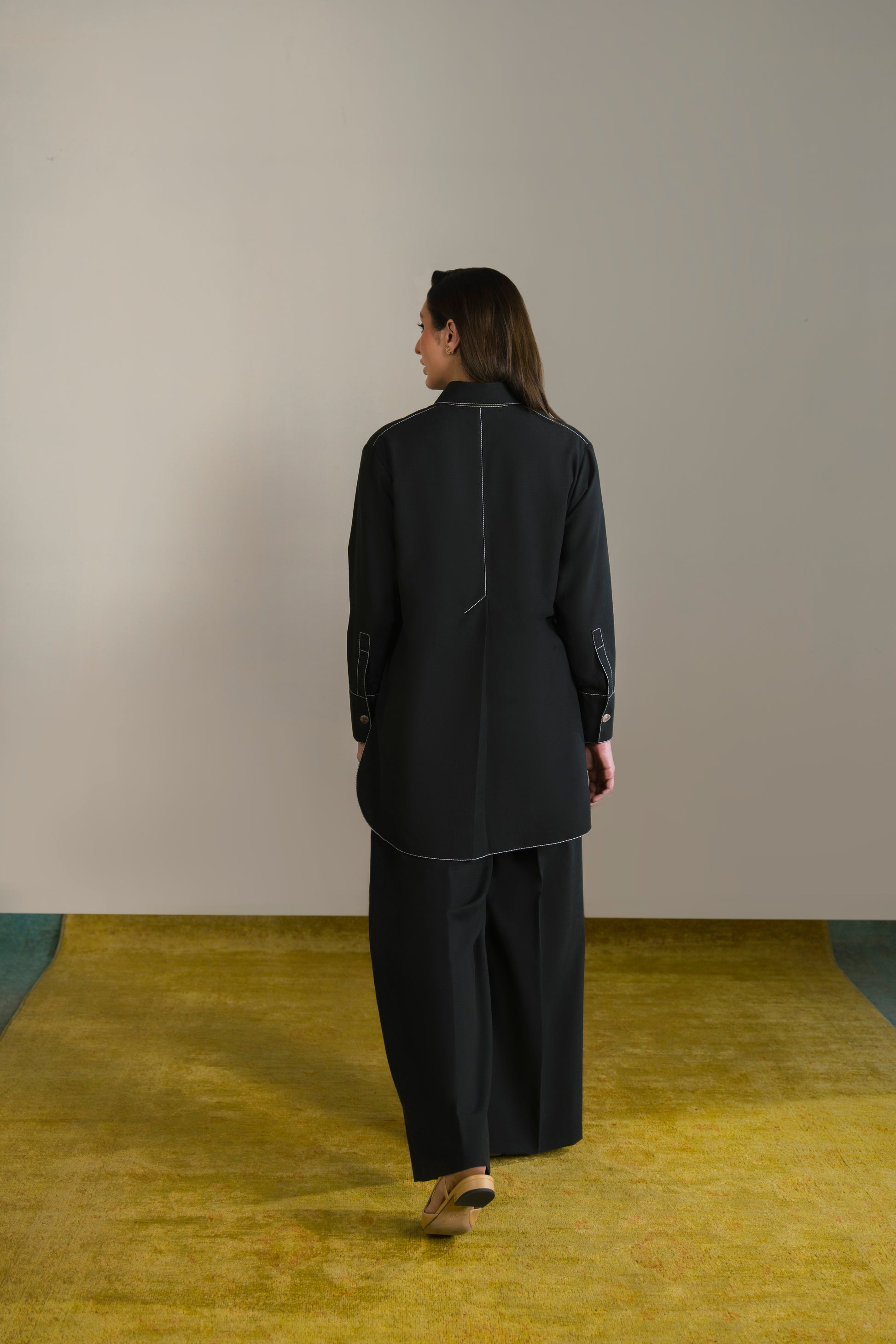Crafted in smooth winter luxe fabric, this Charcoal Noir co-ord set blends comfort, structure, and understated modern elegance. The shirt features contrast stitching and a distinctive button placket that adds subtle character while keeping the silhouette refined. Paired with wide-leg culottes in matching winter luxe, the ensemble achieves a sleek, polished look ideal for elevated everyday wear.