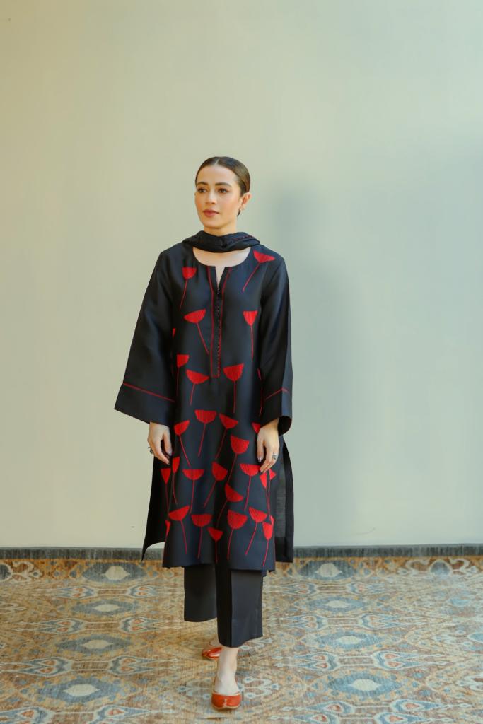 Crafted from cotton-net, it features hand embroided motifs on the shirt. Style yours with straight pants.