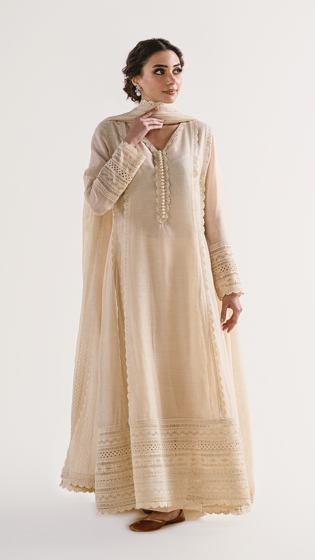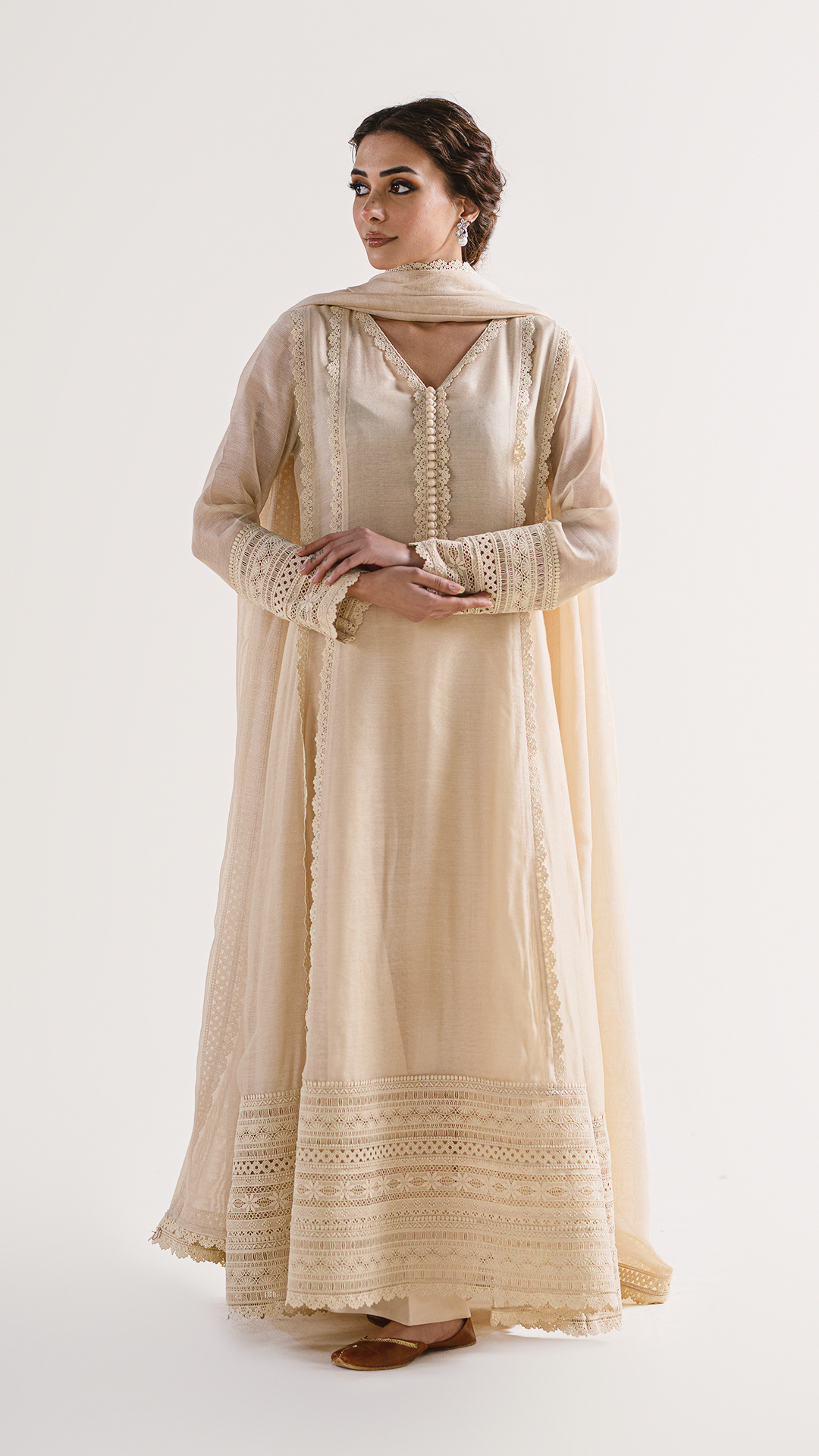 Discover "Opal Grace" an embodiment of sophistication with its delicate lace accents on a gentle beige cotton net fabric, tailored to complement the contemporary style of fashion-forward women. Paired with a coordinating cotton net dupatta, this refined ensemble is ideal for your special occasions.