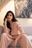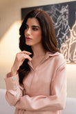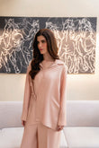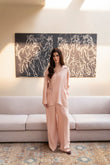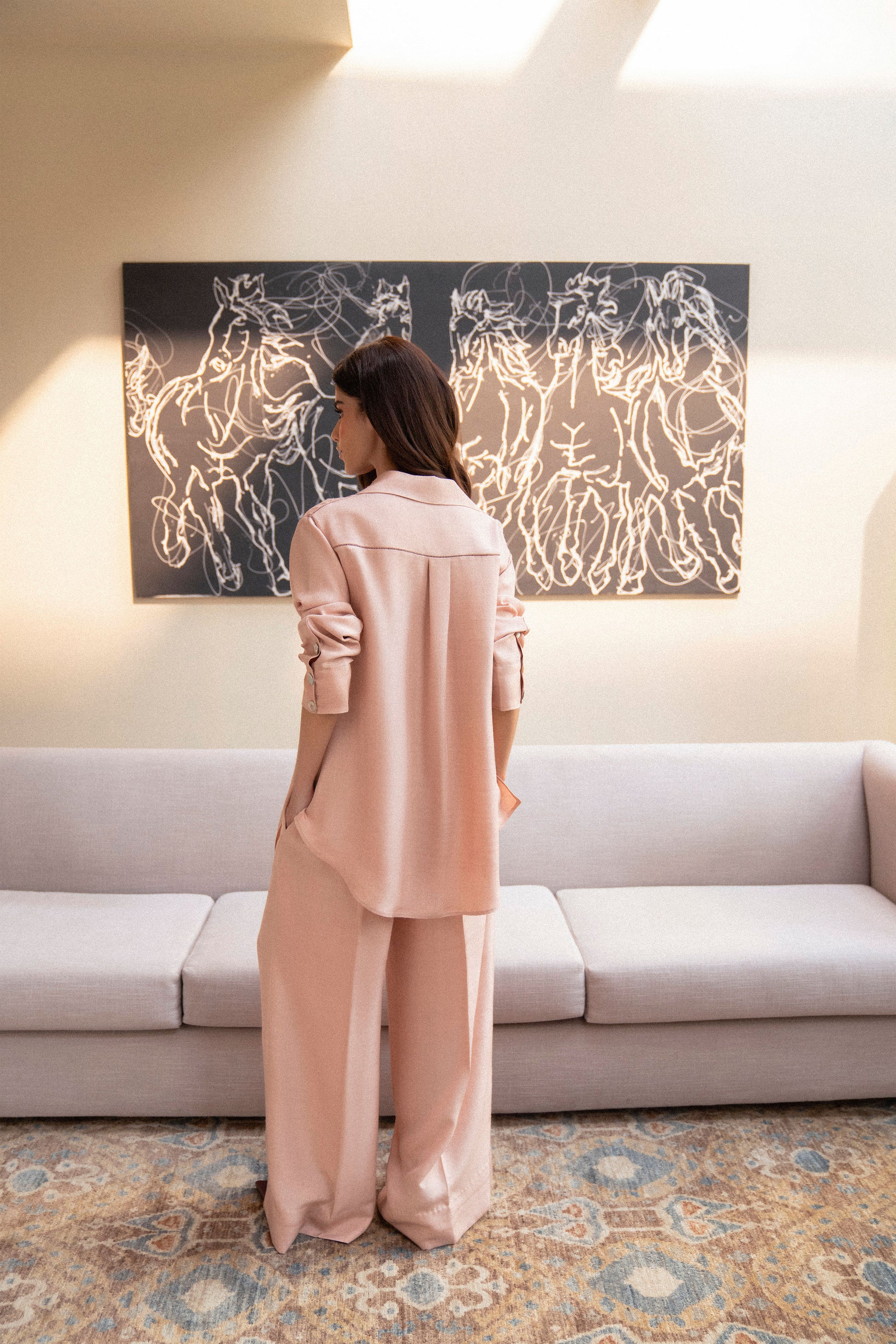 This two-piece set in soft blush pink is crafted from soft seasonal silk. The kimono-style shirt flows seamlessly, creating a silhouette that pairs beautifully with wide-leg pants making it a classic staple.