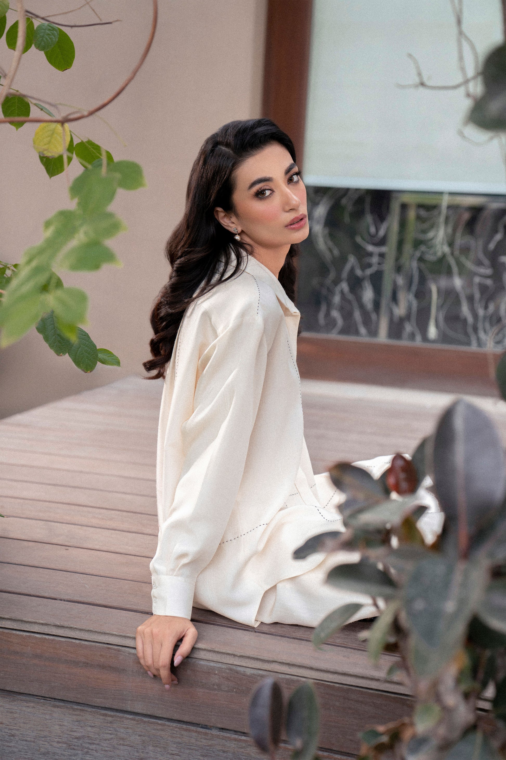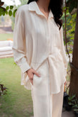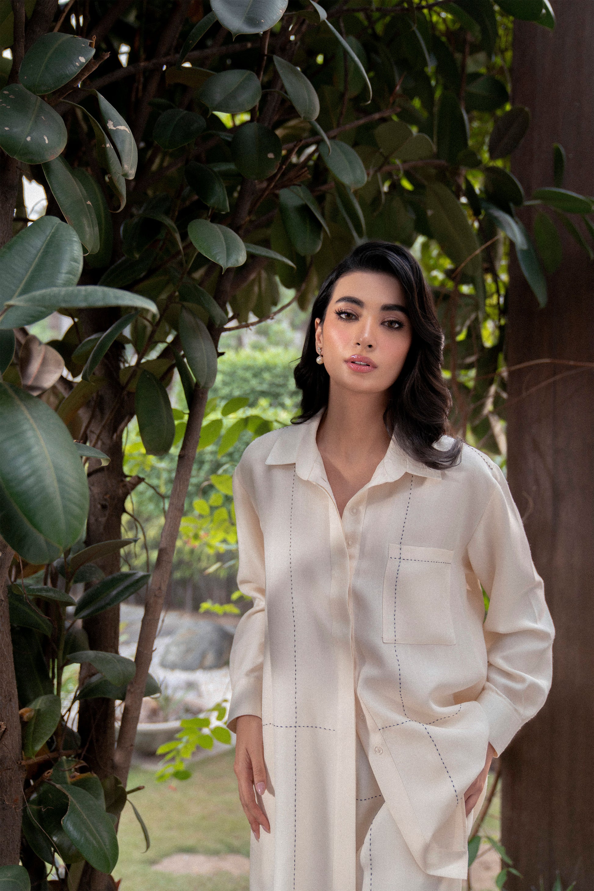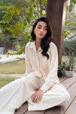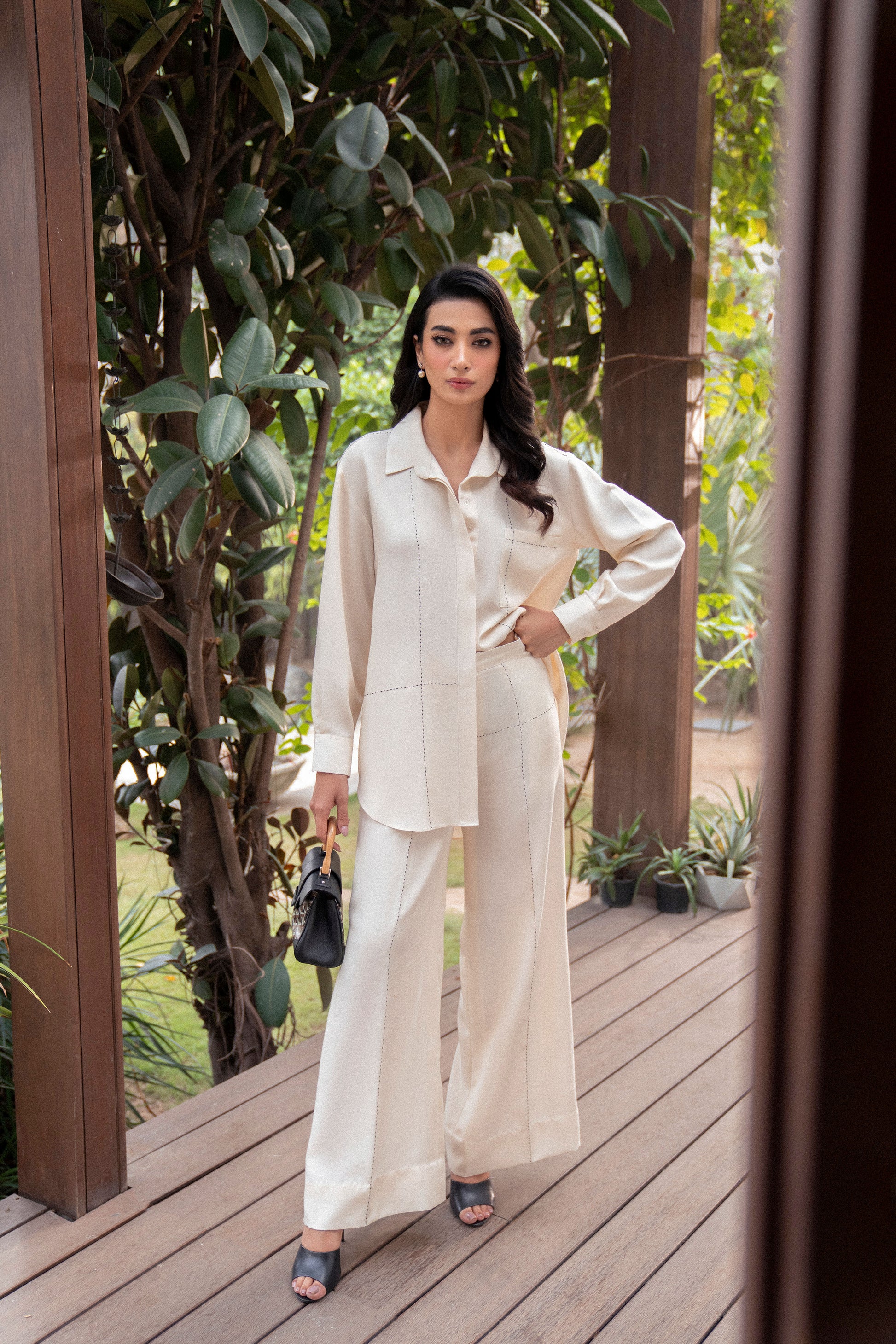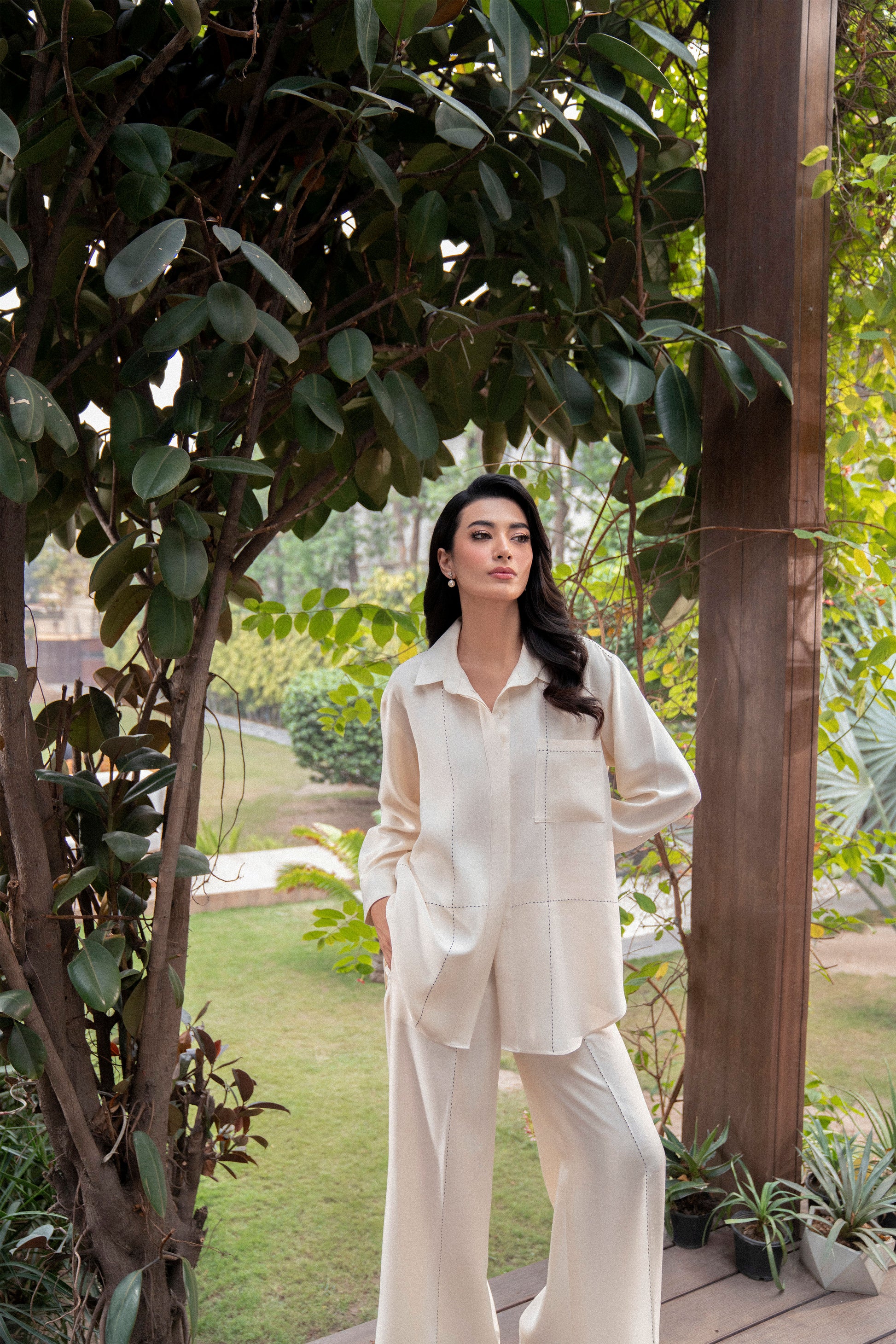 This ivory two-piece set in seasonal silk is simple yet effortlessly chic. With a tailored shirt and matching pants, the ensemble features delicate running stitch details for a touch of subtle artistry.